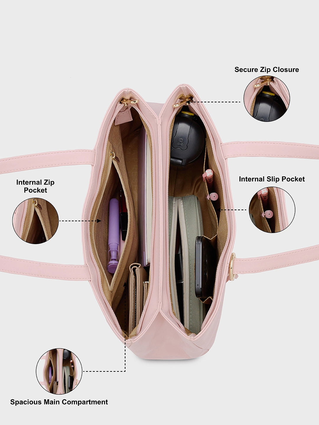 The internal zip pocket helps organize all your essentials for office and daily use. Whether you need a reliable office bag or a functional college bag, this handbag for women ensures your items are neatly stored and easily accessible. A must-have for women on the go, combining convenience with elegance.