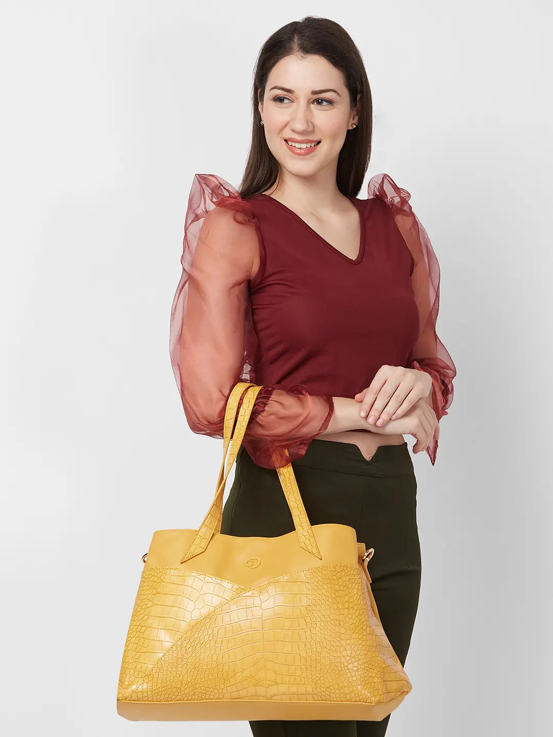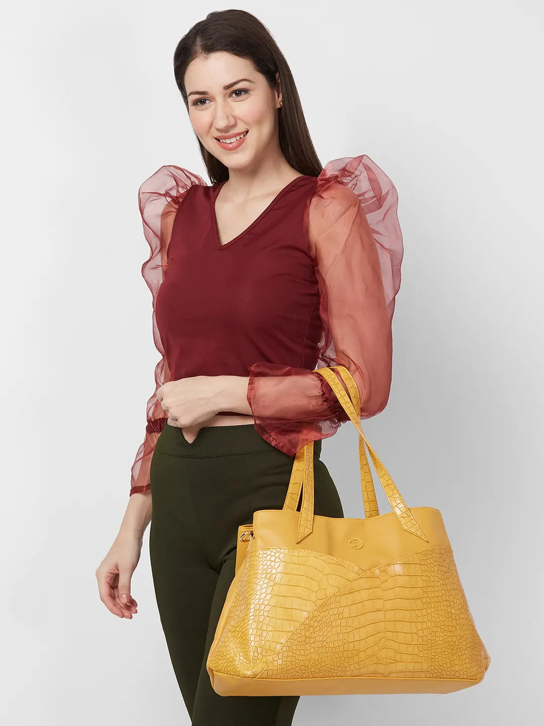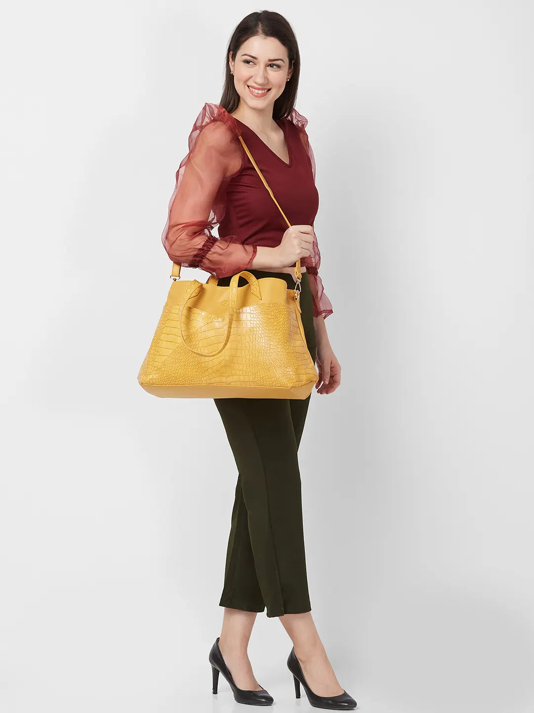 Our bag is made of Faux leather with spacious interior and organized pocket inside to carry essentials