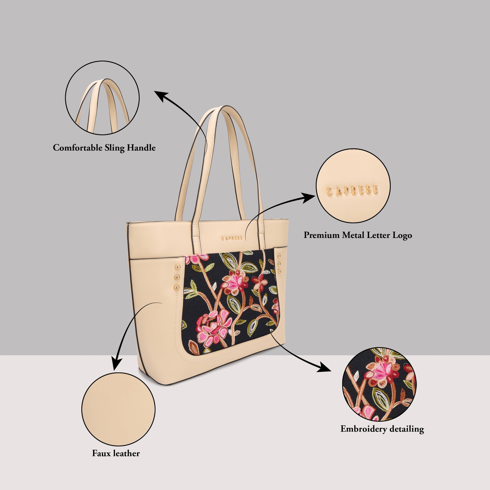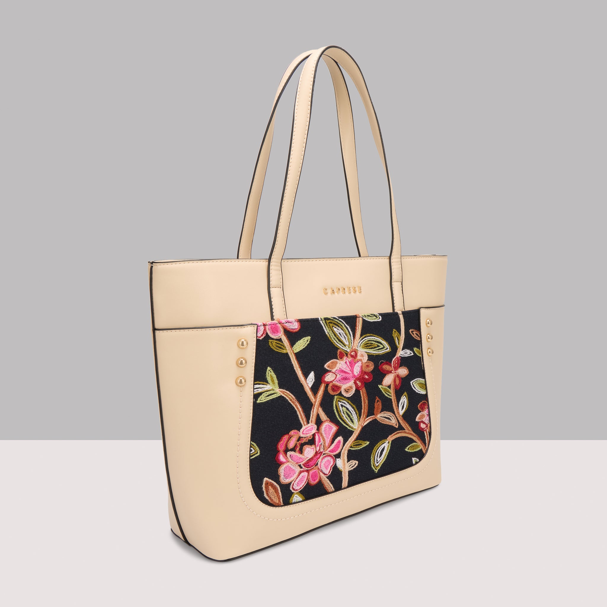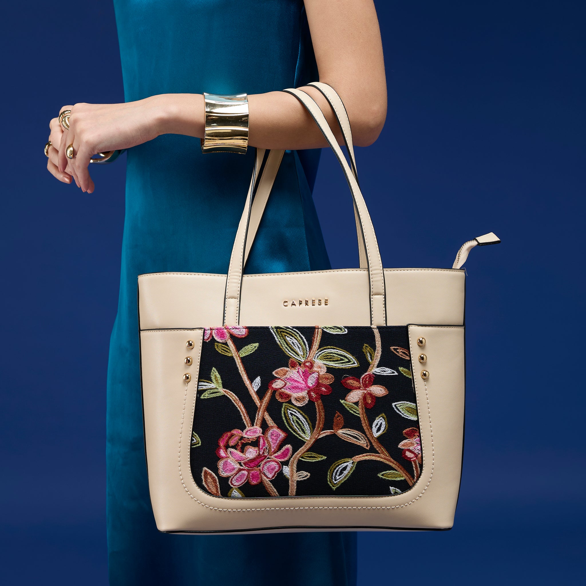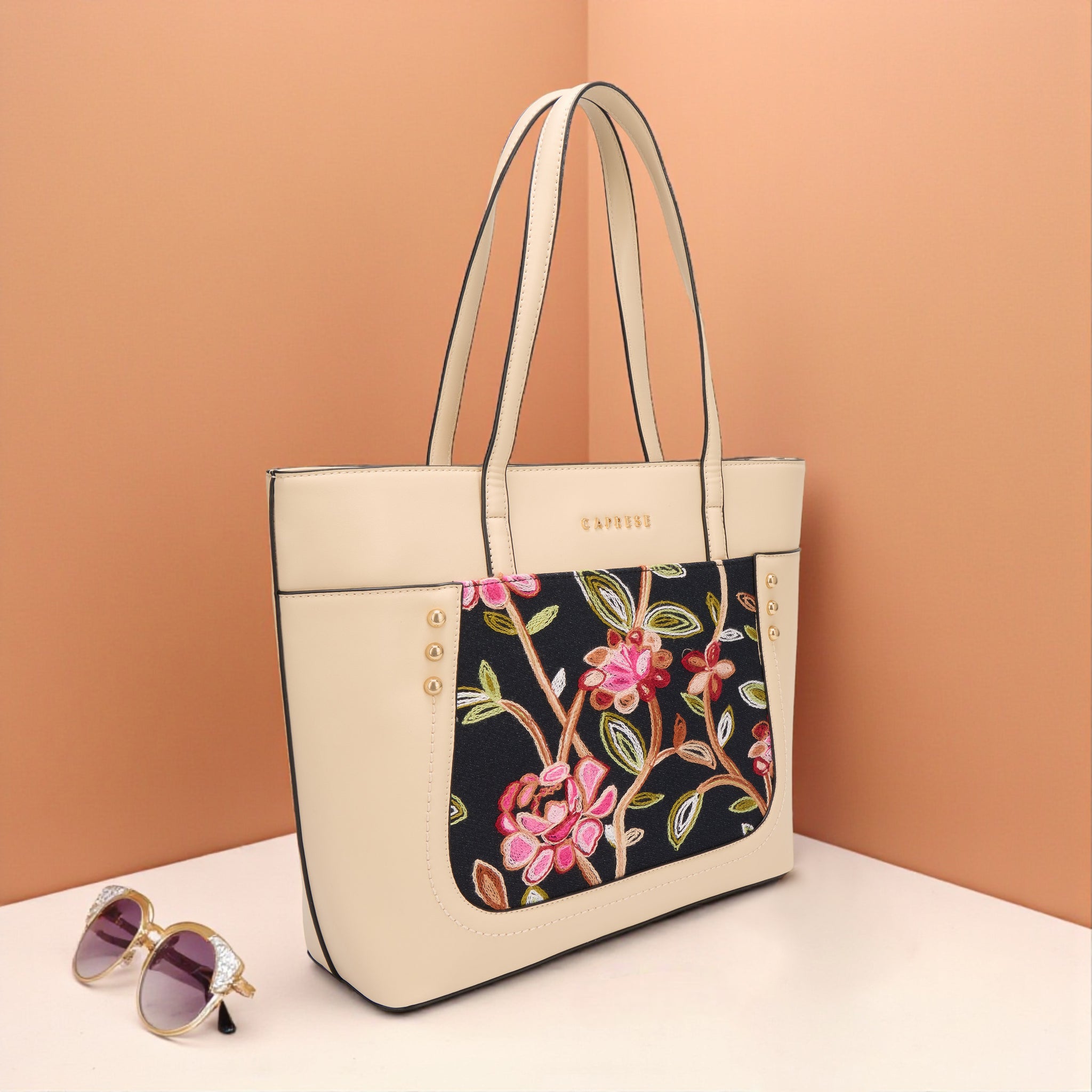 Make a chic statement with the Caprese Elsa Large Tote Bag, the perfect spacious accessory for your professional and travel needs. This stunning tote combines a classic solid color panel with sophisticated, intricate embroidery, providing a unique designer look. Crafted from premium faux leather, the bag delivers a luxurious feel while being completely cruelty-free and durable for daily commuting.
