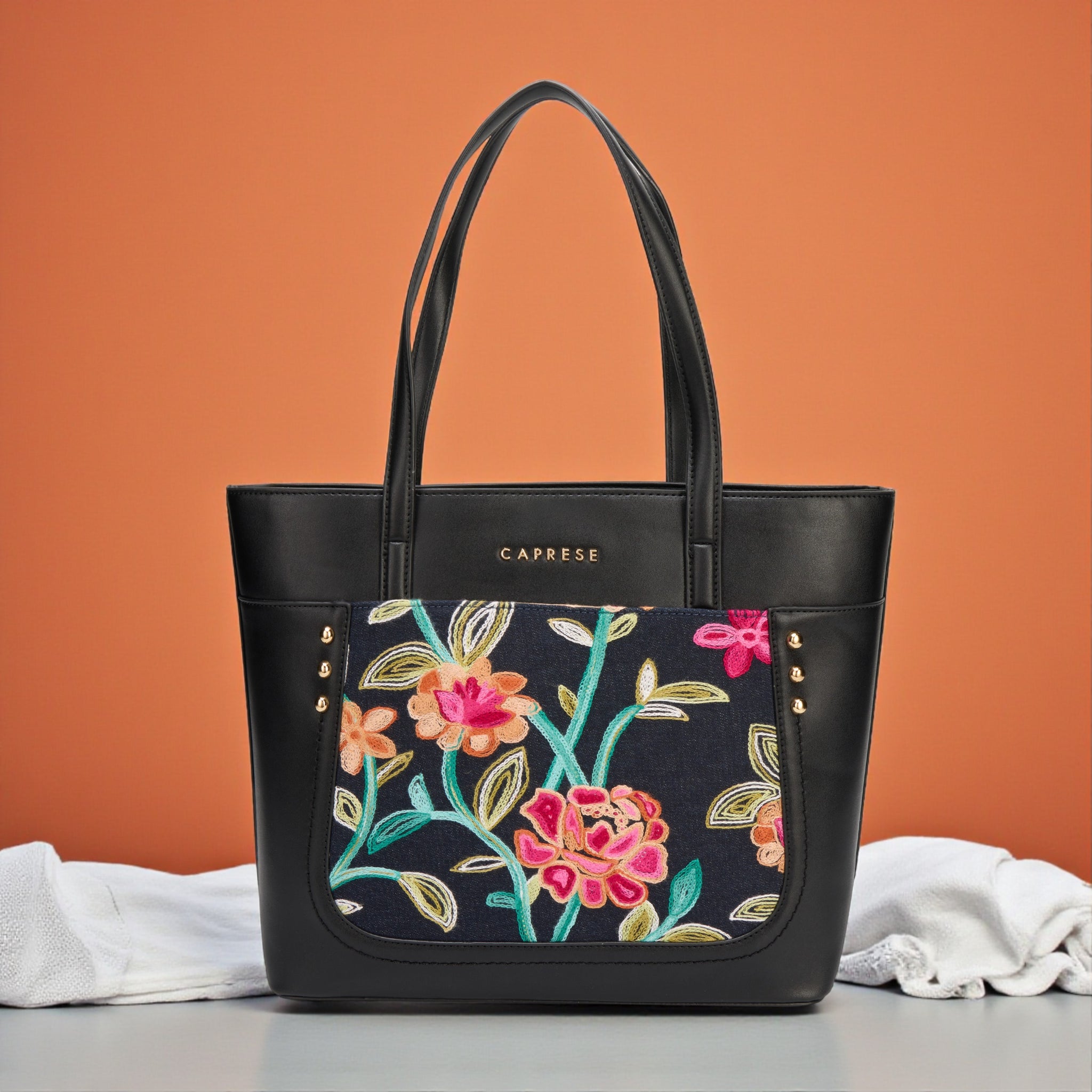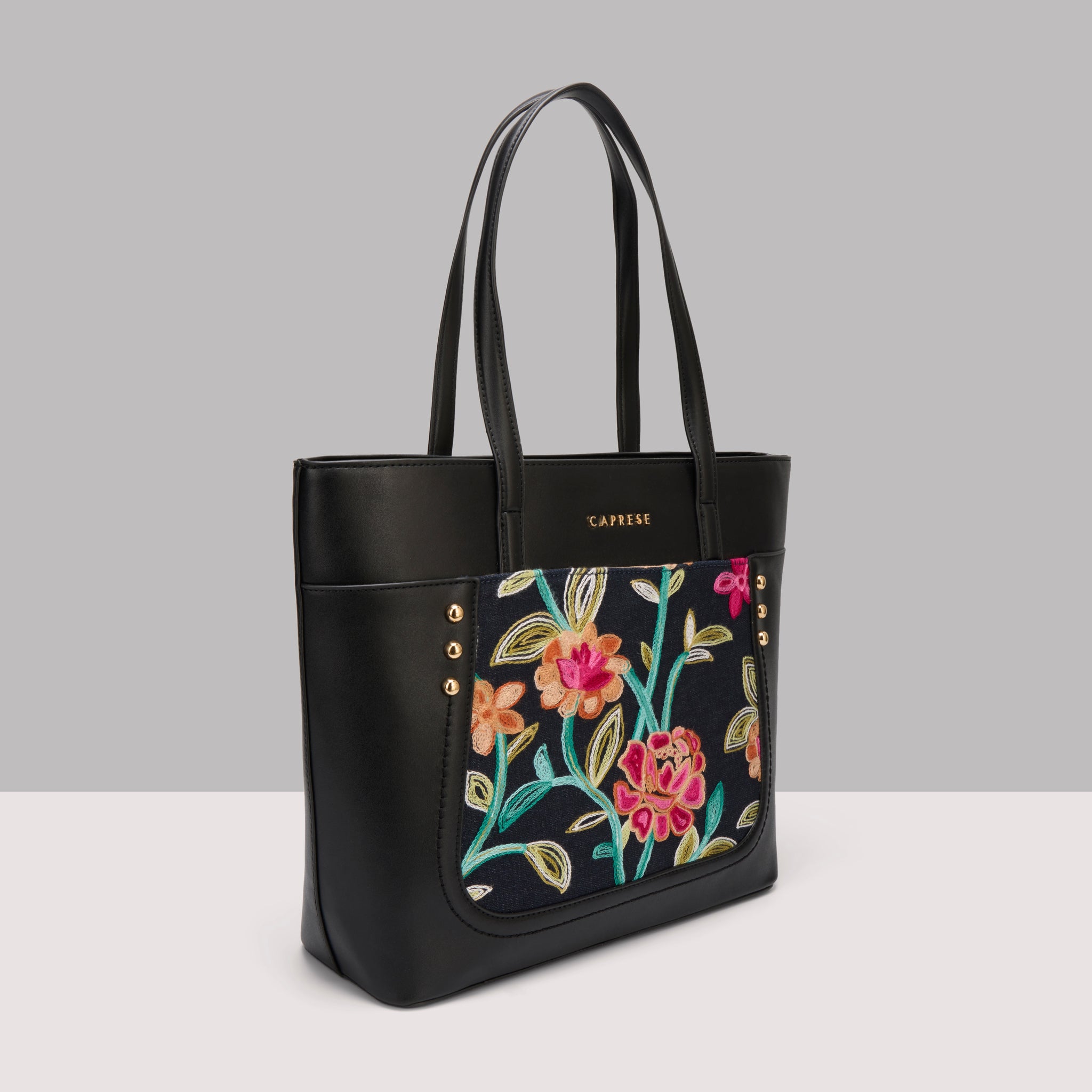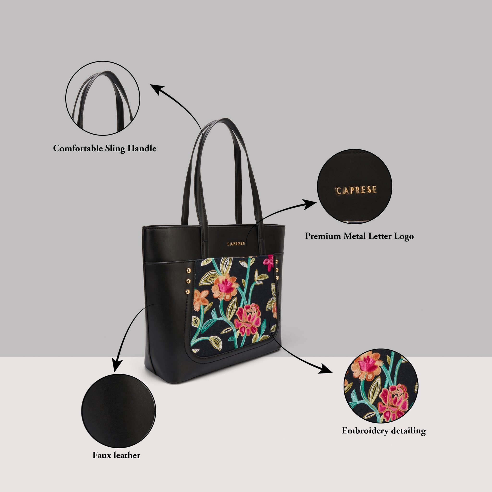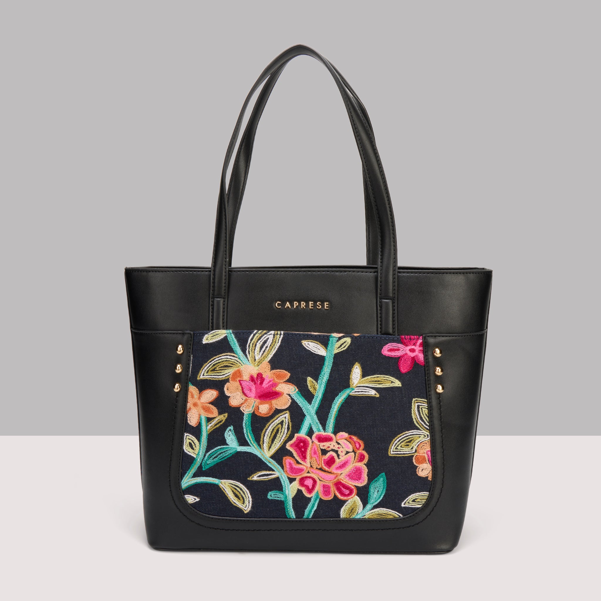 Make a chic statement with the Caprese Elsa Large Tote Bag, the perfect spacious accessory for your professional and travel needs. This stunning tote combines a classic solid color panel with sophisticated, intricate embroidery, providing a unique designer look. Crafted from premium faux leather, the bag delivers a luxurious feel while being completely cruelty-free and durable for daily commuting.