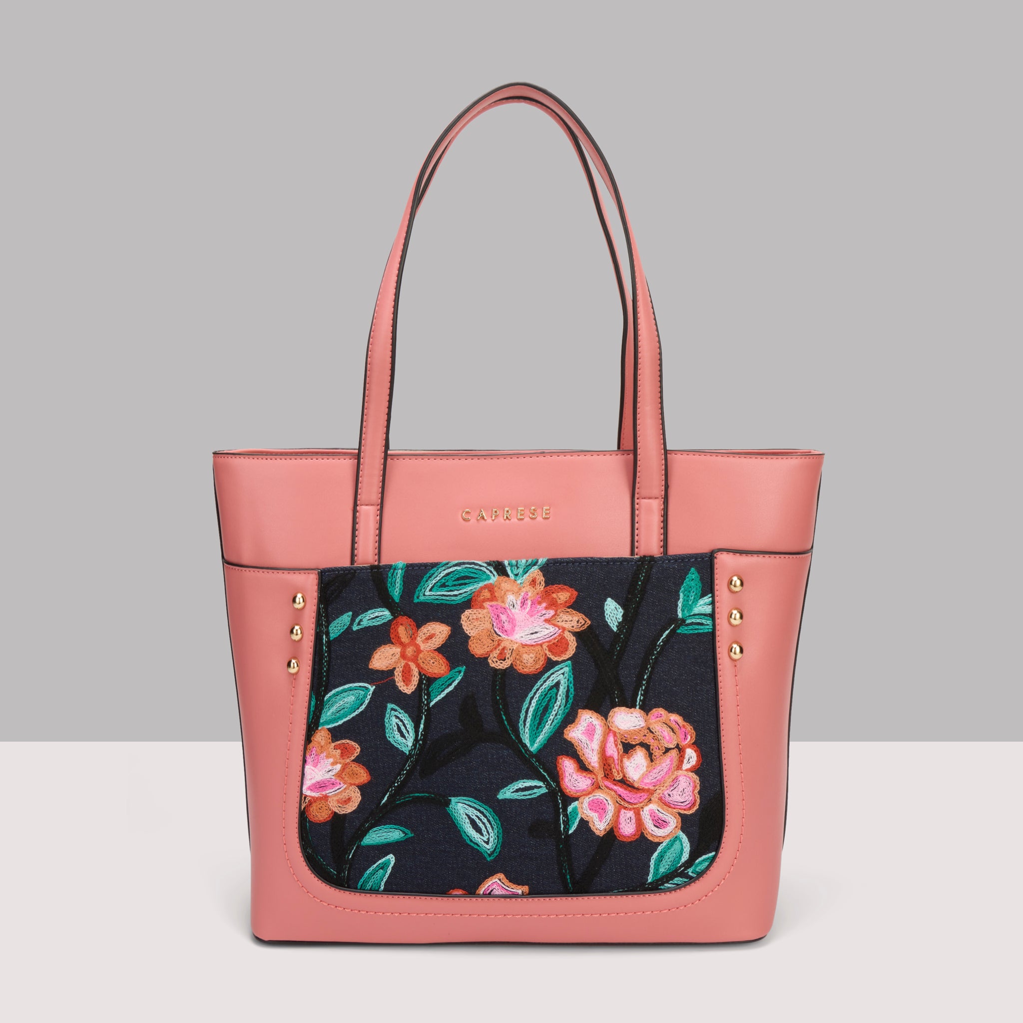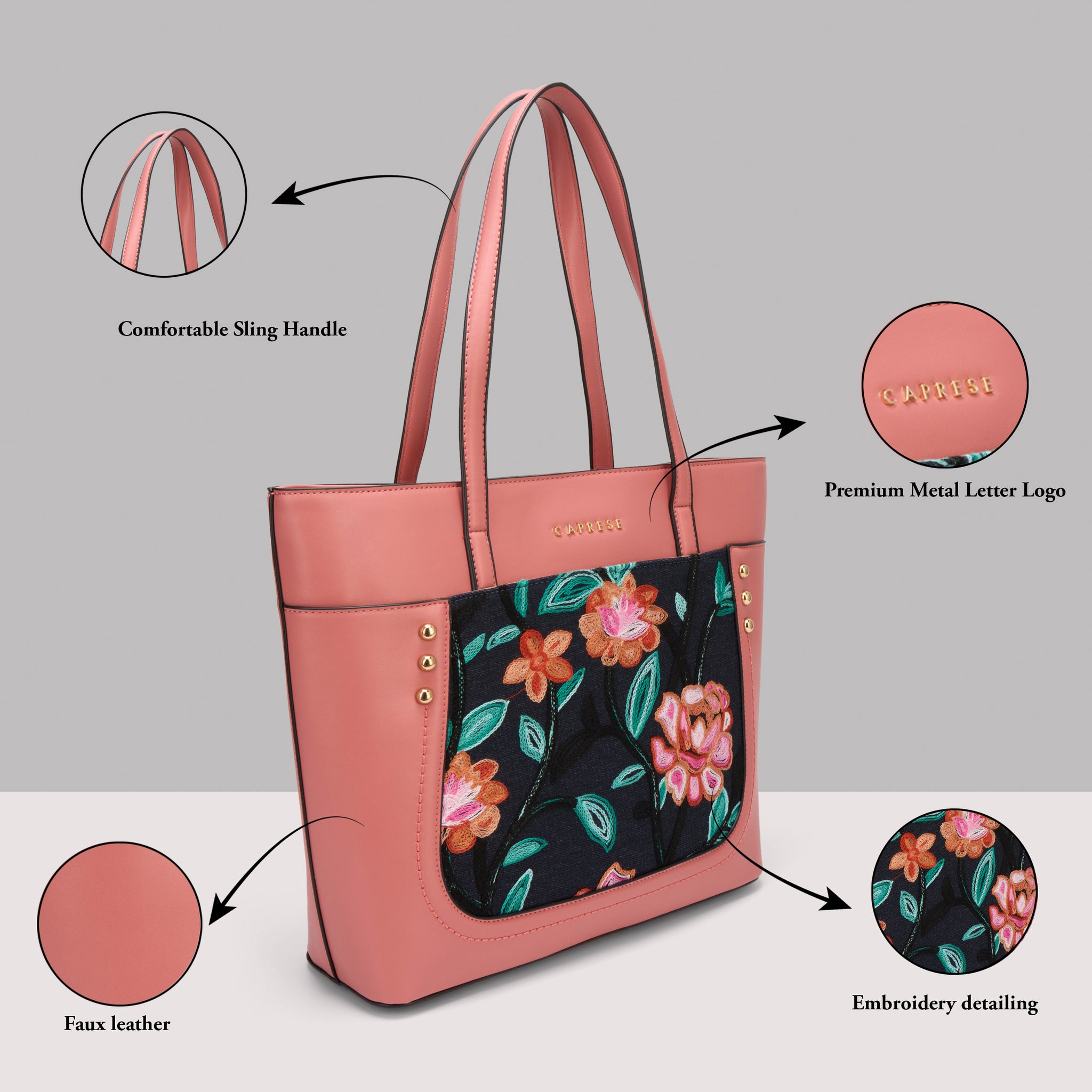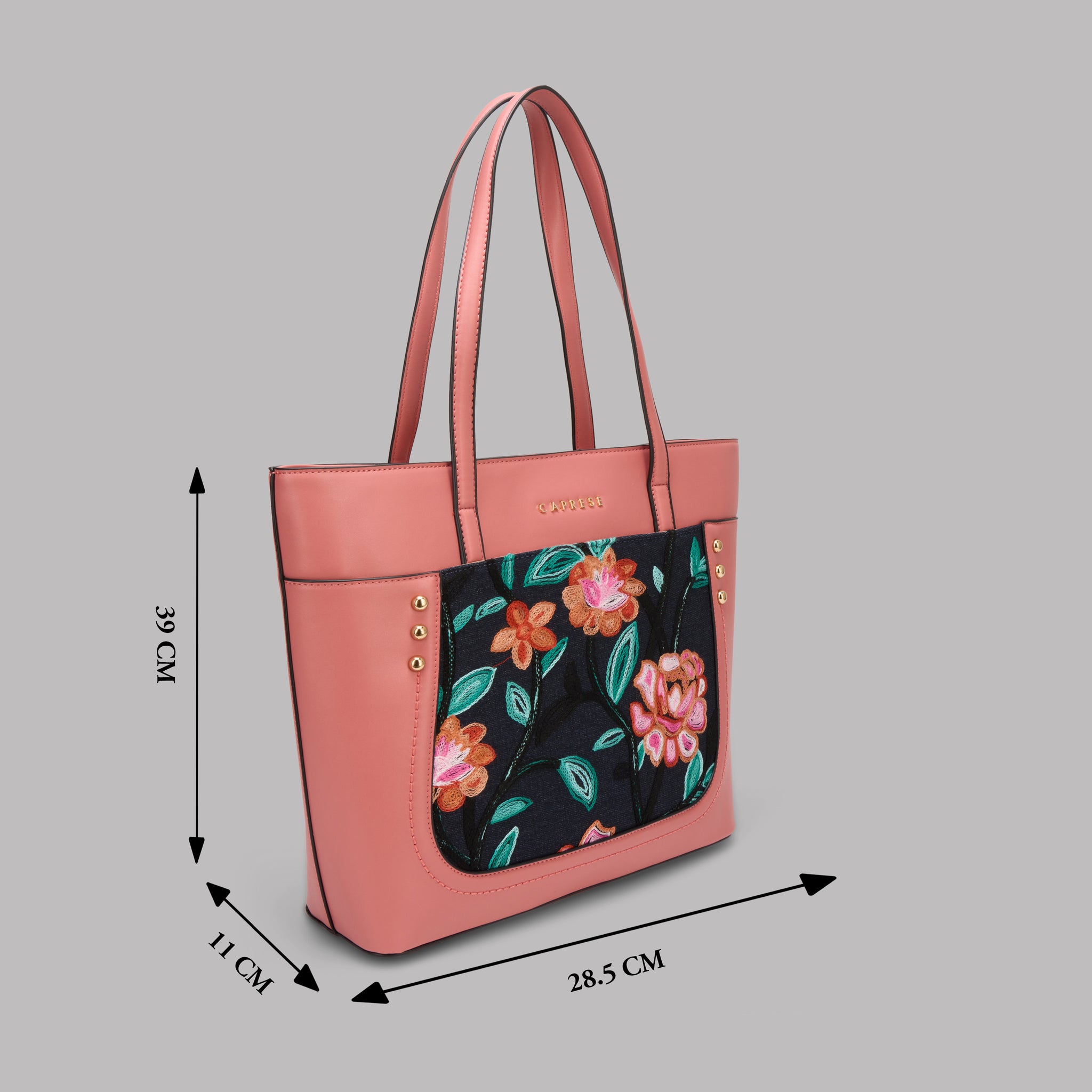 Make a chic statement with the Caprese Elsa Large Tote Bag, the perfect spacious accessory for your professional and travel needs. This stunning tote combines a classic solid color panel with sophisticated, intricate embroidery, providing a unique designer look. Crafted from premium faux leather, the bag delivers a luxurious feel while being completely cruelty-free and durable for daily commuting.