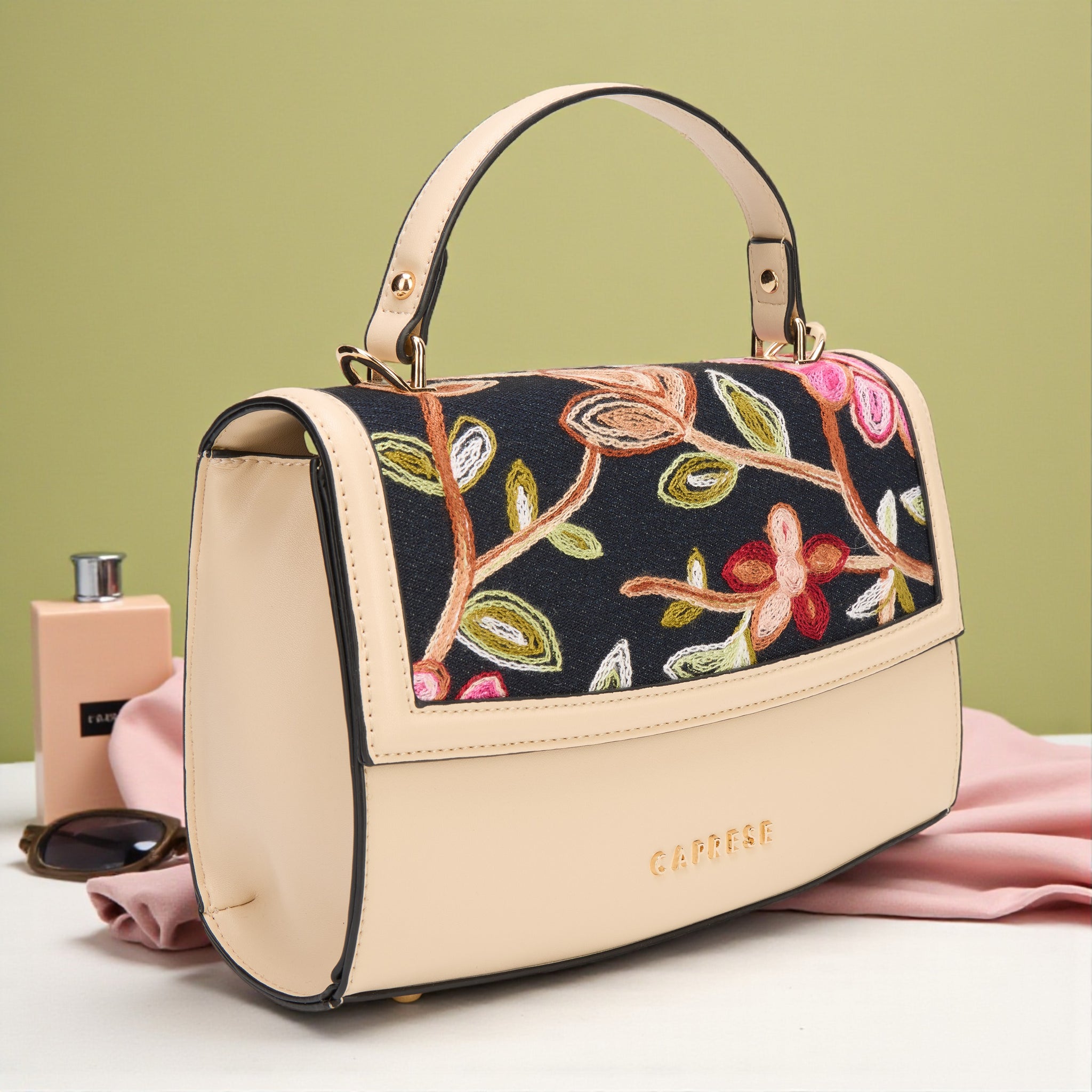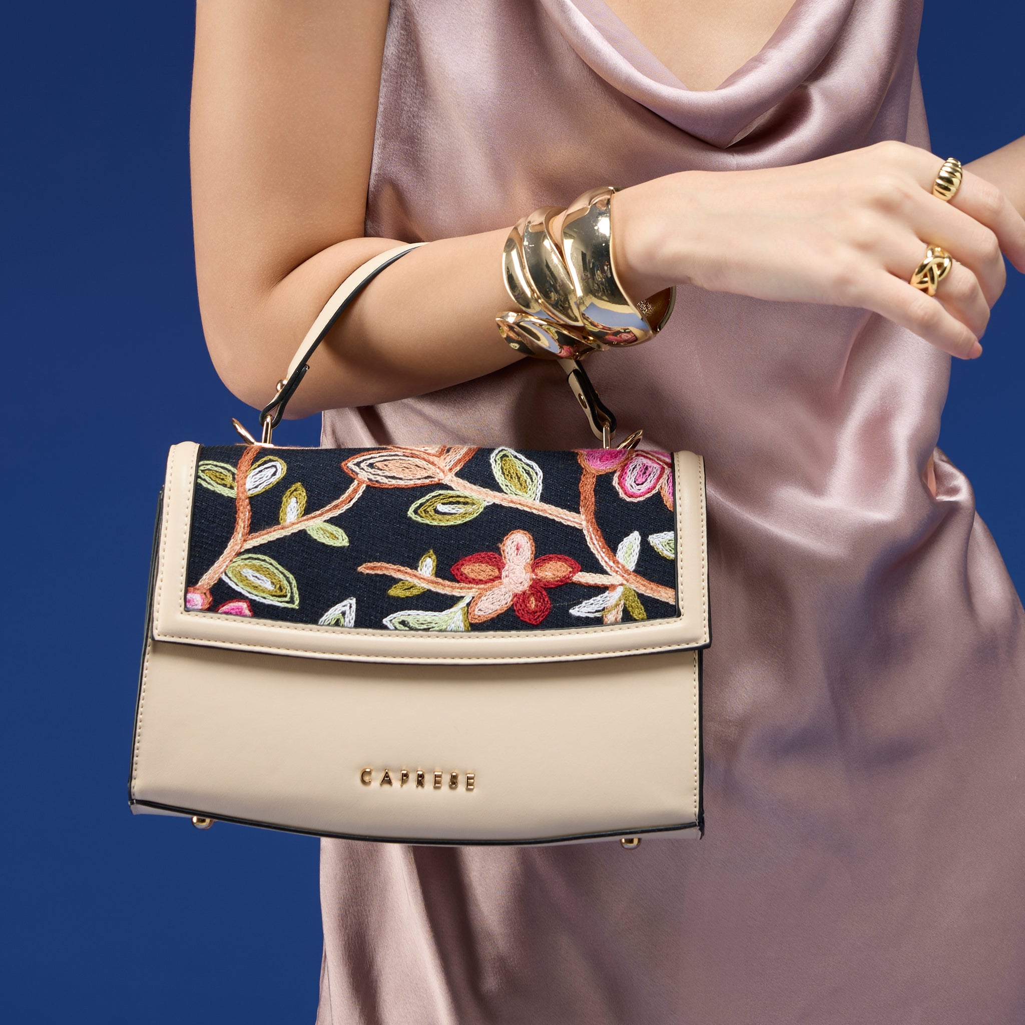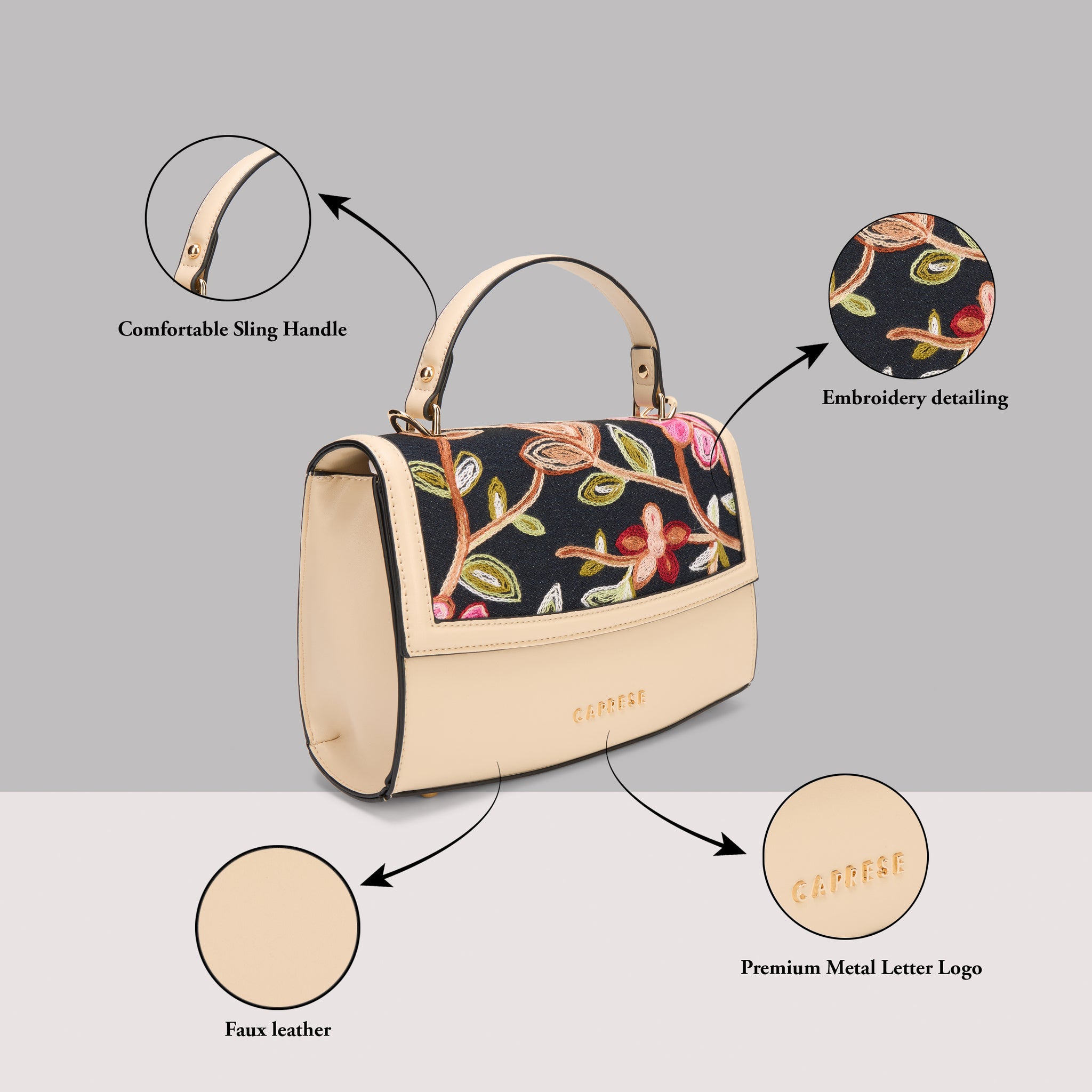 Step out in style with the Caprese Elsa Medium Sling Bag, the perfect hands-free accessory for your daily adventures. This sling combines a stylish solid background with intricate, designer embroidery detail, giving you a unique and fashionable look. Crafted from premium faux leather, the bag offers a luxurious, cruelty-free finish that is durable for everyday use.