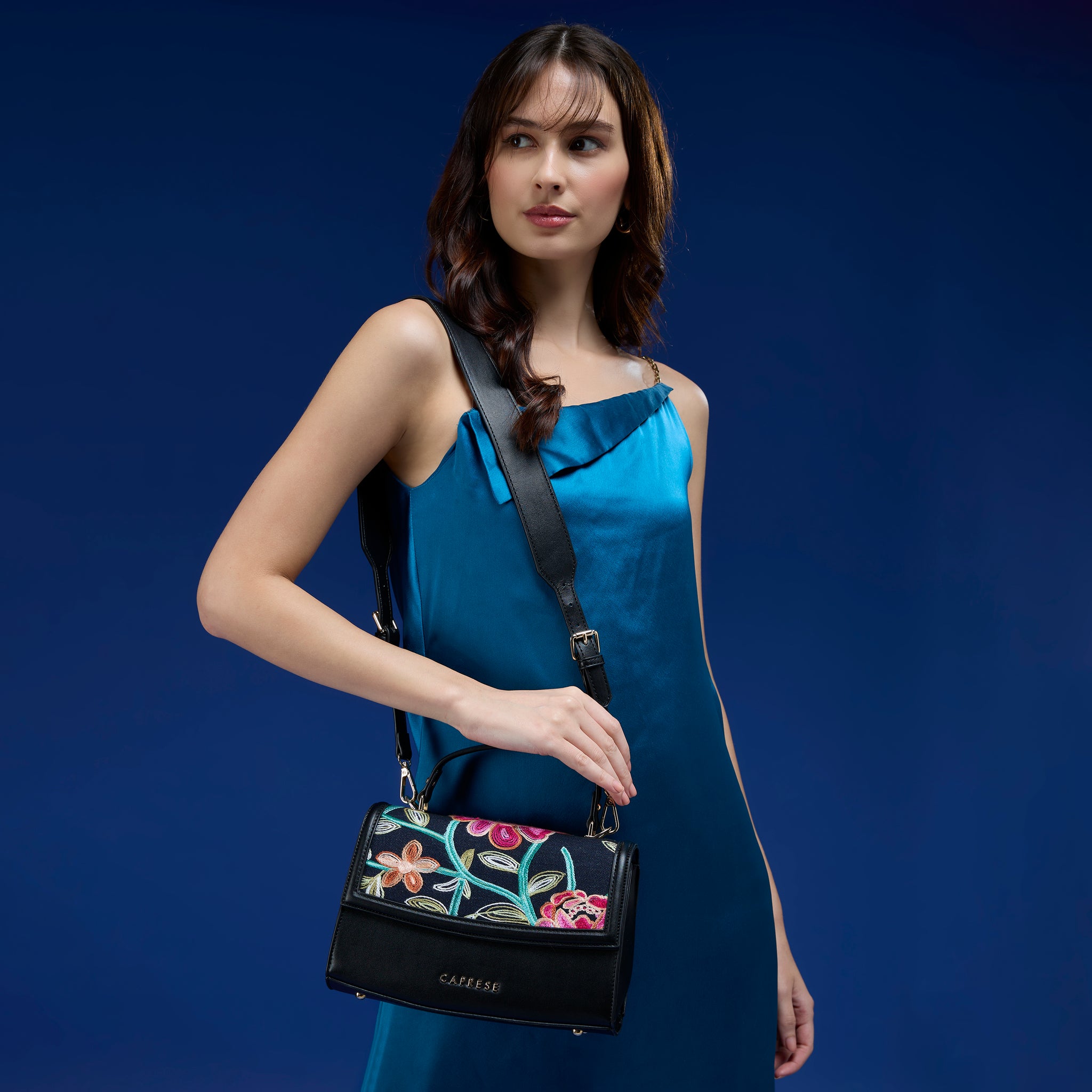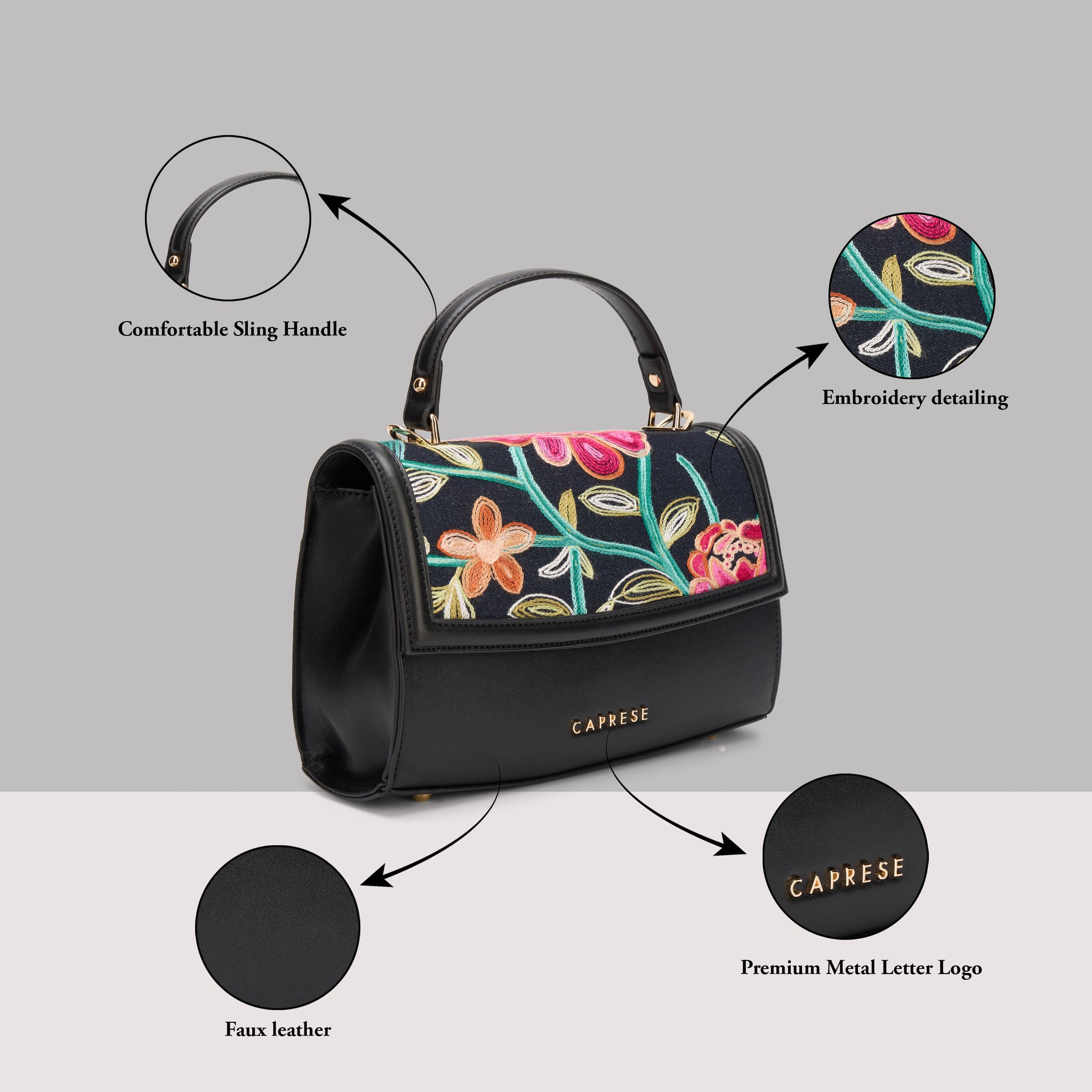 Step out in style with the Caprese Elsa Medium Sling Bag, the perfect hands-free accessory for your daily adventures. This sling combines a stylish solid background with intricate, designer embroidery detail, giving you a unique and fashionable look. Crafted from premium faux leather, the bag offers a luxurious, cruelty-free finish that is durable for everyday use.