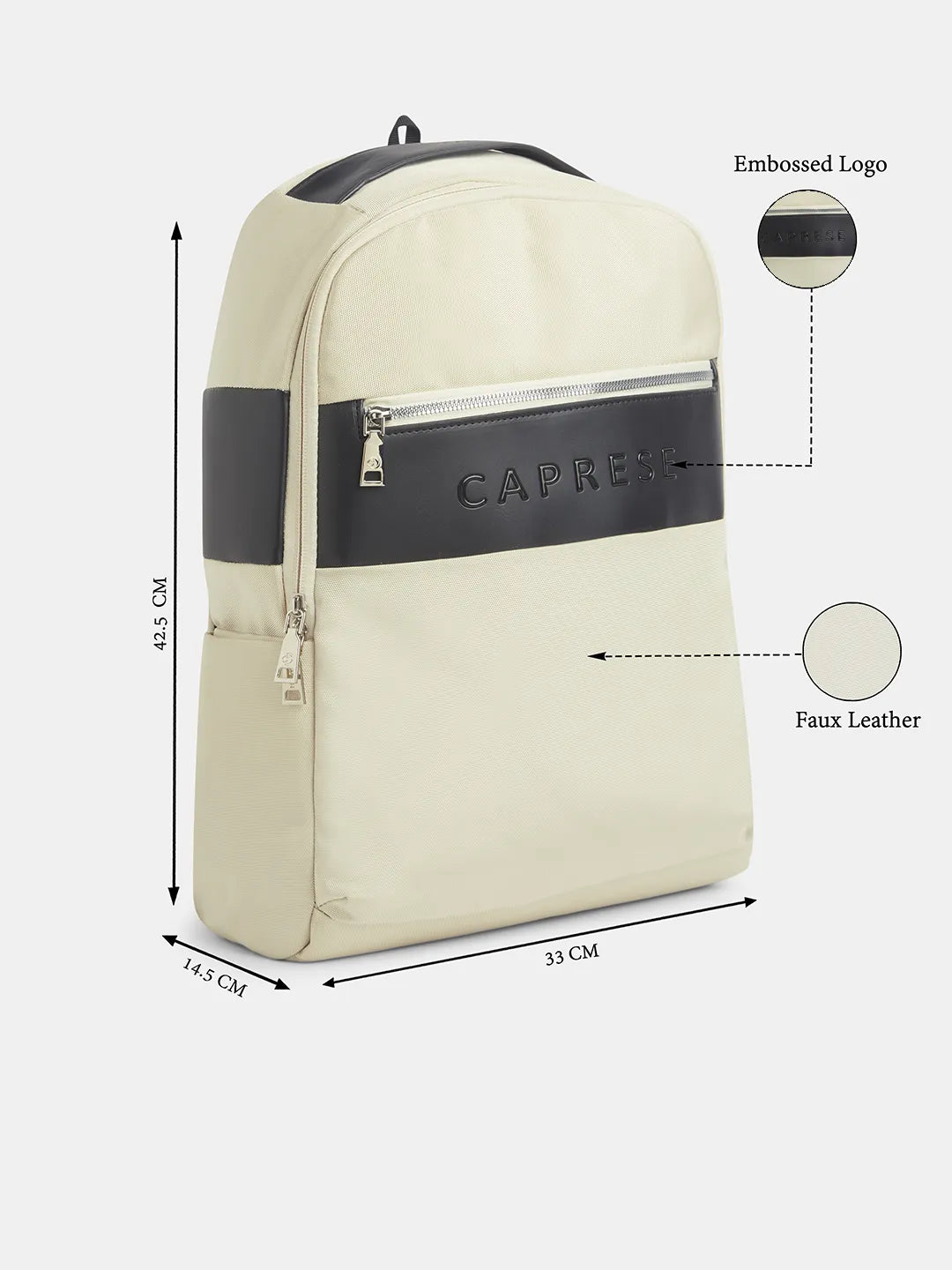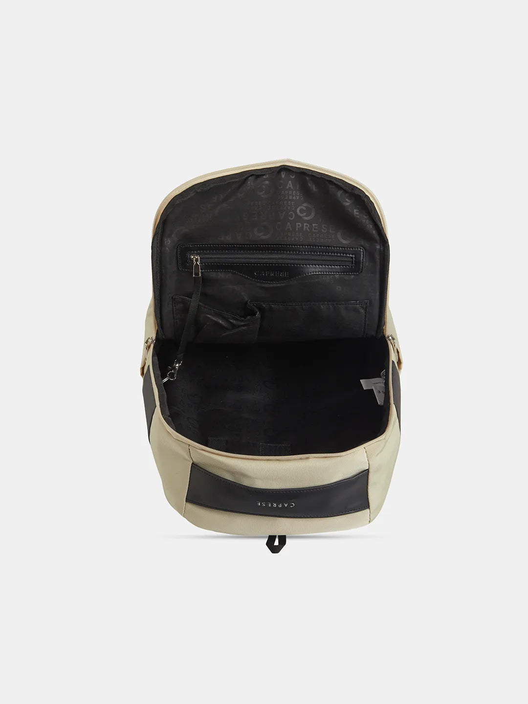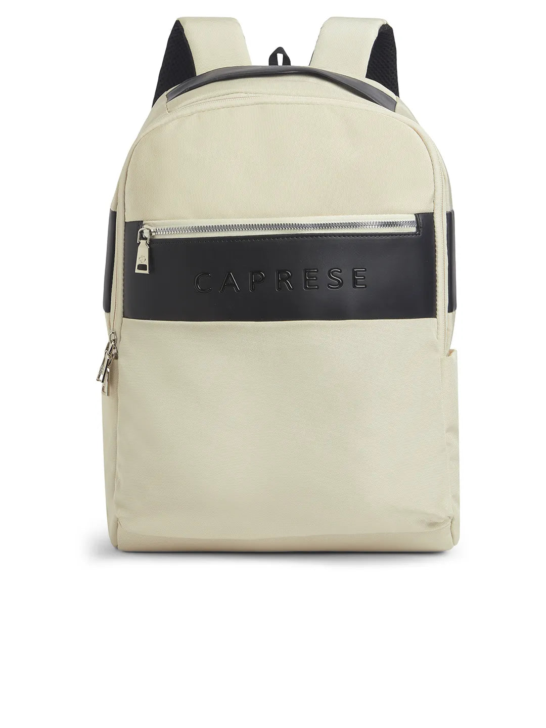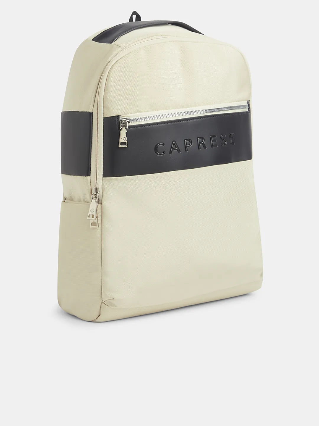 Combine sleek design with ultimate functionality with the Caprese Jupiter Laptop Backpack Large. This sophisticated bag is a perfect choice for the modern professional or student who demands both style and practicality. It features a striking color block design, with a classic beige body beautifully contrasted by a bold black horizontal stripe. A prominent "CAPRESE" logo is debossed on the black stripe, adding a touch of refined elegance.