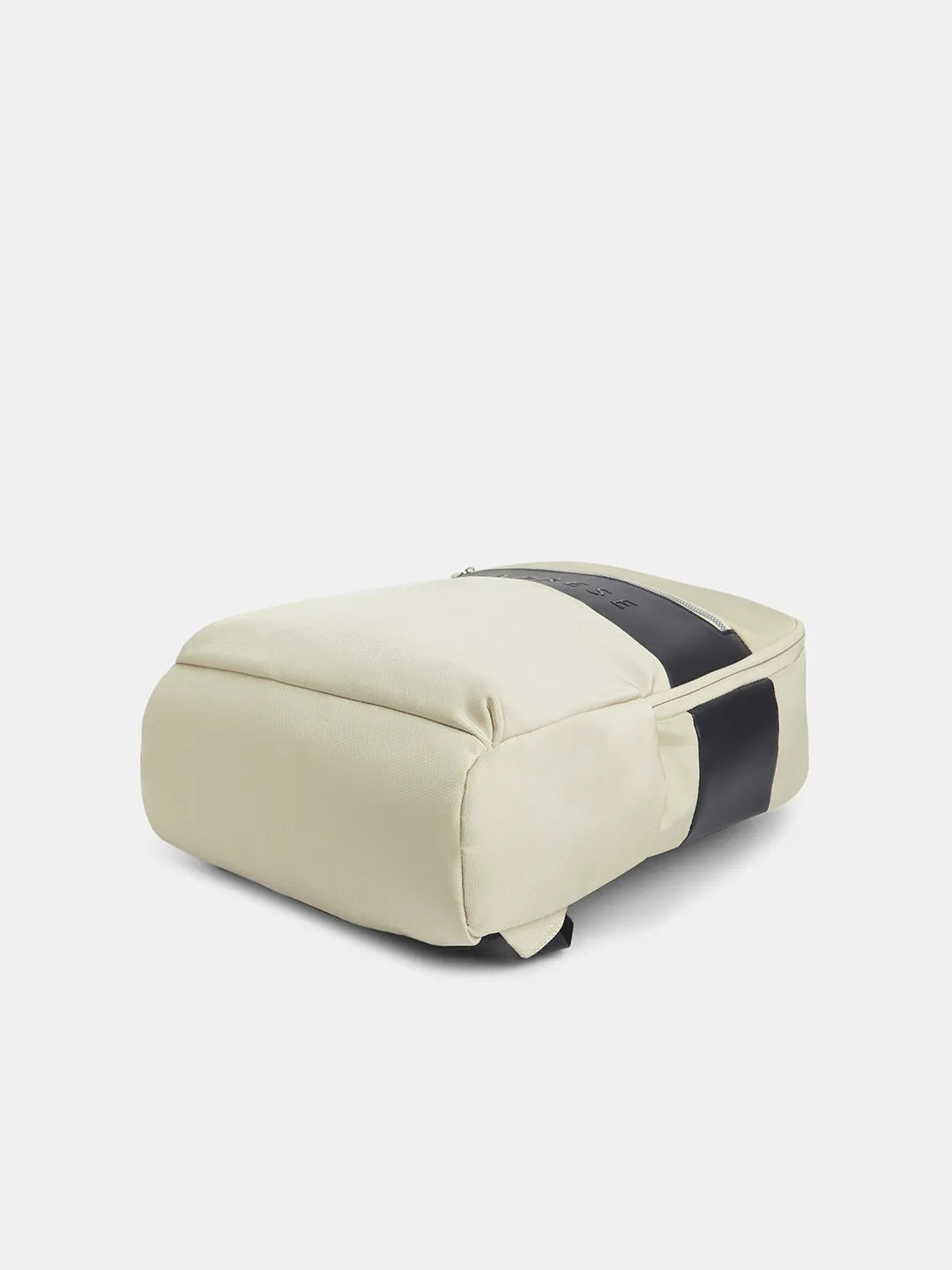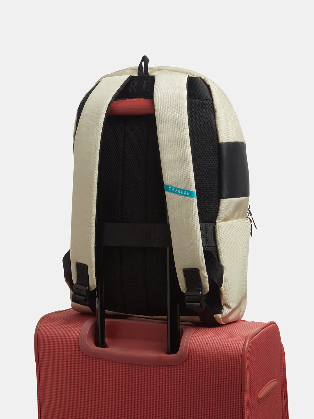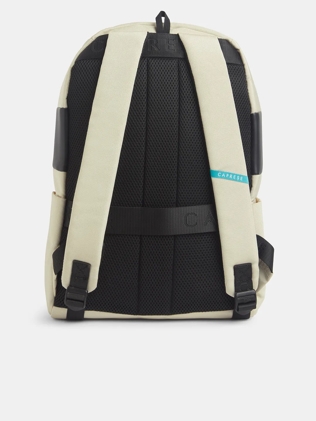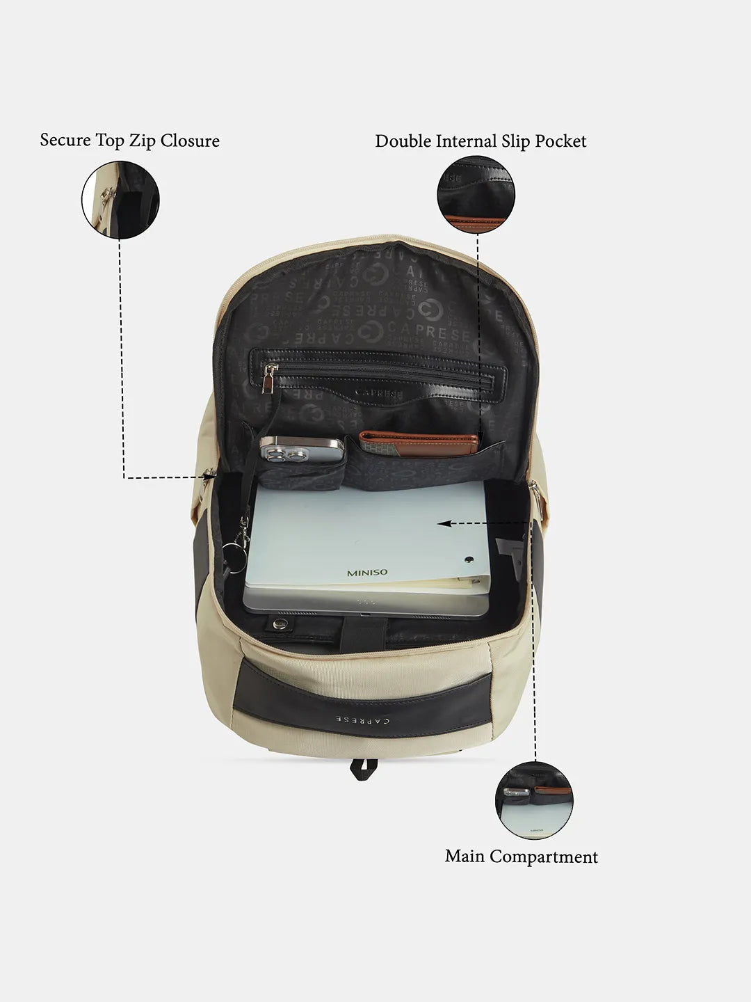 Combine sleek design with ultimate functionality with the Caprese Jupiter Laptop Backpack Large. This sophisticated bag is a perfect choice for the modern professional or student who demands both style and practicality. It features a striking color block design, with a classic beige body beautifully contrasted by a bold black horizontal stripe. A prominent "CAPRESE" logo is debossed on the black stripe, adding a touch of refined elegance.