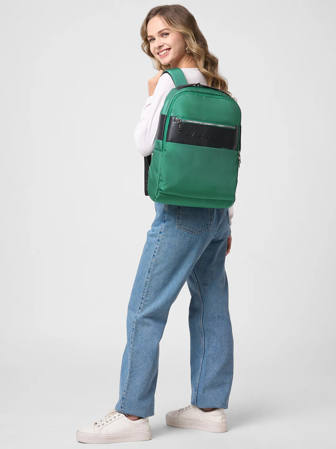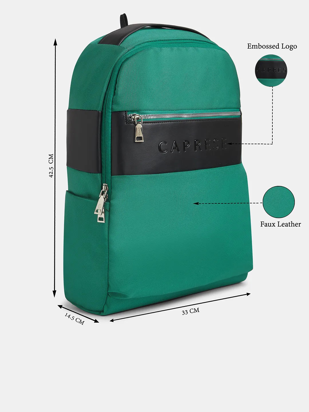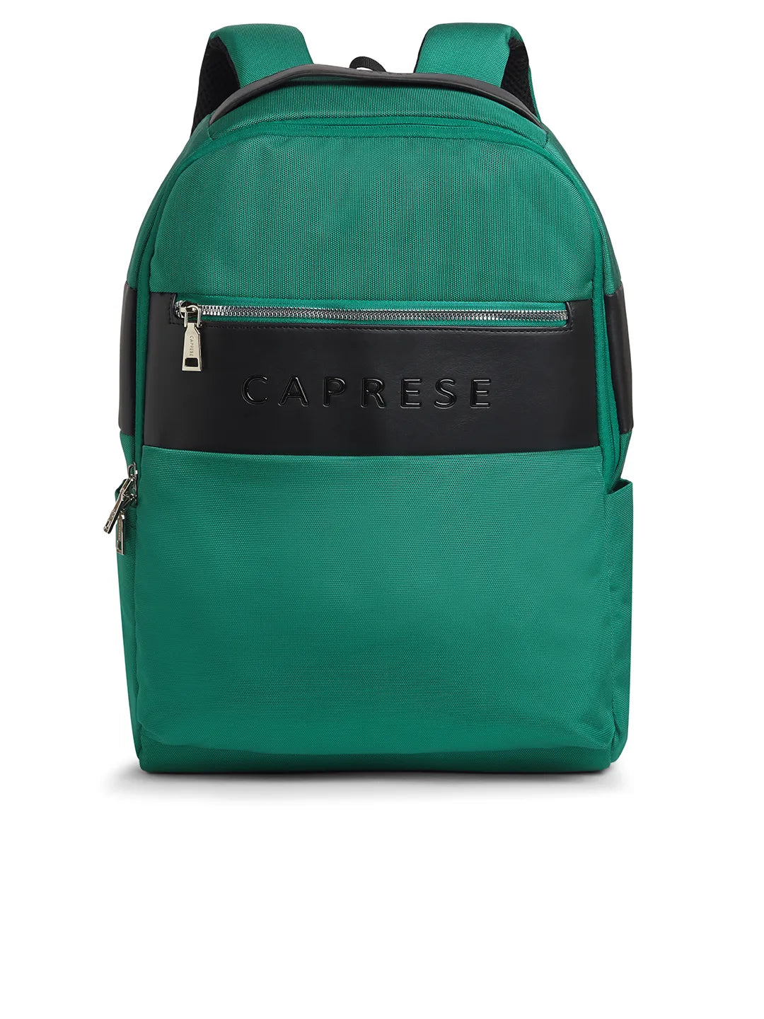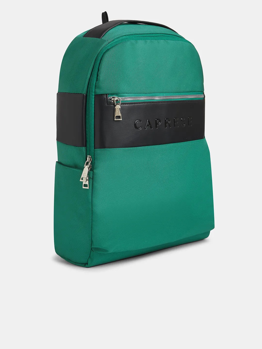 Combine sleek design with ultimate functionality with the Caprese Jupiter Laptop Backpack Large. This sophisticated bag is a perfect choice for the modern professional or student who demands both style and practicality. It features a striking color block design, with a classic dark green body beautifully contrasted by a bold black horizontal stripe. A prominent "CAPRESE" logo is debossed on the black stripe, adding a touch of refined elegance.