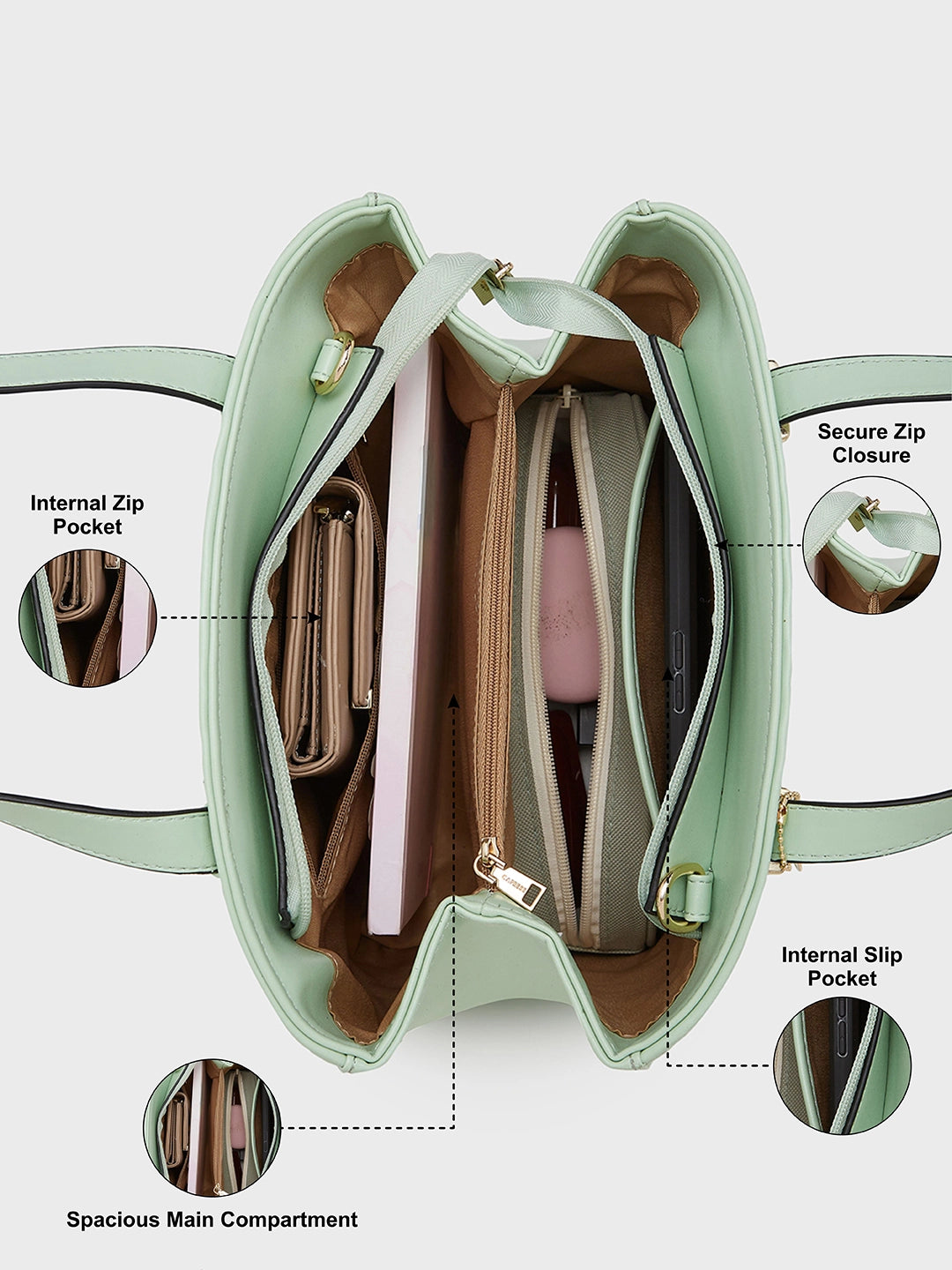Spacious & Organized: Well-designed interior with multiple compartments, pockets, and a back zip to keep your essentials organized and easily accessible.