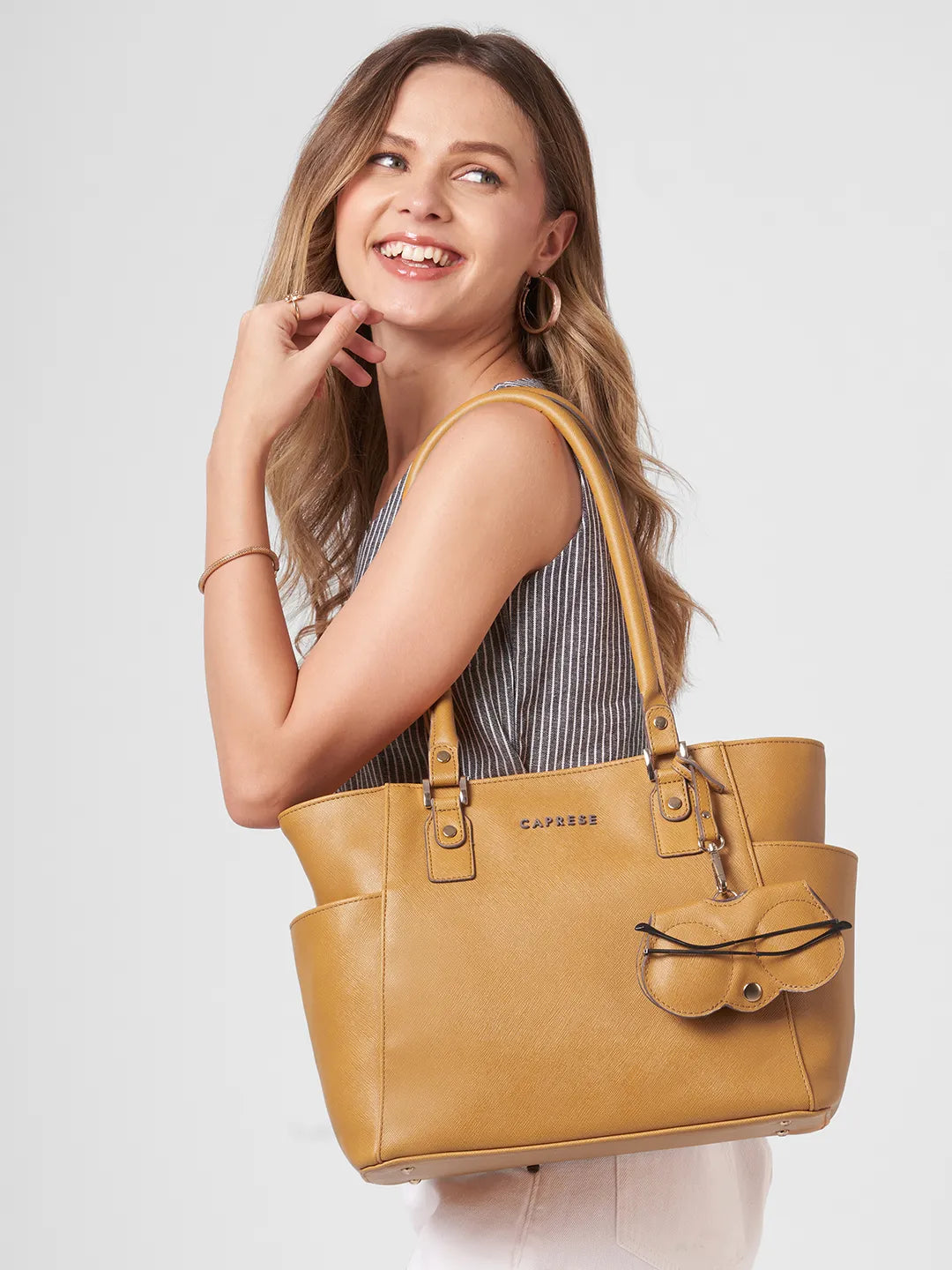 Step out in style with the Caprese Lexi Medium Tote Bag, a perfect balance of elegance and everyday functionality. Made with premium solid faux leather, this tote is durable, lightweight, and fashion-forward. The spacious compartment with secure zipper closure easily holds your daily essentials like wallet, phone, makeup, and small gadgets, making it ideal for work, travel, or casual outings. Designed with an external eyewear/sunglass charm case, it adds a smart and stylish touch while keeping your glasses safe and accessible. Whether carried as a shoulder bag or handbag, this versatile tote enhances your everyday look while providing maximum practicality.