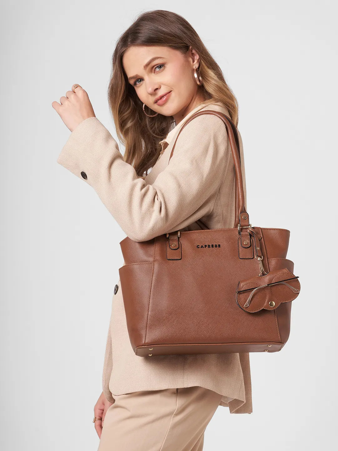 Step out in style with the Caprese Lexi Medium Tote Bag, a perfect balance of elegance and everyday functionality. Made with premium solid faux leather, this tote is durable, lightweight, and fashion-forward. The spacious compartment with secure zipper closure easily holds your daily essentials like wallet, phone, makeup, and small gadgets, making it ideal for work, travel, or casual outings. Designed with an external eyewear/sunglass charm case, it adds a smart and stylish touch while keeping your glasses safe and accessible. Whether carried as a shoulder bag or handbag, this versatile tote enhances your everyday look while providing maximum practicality.