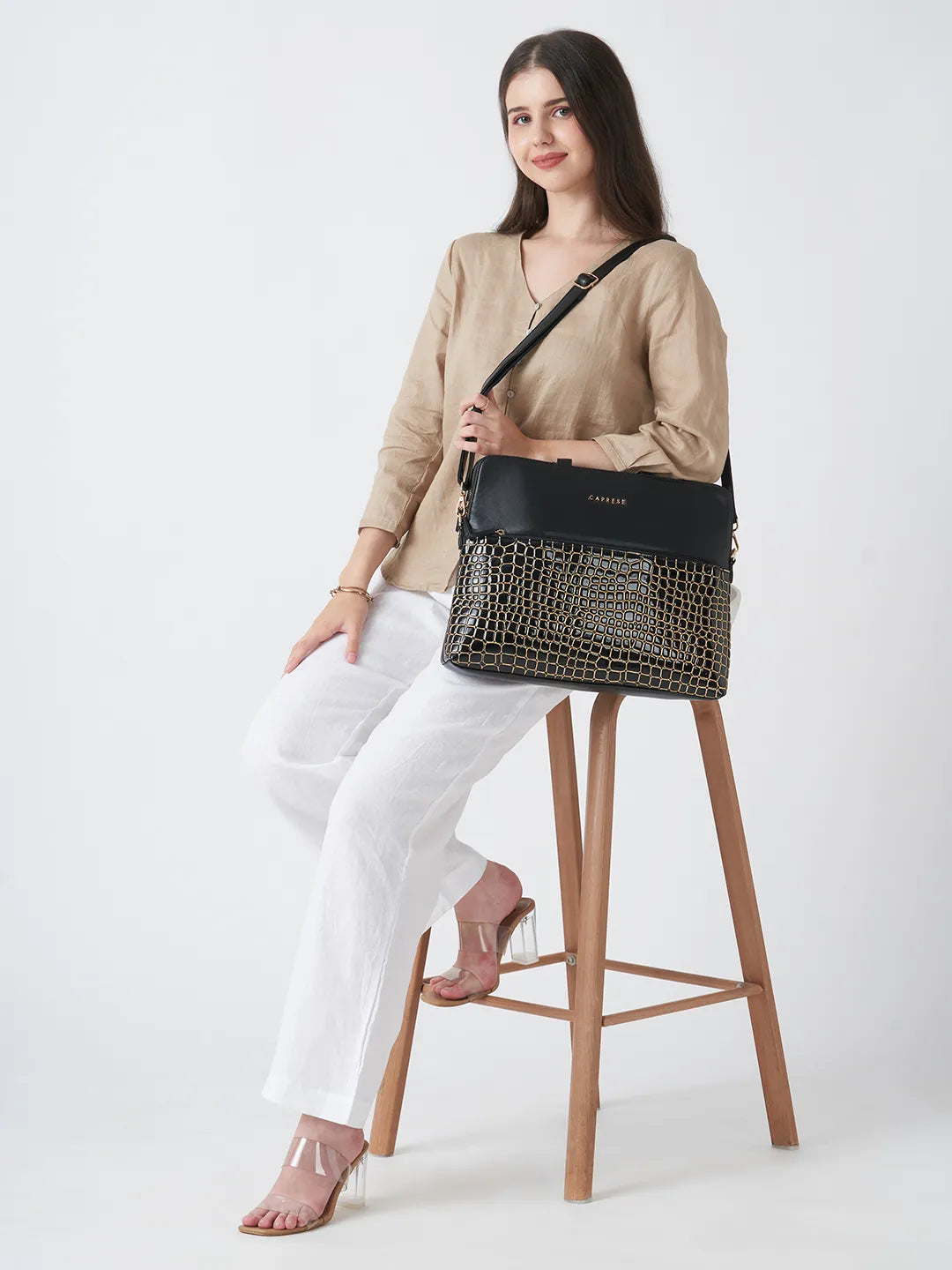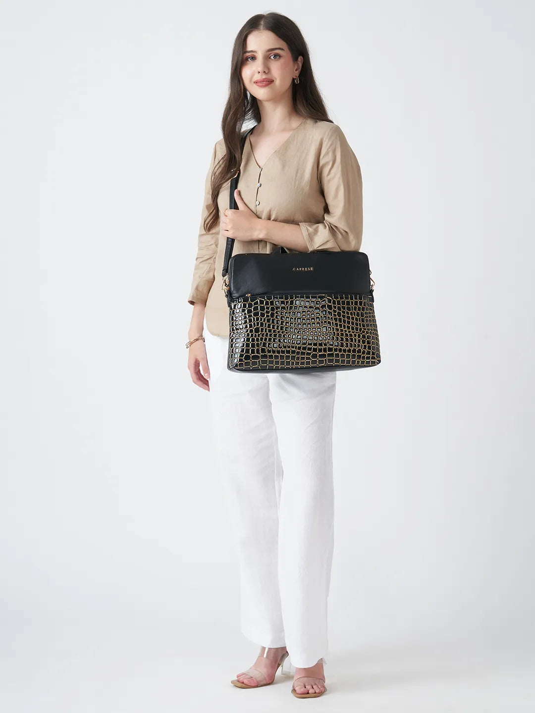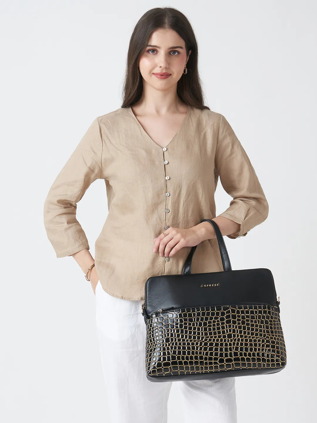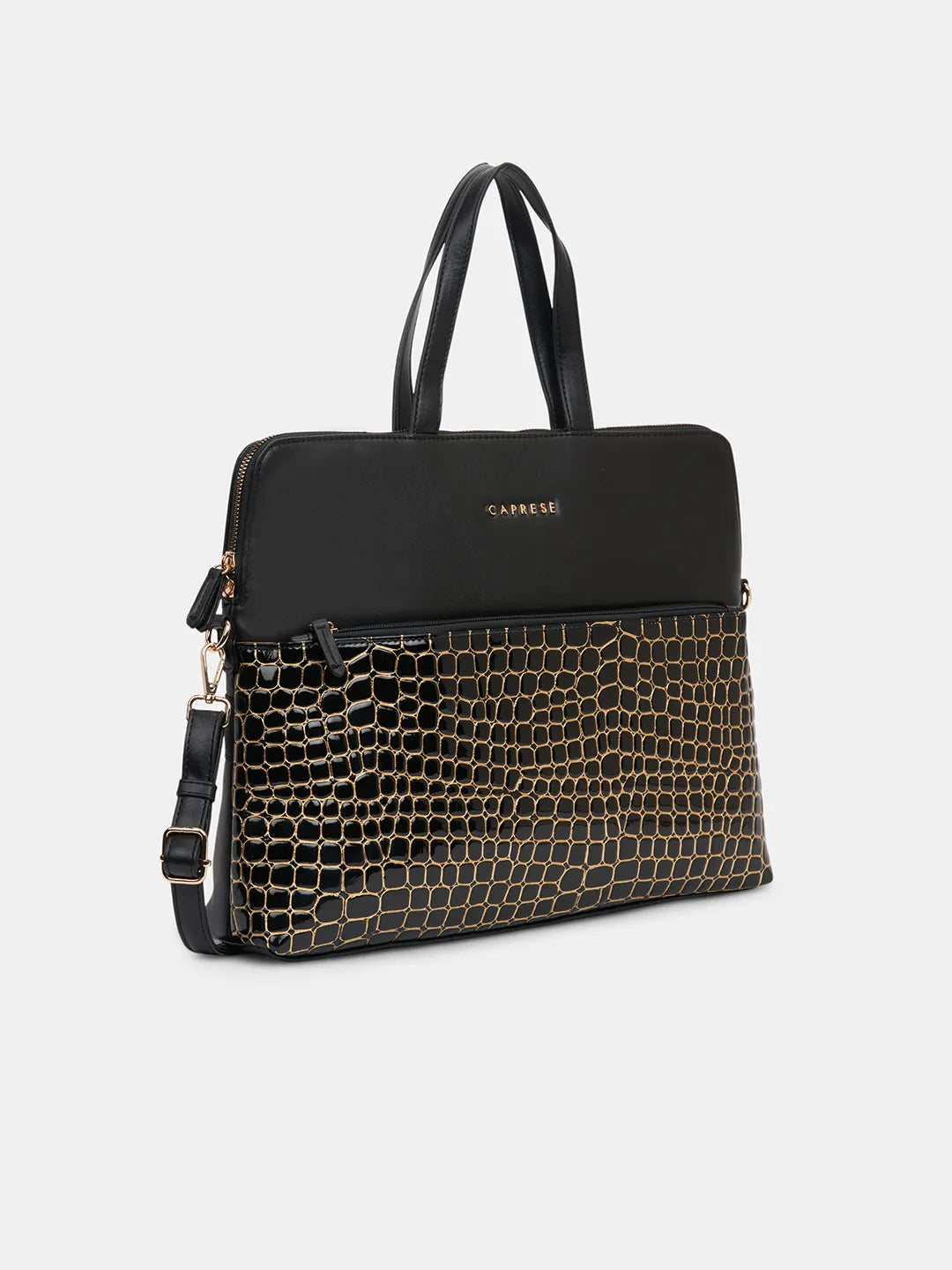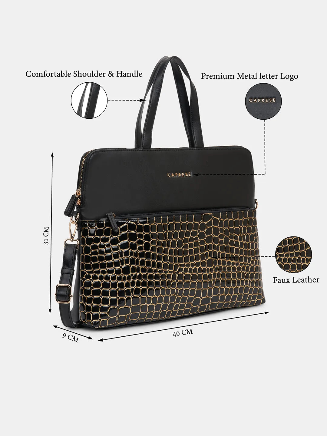 Upgrade your work and travel style with the Caprese Lily Large Laptop Bag, crafted from premium croc-embossed faux leather for a sleek and professional look. This versatile bag features multiple compartments, including 2 external pockets and a dedicated laptop sleeve, keeping your laptop, documents, wallet, and essentials organized. The adjustable and detachable strap allows carrying as a handheld bag or shoulder bag with comfort and ease. With a secure zipper closure, your belongings stay safe while maintaining elegance. Perfect for office, business trips, or daily use, the Lily Laptop Bag Large blends functionality with high-end fashion.