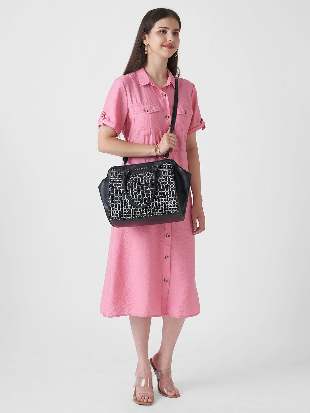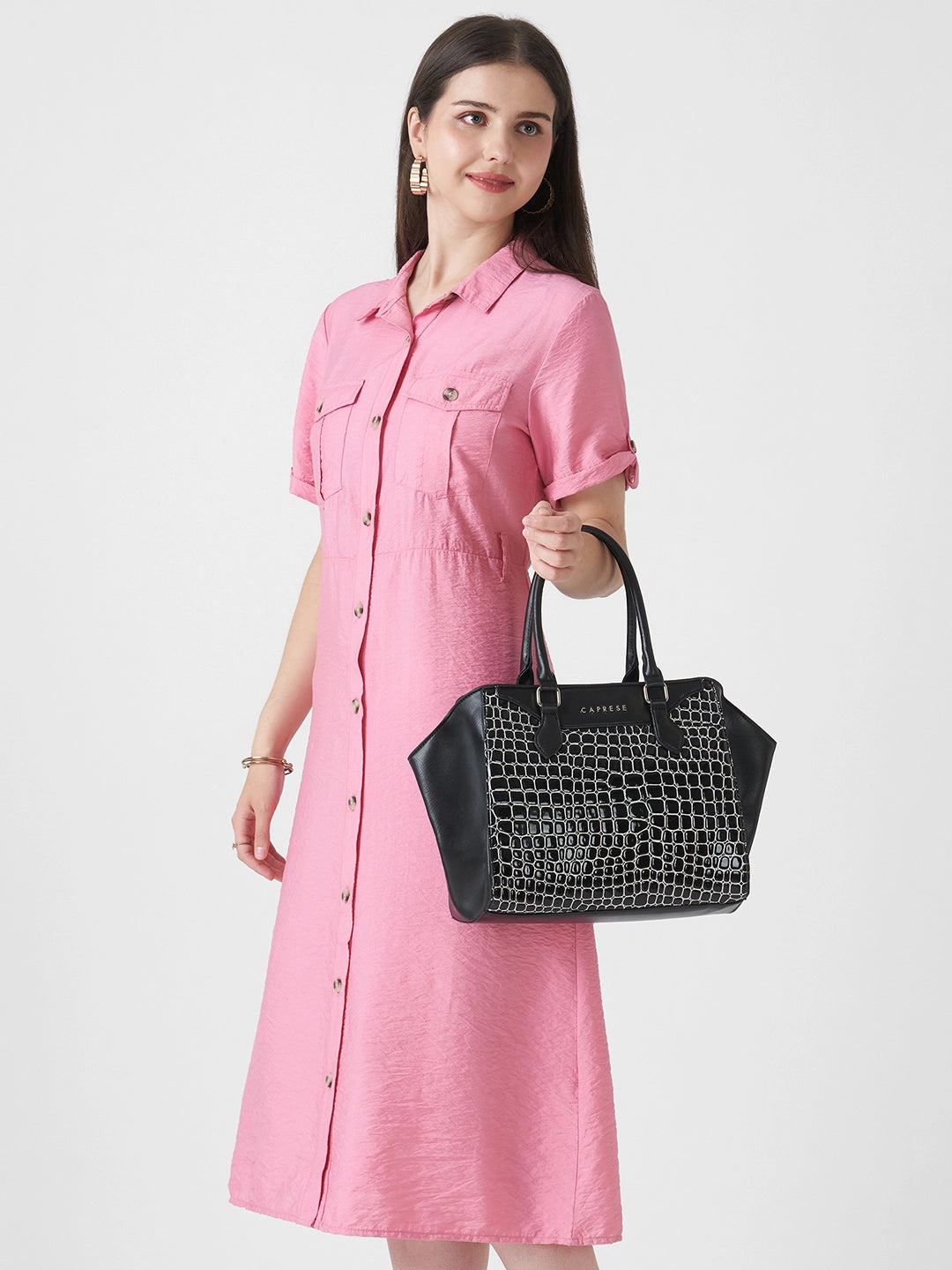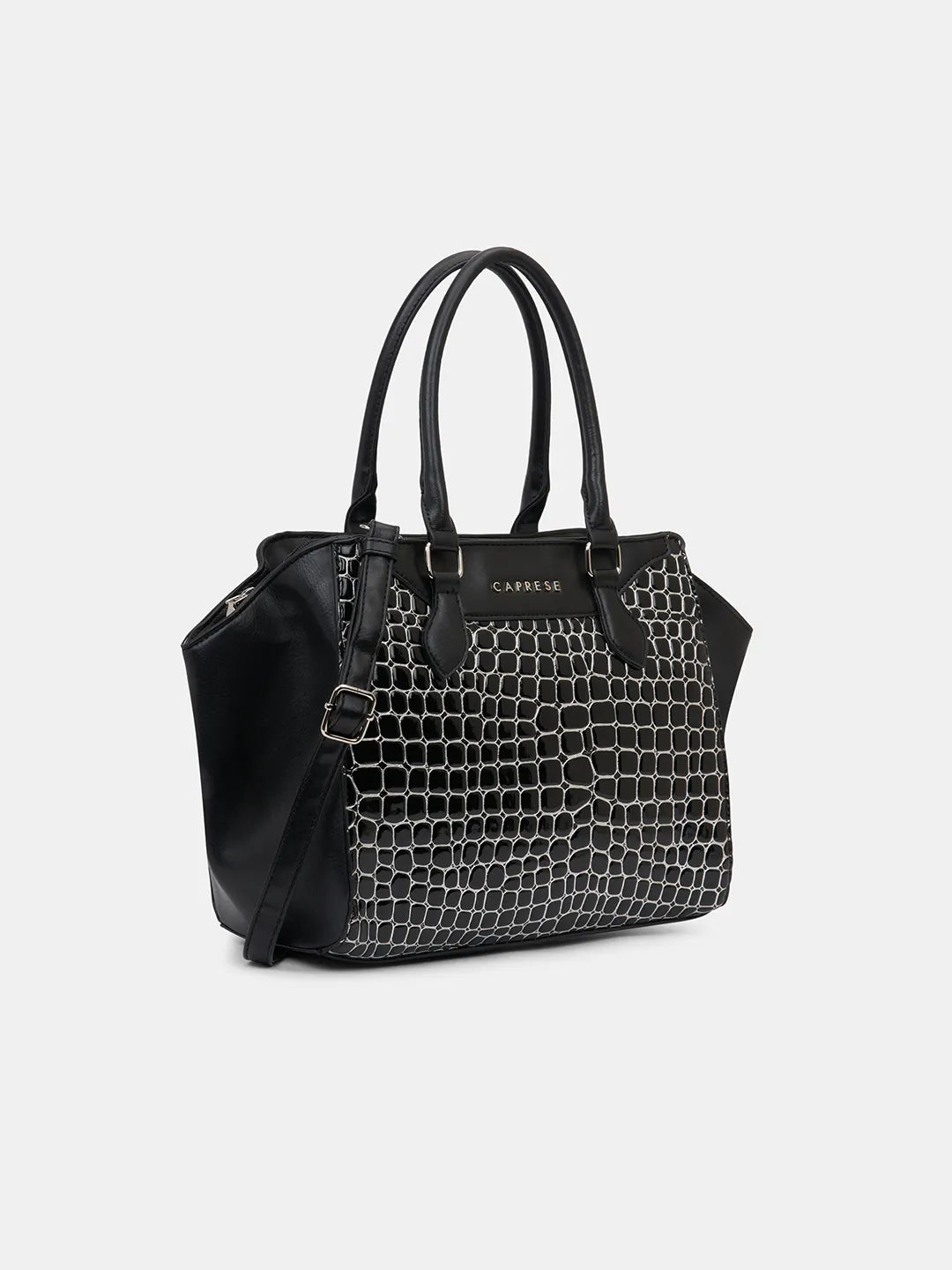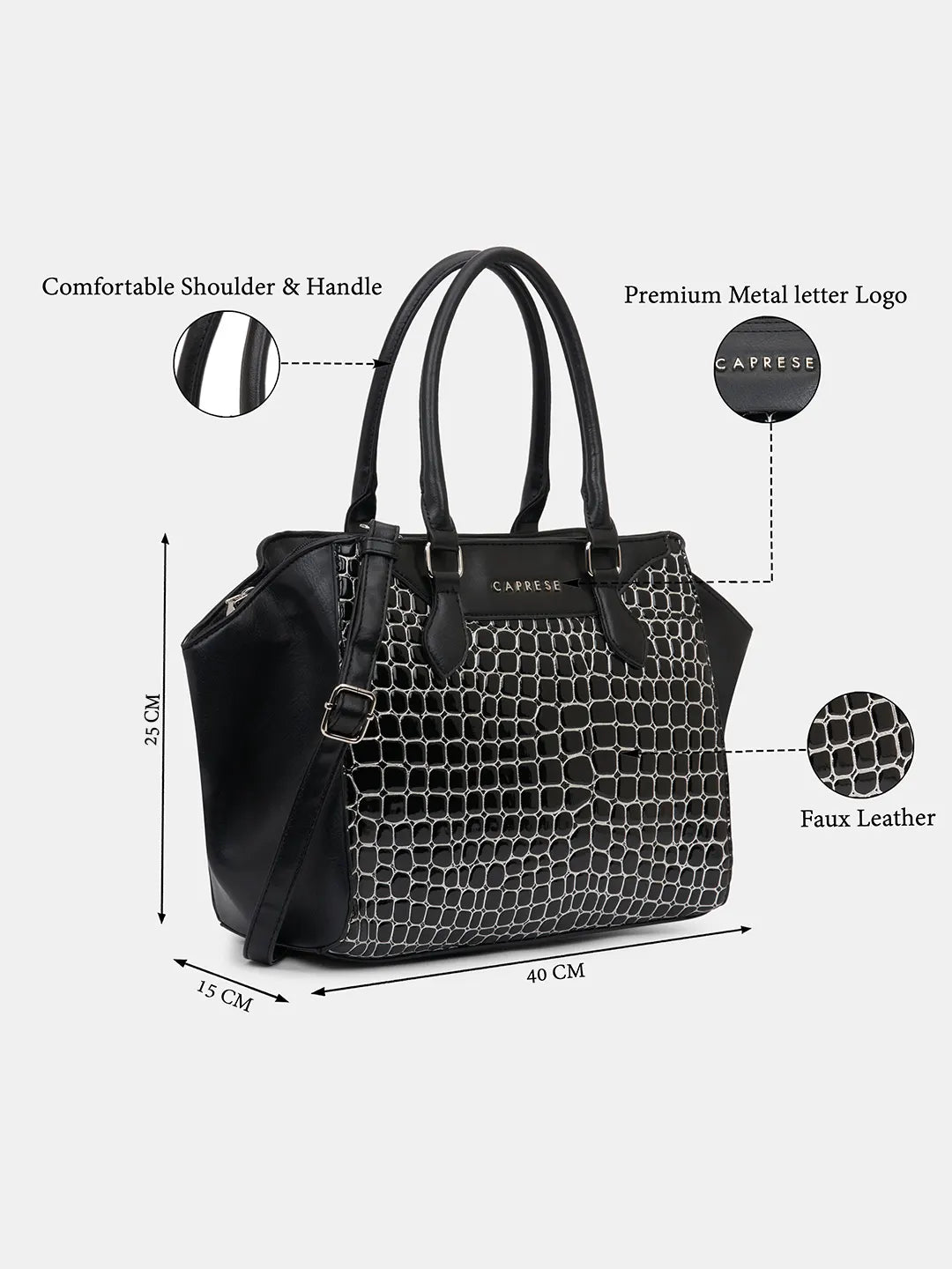 Step out in style with the Caprese Lily Large Satchel, crafted from premium croc-embossed faux leather for a chic, sophisticated, and durable finish. Designed for modern women, this versatile satchel features multiple compartments to keep essentials like wallet, phone, keys, makeup, and documents organized. The adjustable and detachable strap allows for carrying as a handheld bag or shoulder bag, providing comfort and flexibility. With a secure zipper closure, your belongings stay protected while maintaining an elegant look. Perfect for office, shopping, travel, or casual outings, the Lily Satchel Large blends fashion with functionality effortlessly.