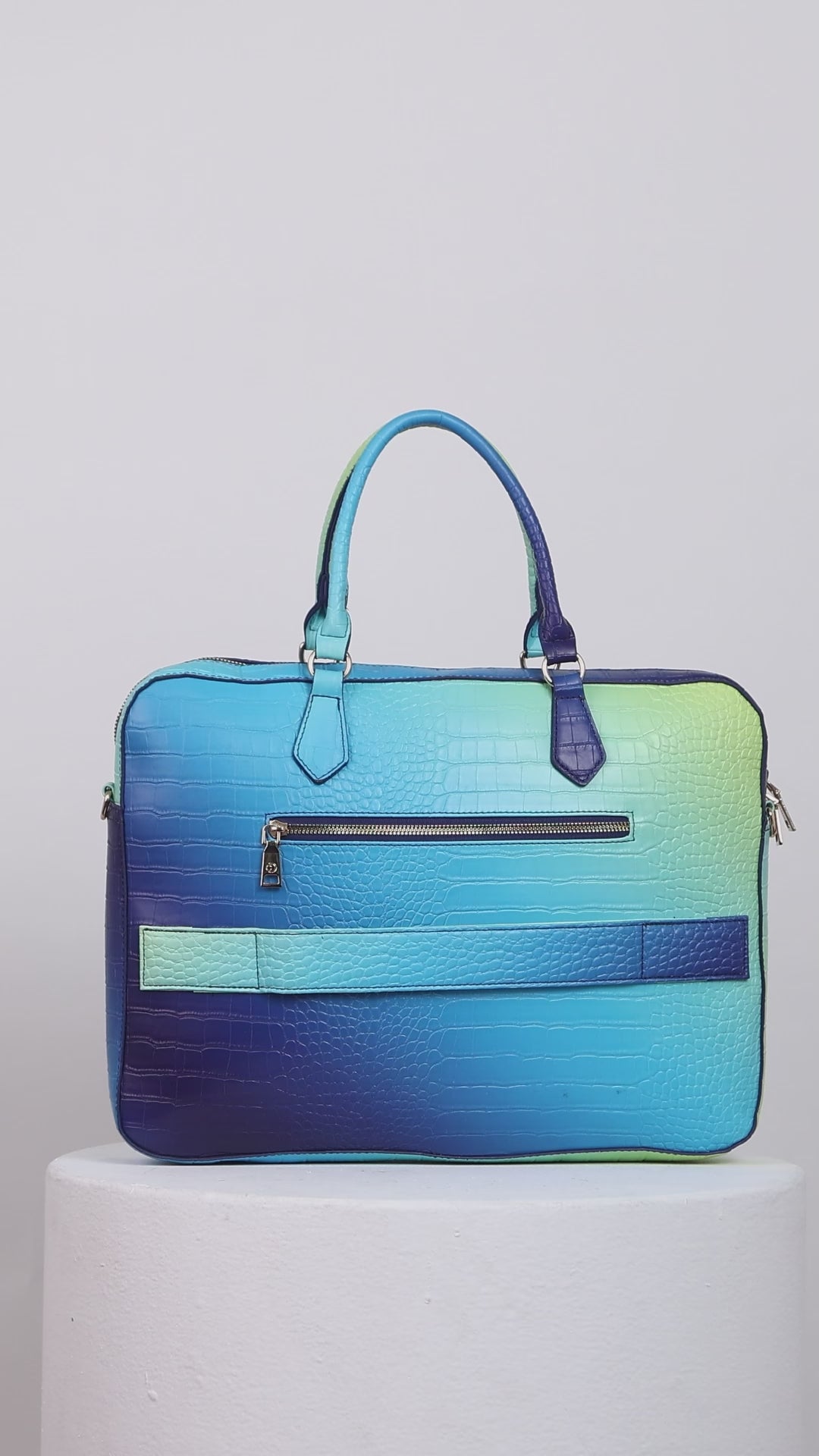 Elevate your professional style with the Caprese Marilyn Laptop Bag Large, a perfect fusion of striking design and practical functionality. This eye-catching handbag features a captivating blue-to-green ombre effect, beautifully enriched by a luxurious crocodile texture. A unique detachable Caprese flower charm, adorned with a gold "C" logo, adds a touch of elegant flair, while gold-tone hardware completes the sophisticated look.