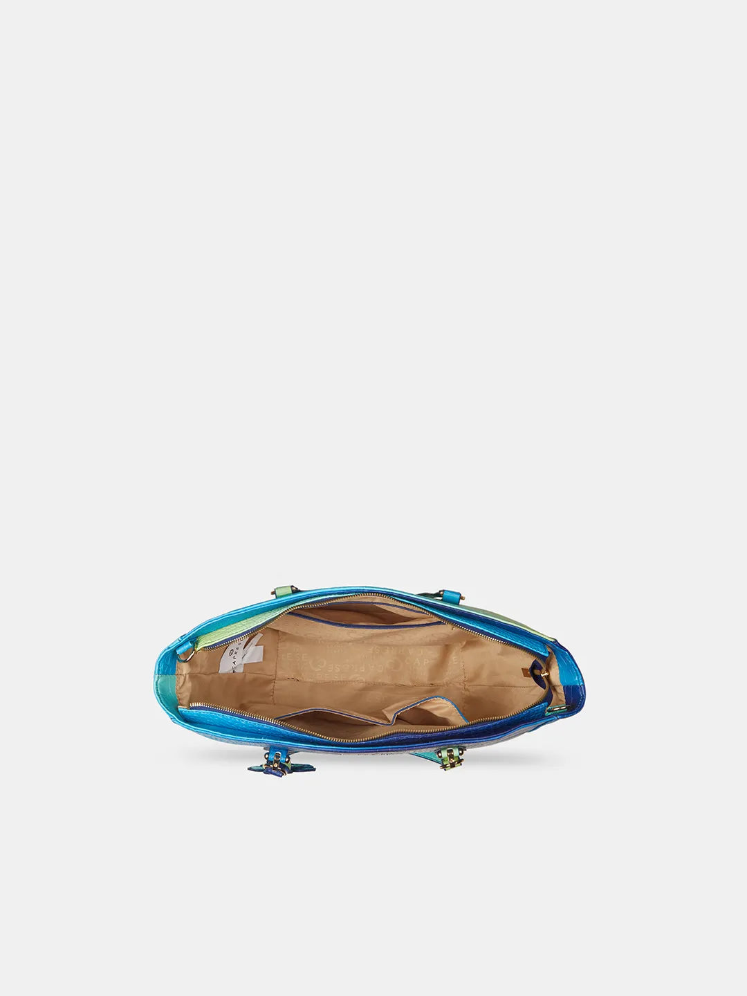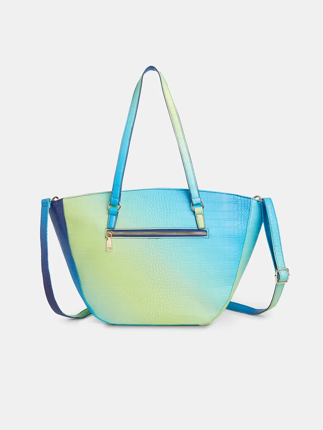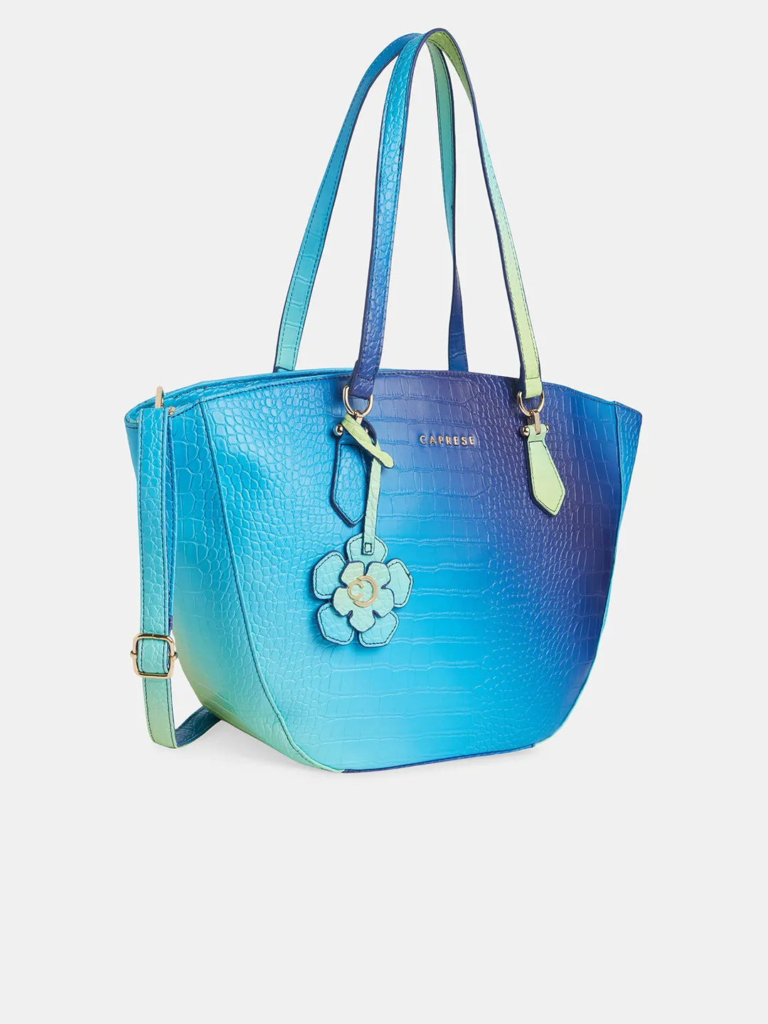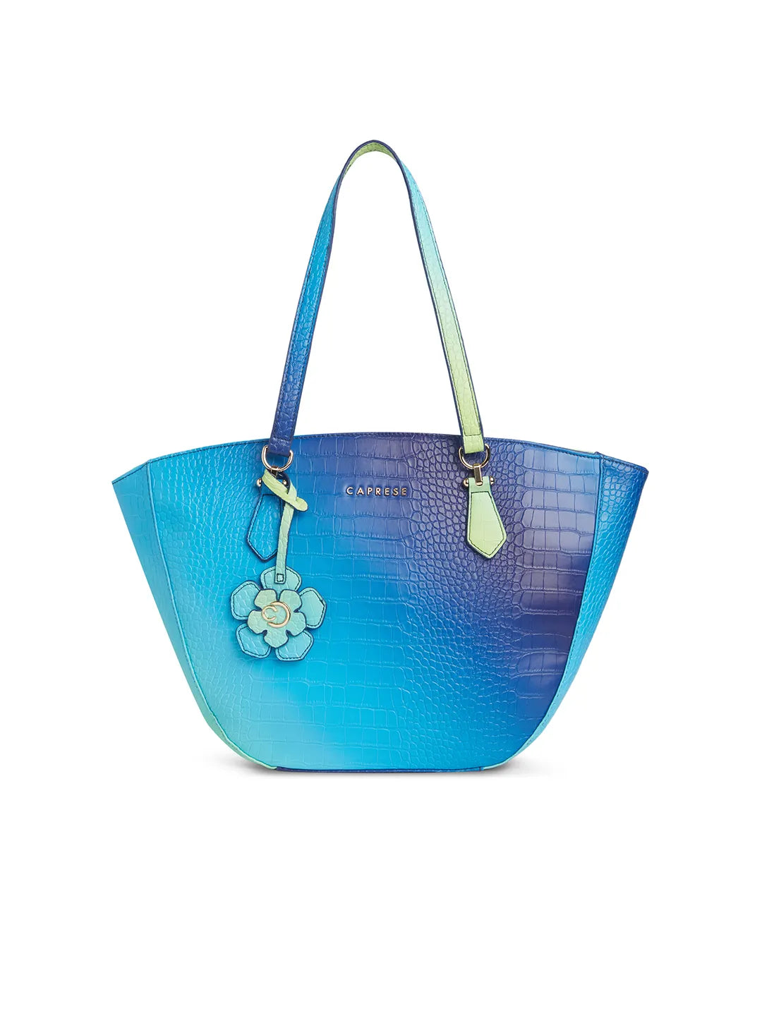 Make a striking fashion statement with the Caprese Marilyn Satchel Large, a beautiful blend of contemporary design and practical elegance. This eye-catching handbag features a captivating blue ombre effect, transitioning from a vibrant blue to a soft, lime green hue, all enhanced by a luxurious crocodile texture. Gold-tone hardware and a unique detachable Caprese flower charm, adorned with a gold "C" logo, add a touch of elegant sophistication.