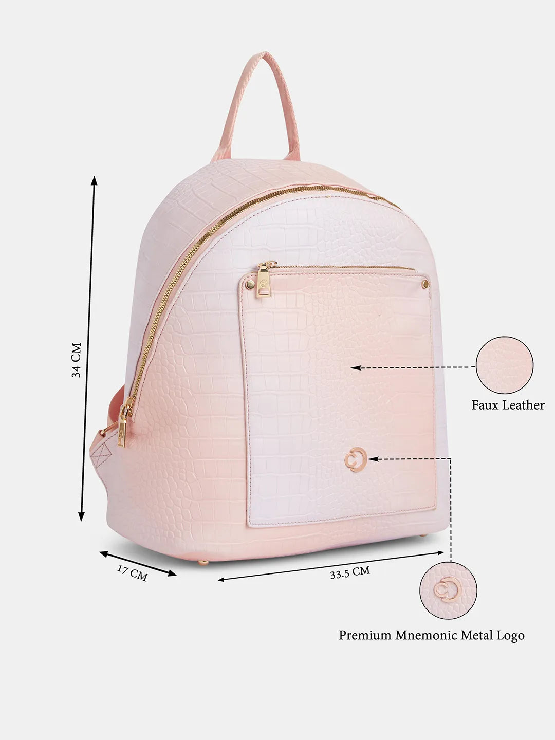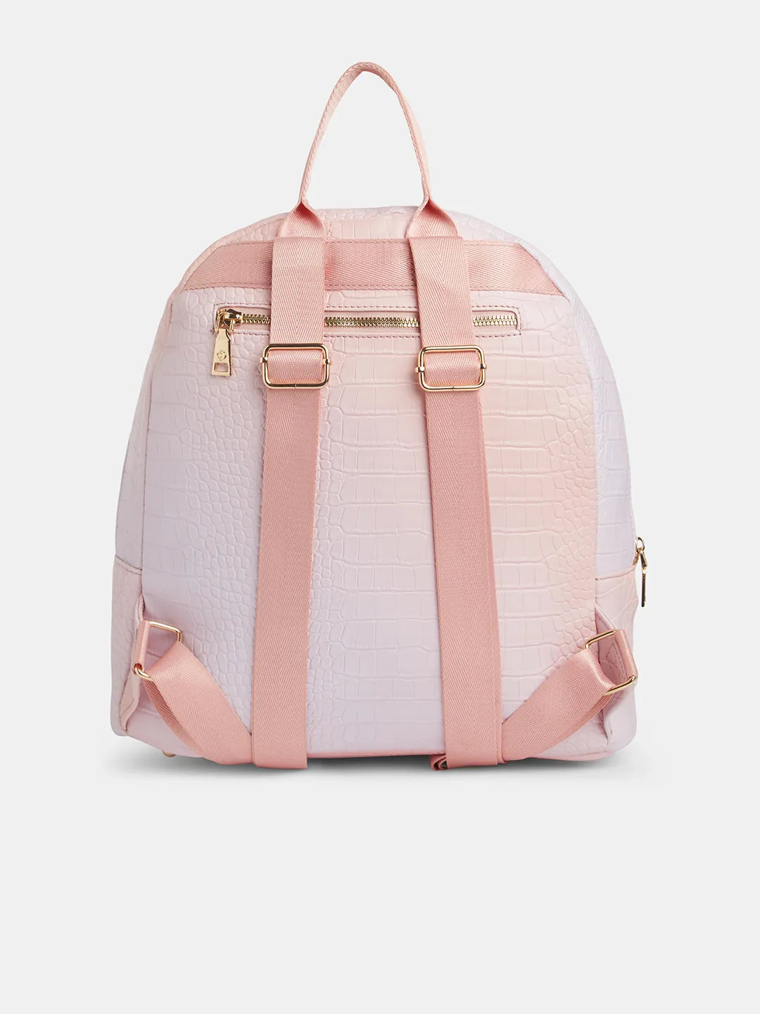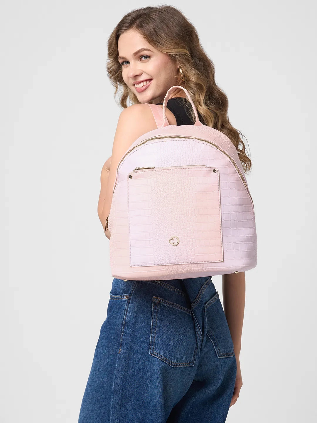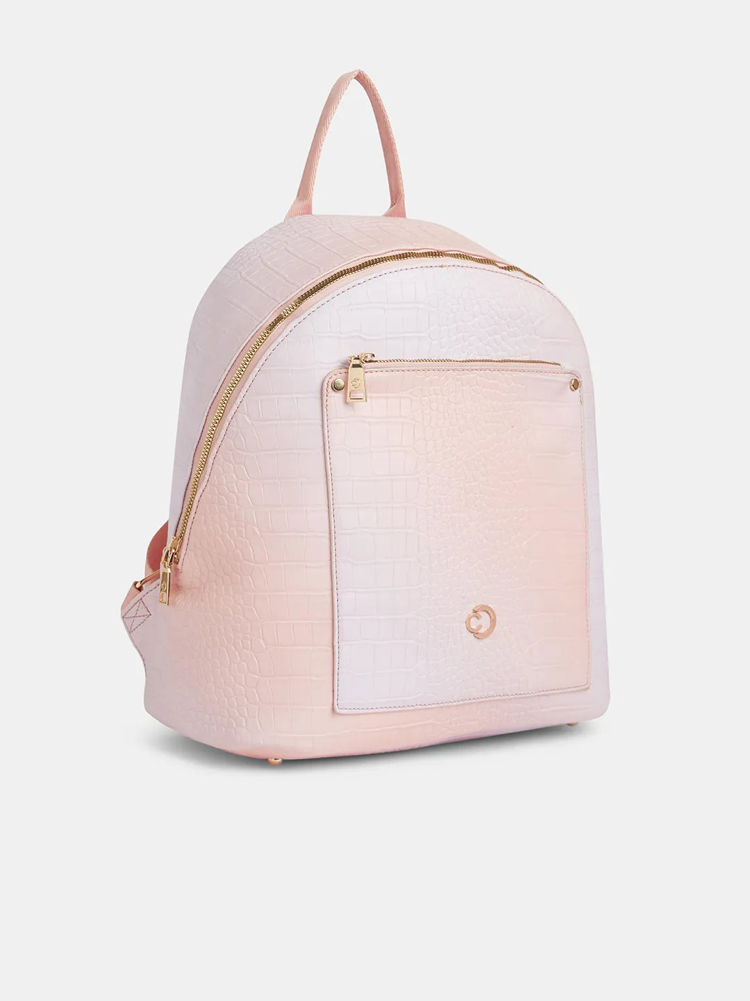 Step out in charming style with the Caprese Marilyn Fashion Backpack Large, a perfect blend of modern elegance and practical design. This eye-catching backpack features a delightful pink ombre effect, transitioning beautifully from a lighter to a darker shade, all enhanced by a sophisticated crocodile texture. Gold-tone hardware, including zippers and a subtle Caprese logo emblem on the front pocket, adds a touch of luxury.