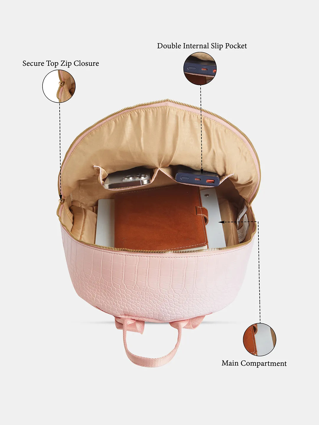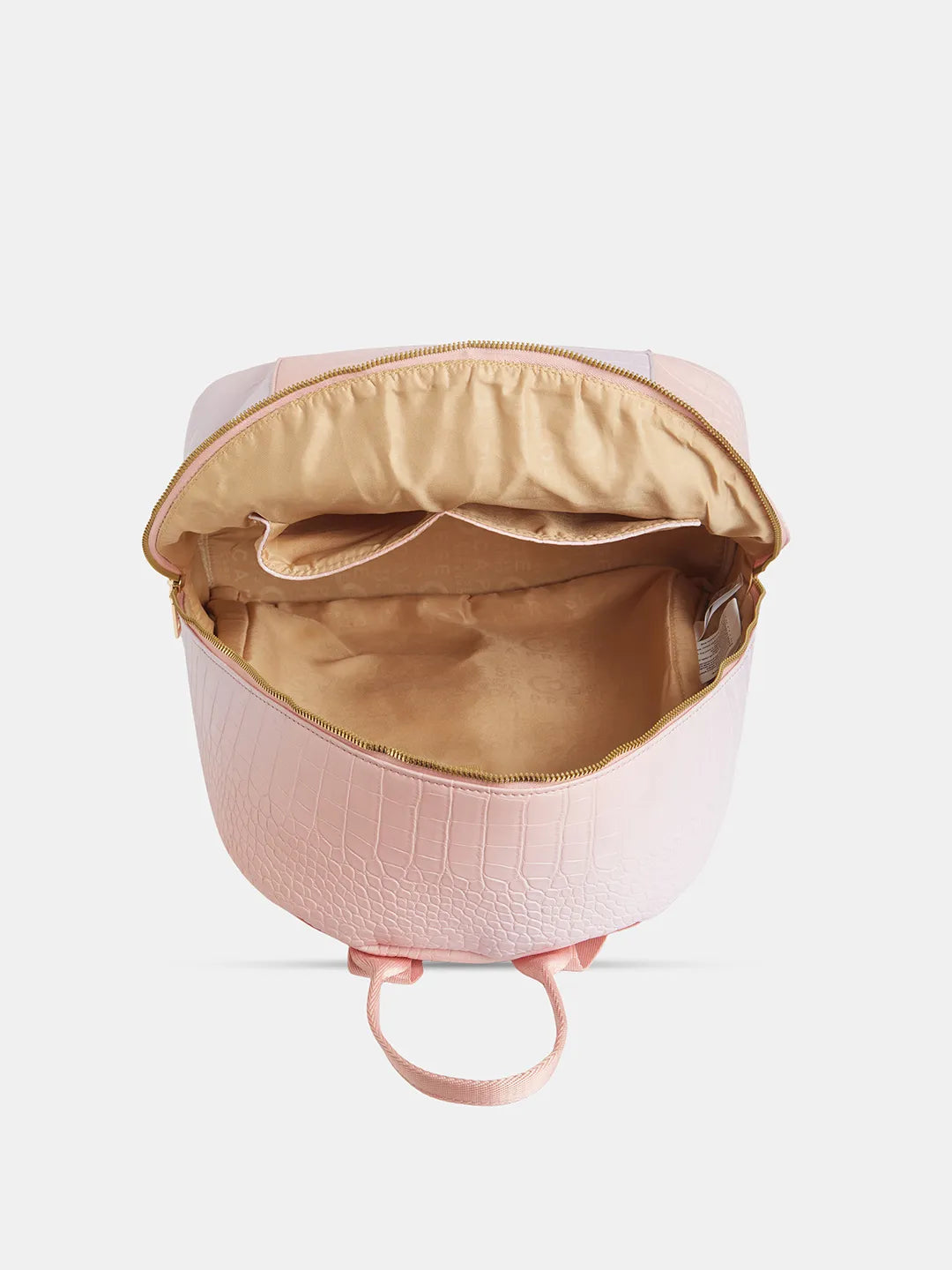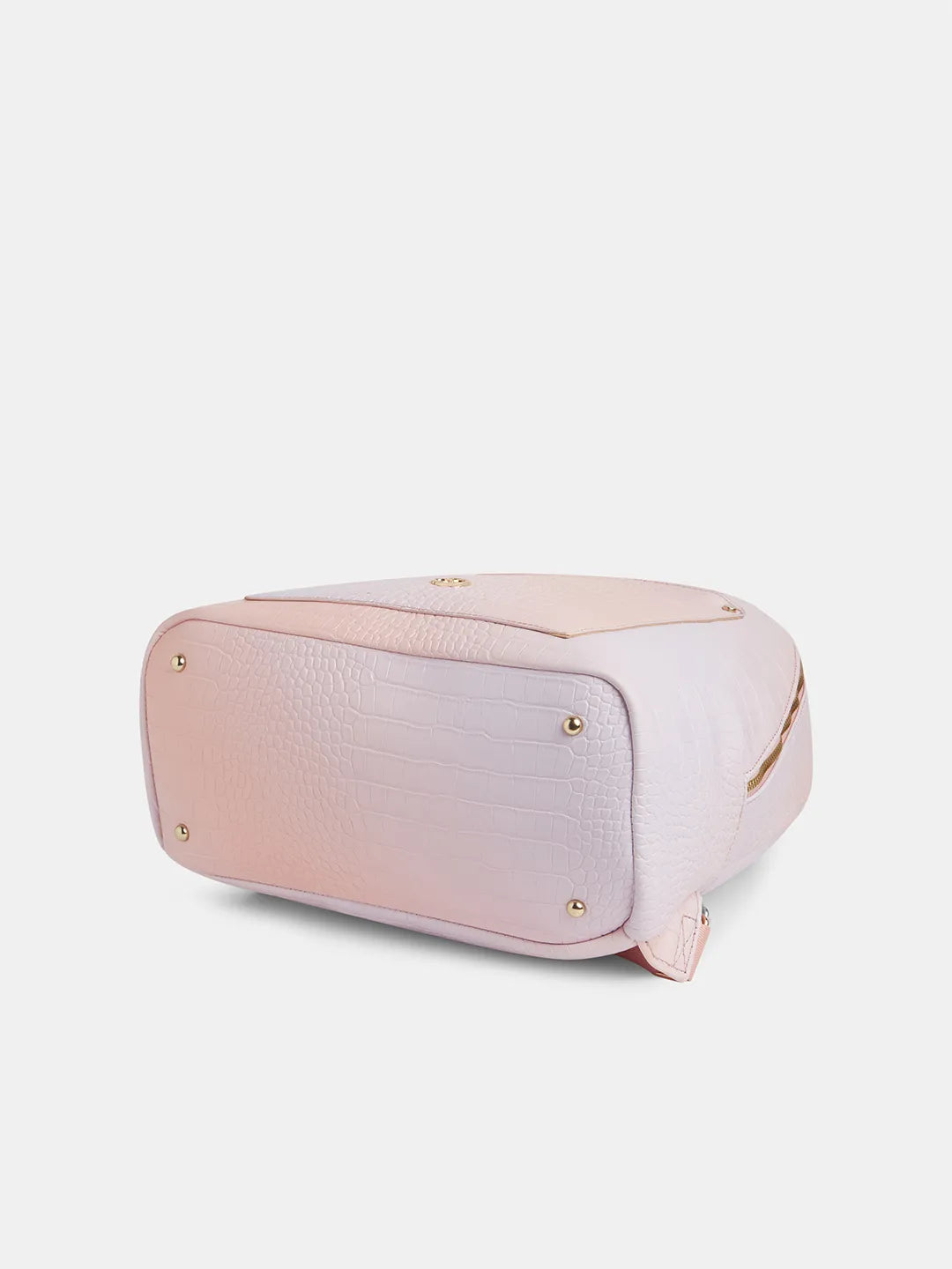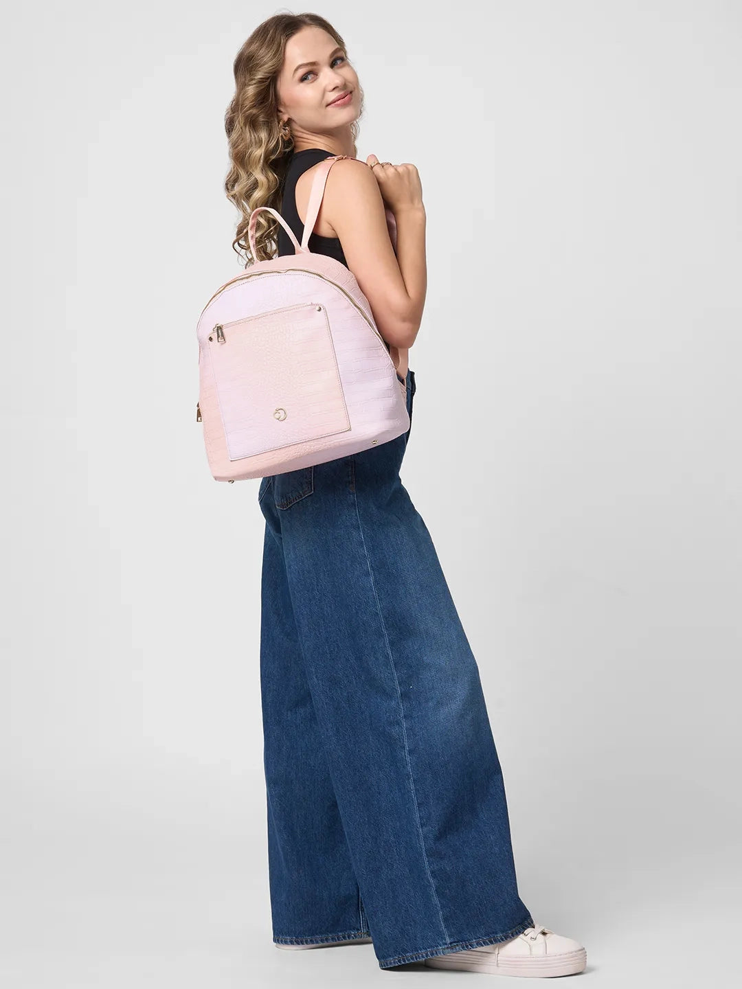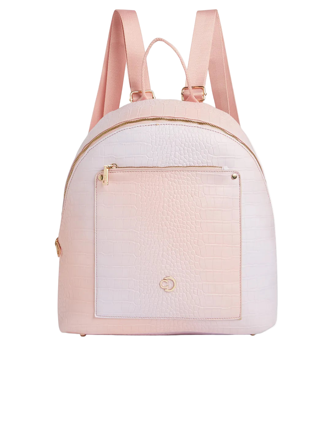 Step out in charming style with the Caprese Marilyn Fashion Backpack Large, a perfect blend of modern elegance and practical design. This eye-catching backpack features a delightful pink ombre effect, transitioning beautifully from a lighter to a darker shade, all enhanced by a sophisticated crocodile texture. Gold-tone hardware, including zippers and a subtle Caprese logo emblem on the front pocket, adds a touch of luxury.