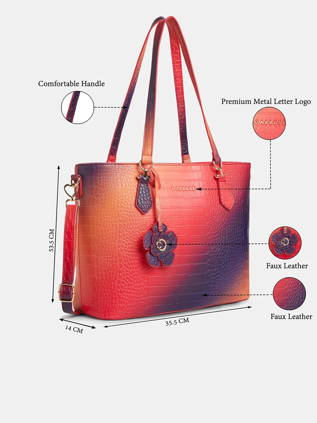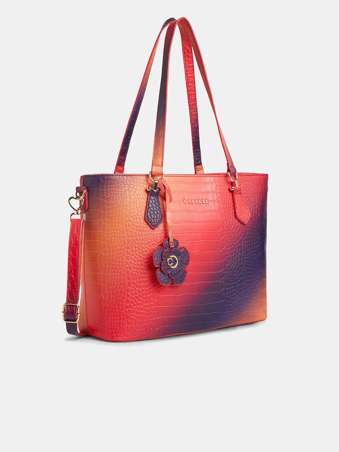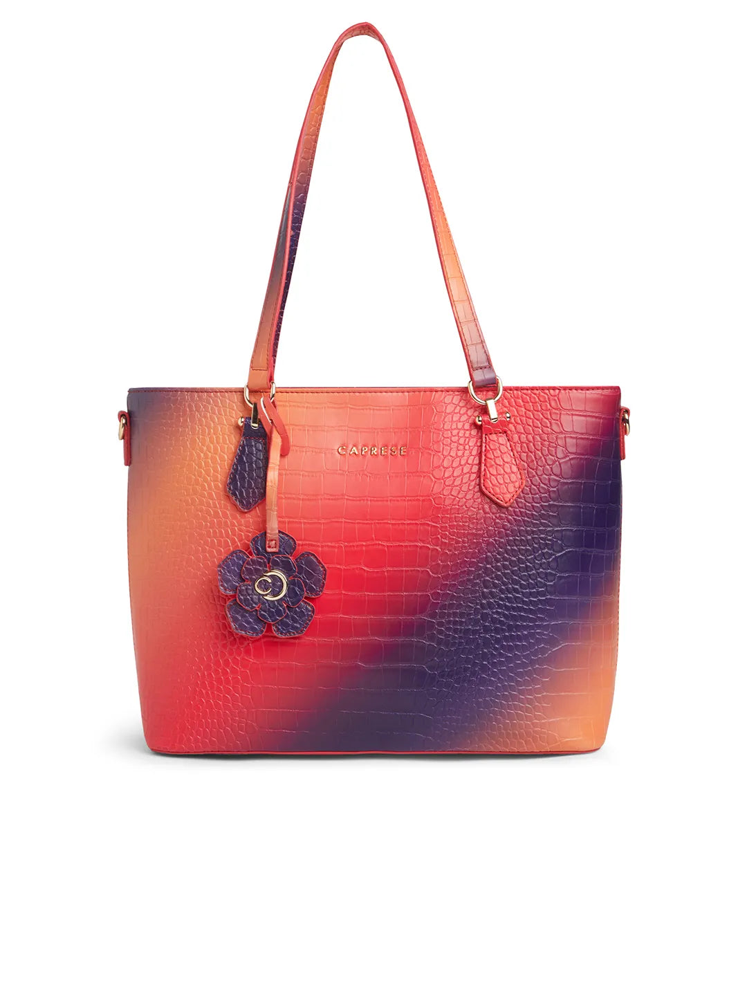 Make a vibrant fashion statement with the Caprese Marilyn Tote Large, a stunning blend of contemporary design and versatile functionality. This eye-catching handbag features a captivating multi-color ombre effect, transitioning beautifully through shades of orange, red, and purple, all enriched by a luxurious crocodile texture. Gold-tone hardware and a unique detachable Caprese flower charm, adorned with a gold "C" logo, add a touch of elegant sophistication.