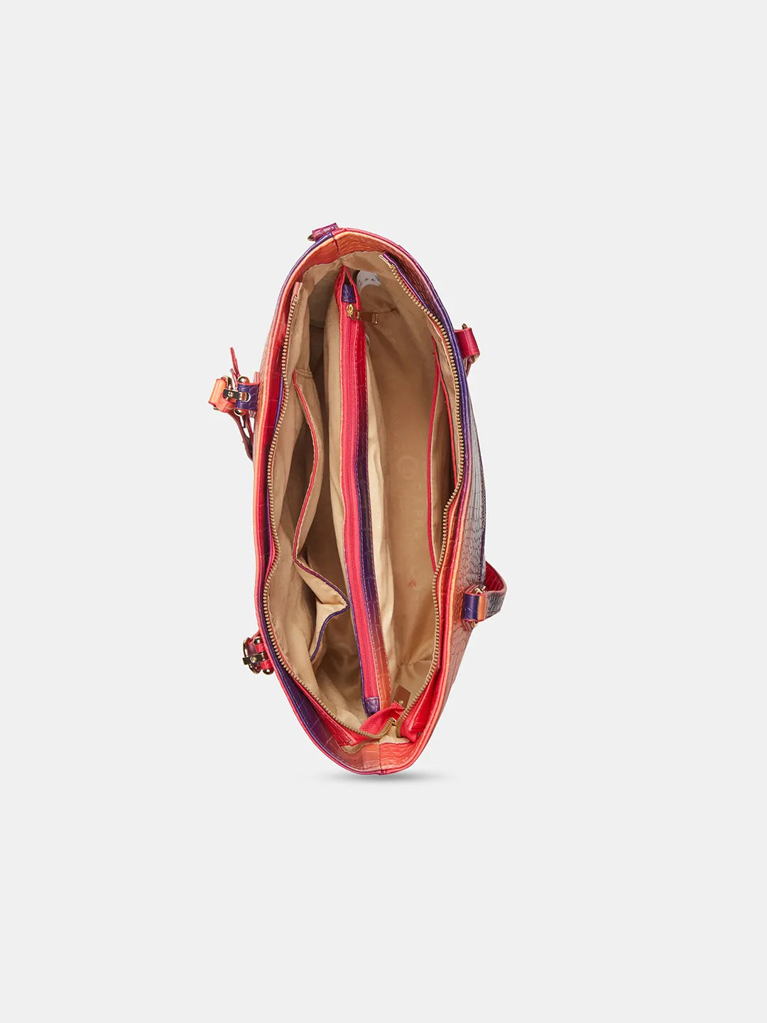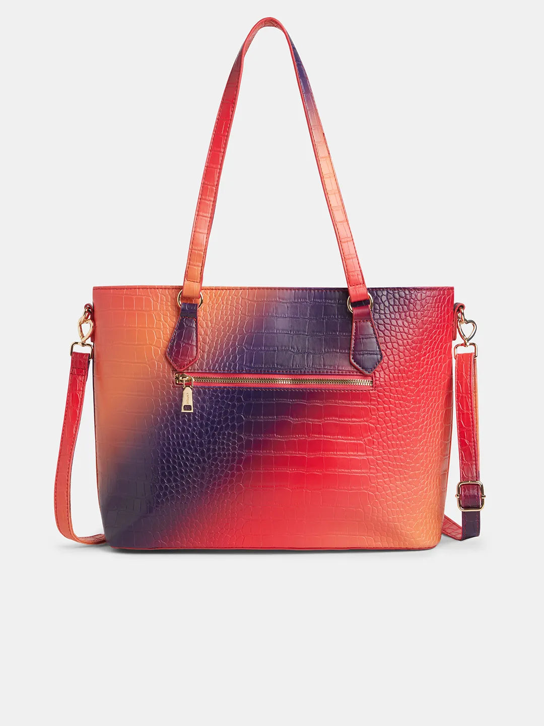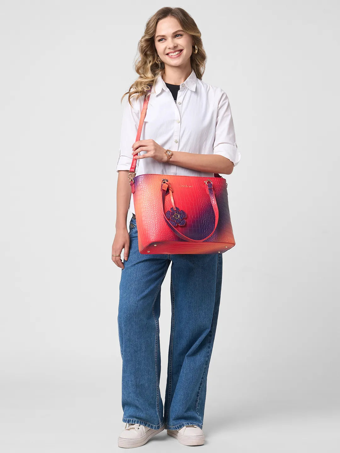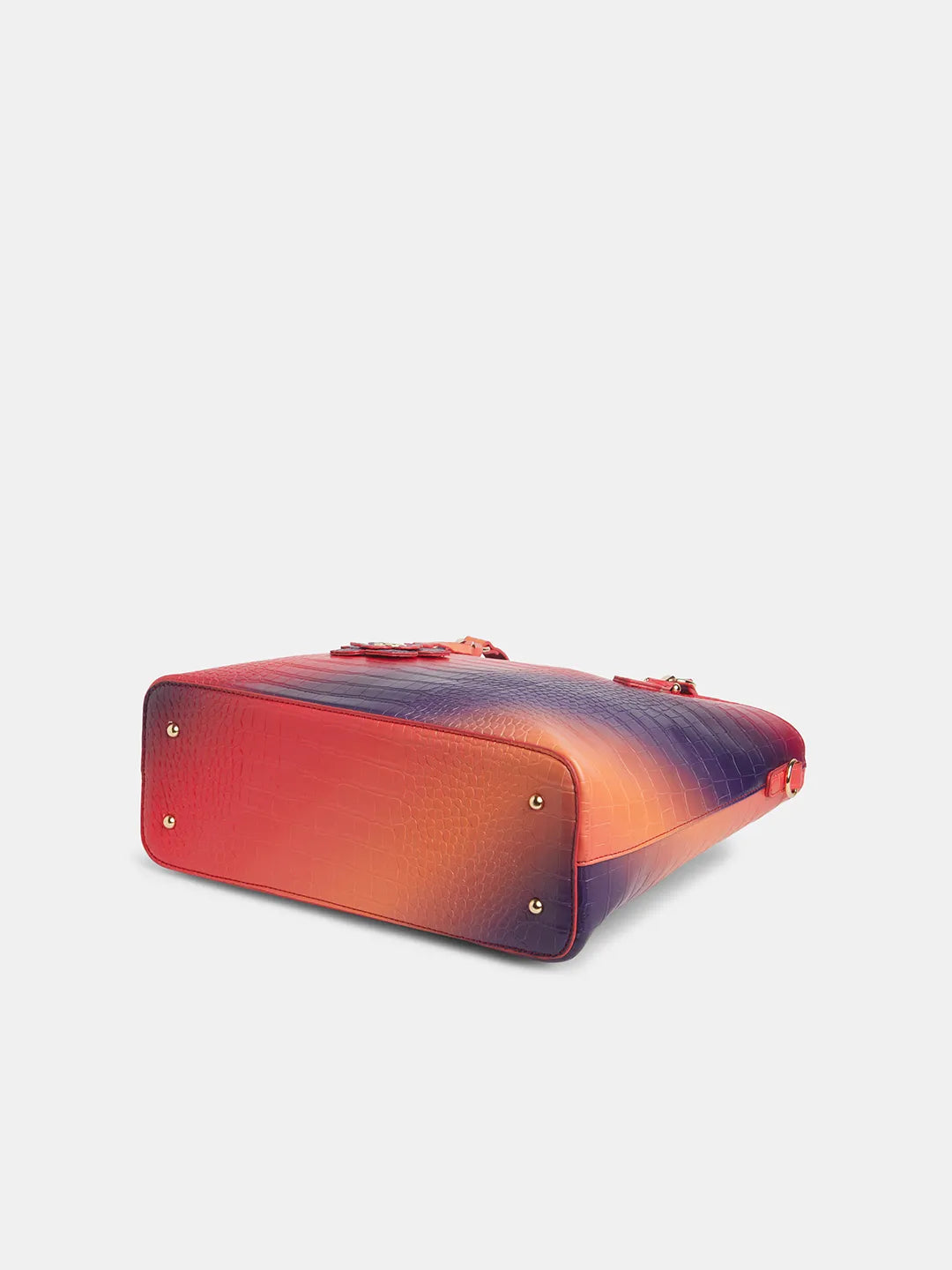 Make a vibrant fashion statement with the Caprese Marilyn Tote Large, a stunning blend of contemporary design and versatile functionality. This eye-catching handbag features a captivating multi-color ombre effect, transitioning beautifully through shades of orange, red, and purple, all enriched by a luxurious crocodile texture. Gold-tone hardware and a unique detachable Caprese flower charm, adorned with a gold "C" logo, add a touch of elegant sophistication.
