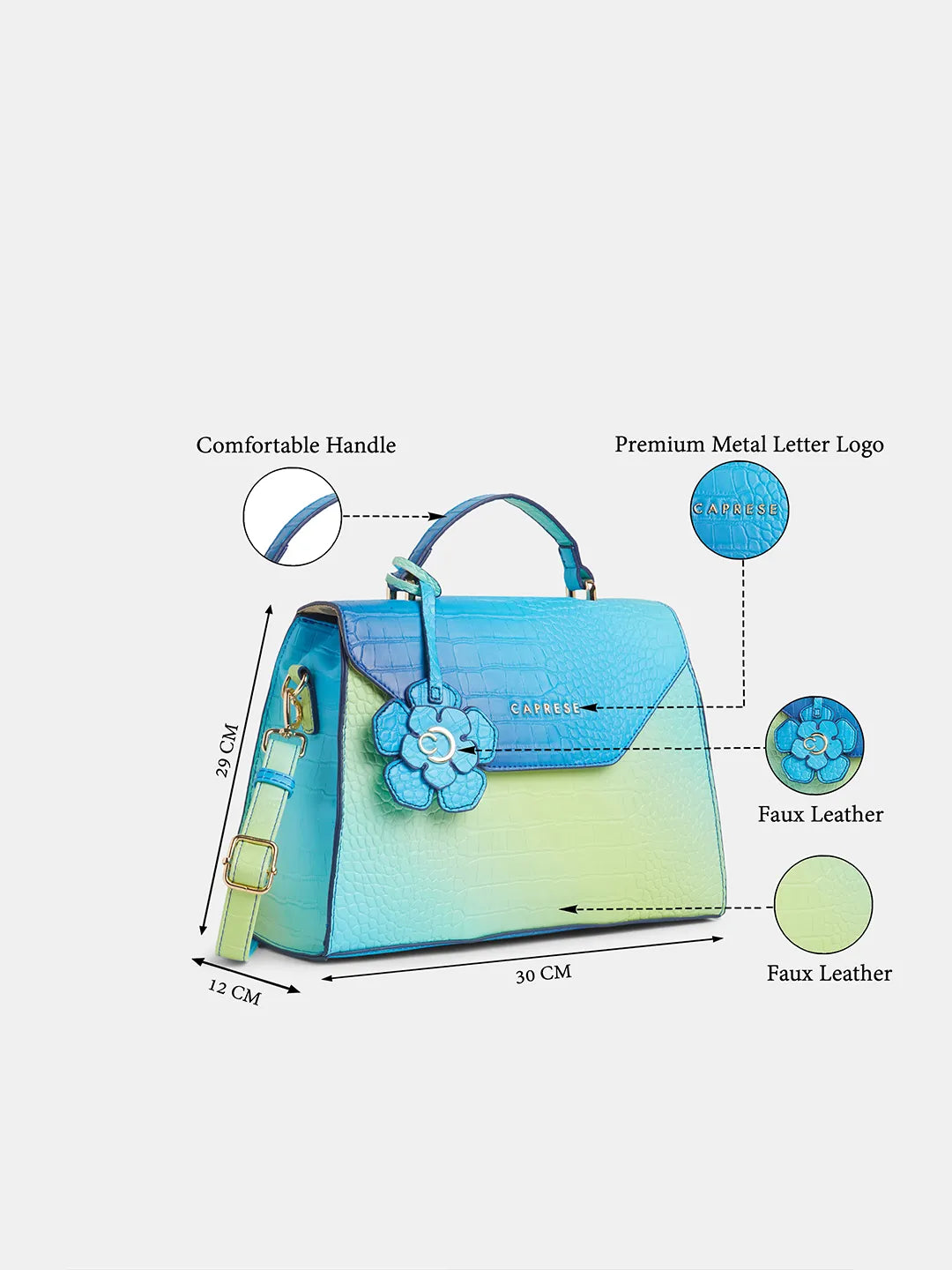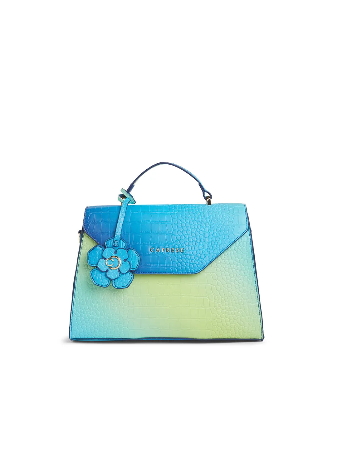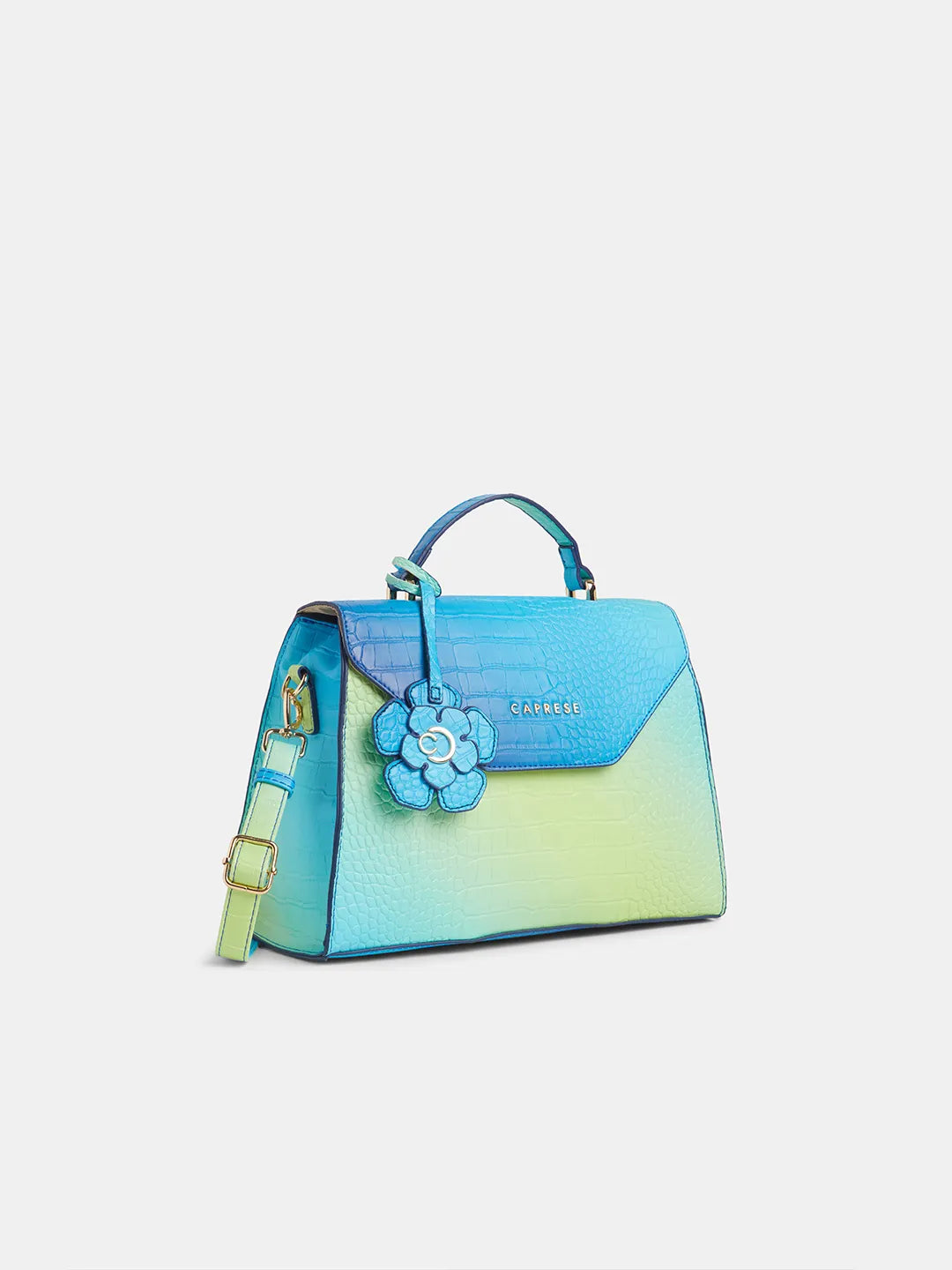 Add a refreshing pop of color to your ensemble with the Caprese Marilyn Satchel Small. This charming and sophisticated handbag features a captivating blue-to-green ombre effect, beautifully enhanced by a luxurious crocodile texture. Gold-tone hardware and a unique detachable Caprese flower charm, adorned with a gold "C" logo, add a touch of elegant flair.