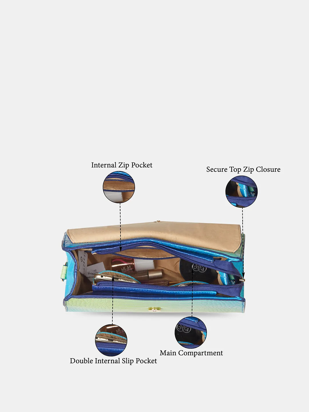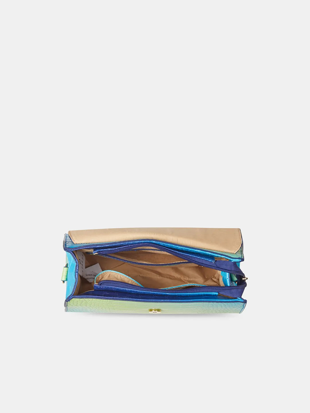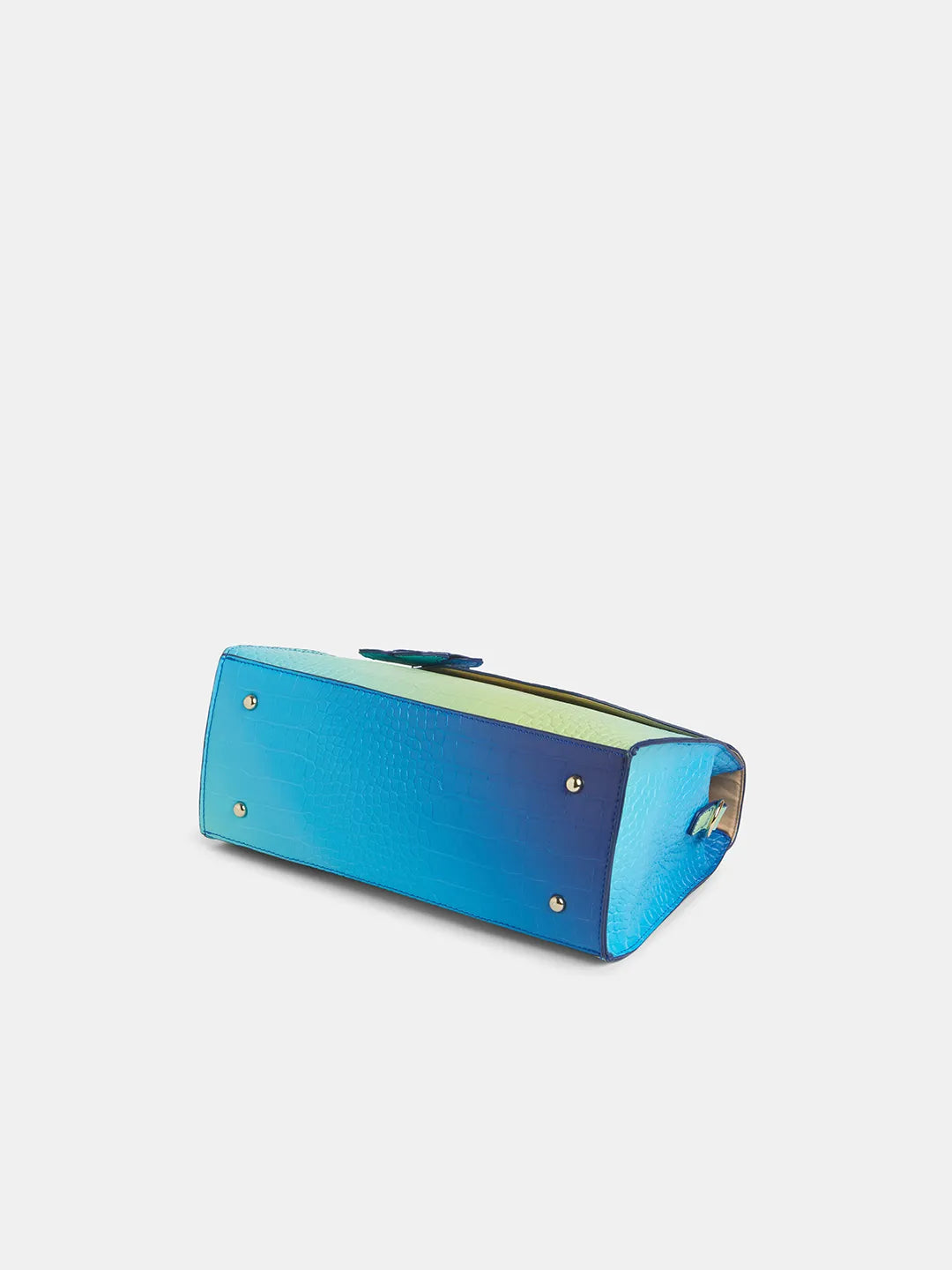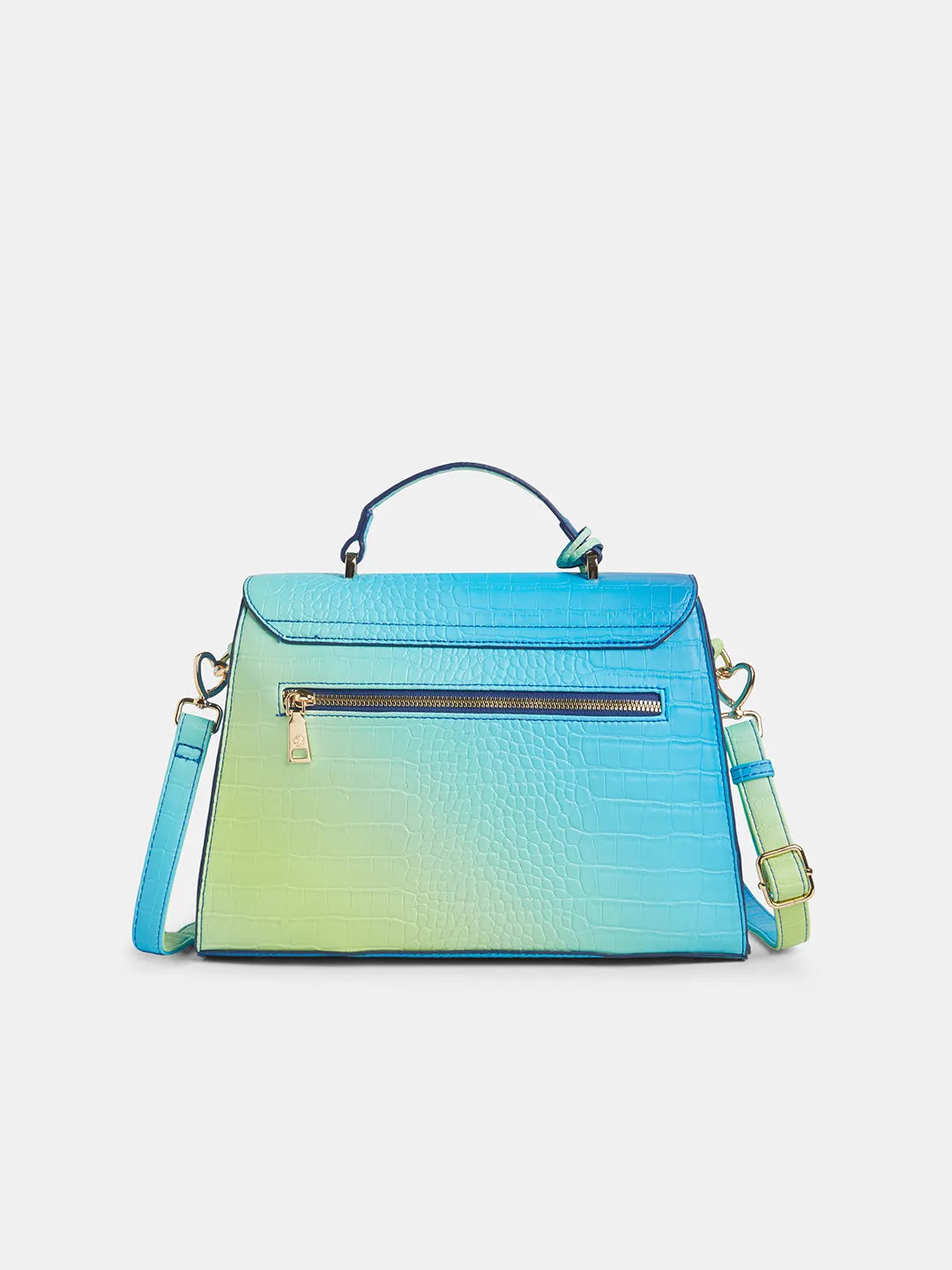 Add a refreshing pop of color to your ensemble with the Caprese Marilyn Satchel Small. This charming and sophisticated handbag features a captivating blue-to-green ombre effect, beautifully enhanced by a luxurious crocodile texture. Gold-tone hardware and a unique detachable Caprese flower charm, adorned with a gold "C" logo, add a touch of elegant flair.