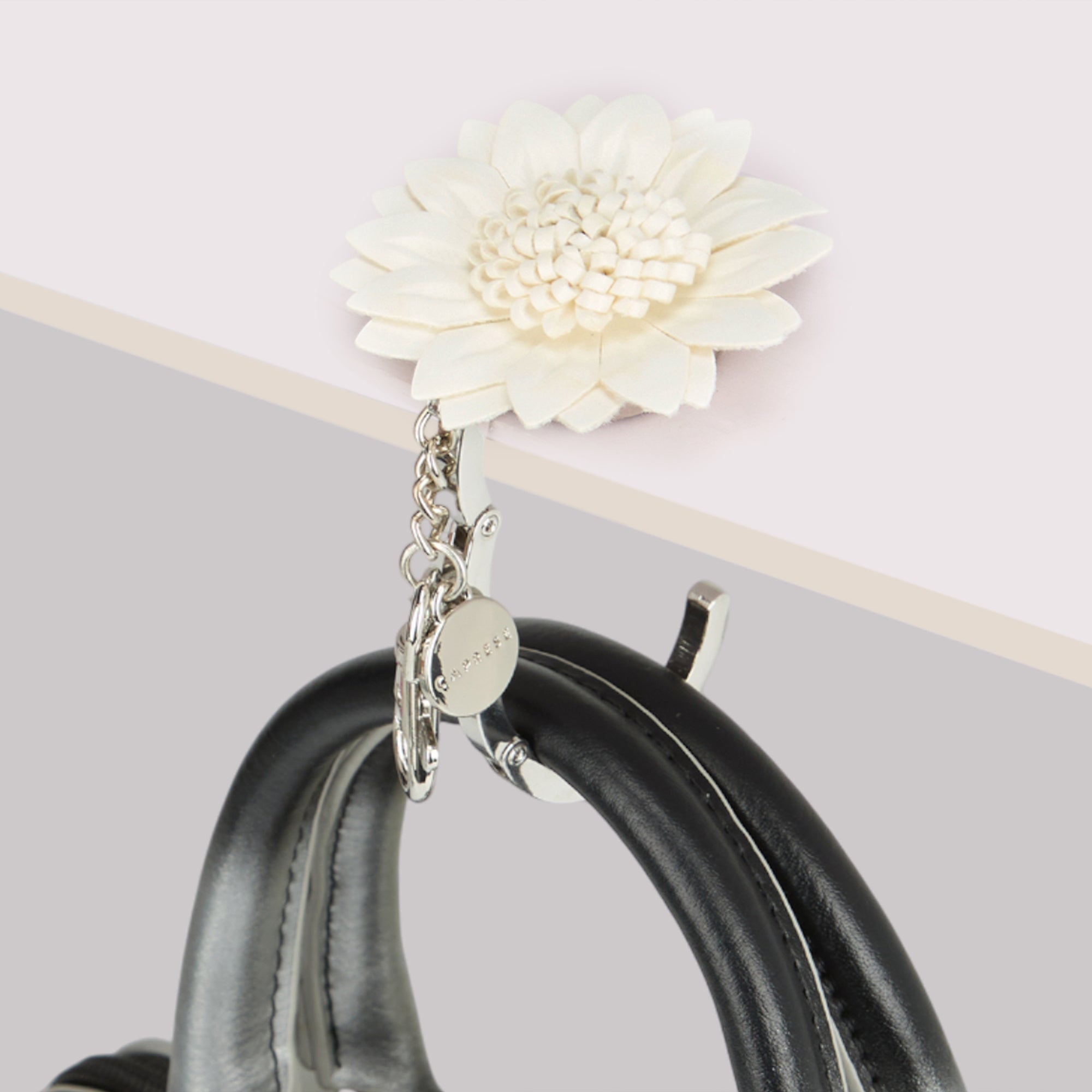2-in-1 Design: Stylish Bag Charm & Practical Purse Hook - Adorn your handbag with the elegant White Dahlia flower, then quickly convert it into a strong hook to hang your purse safely.