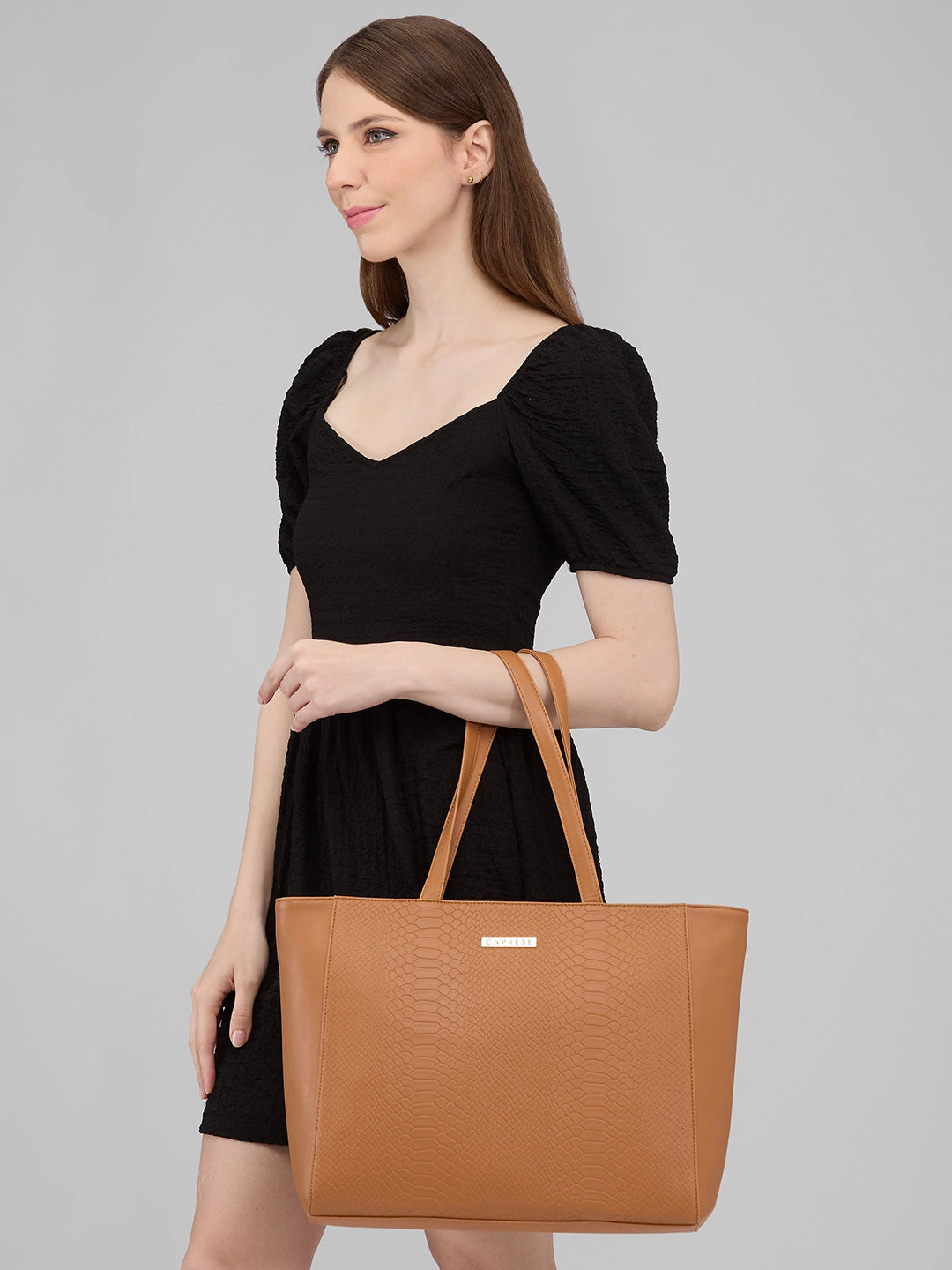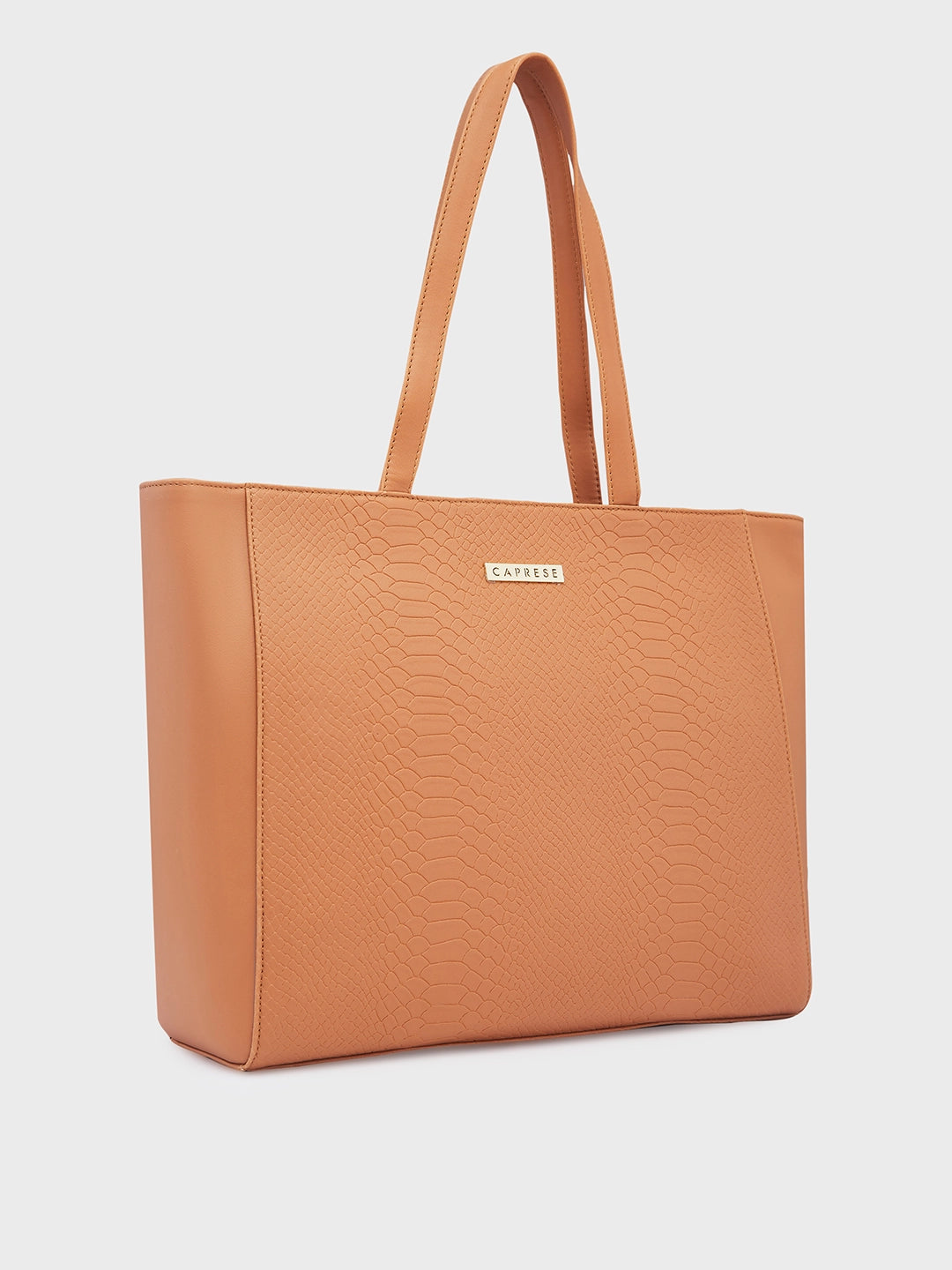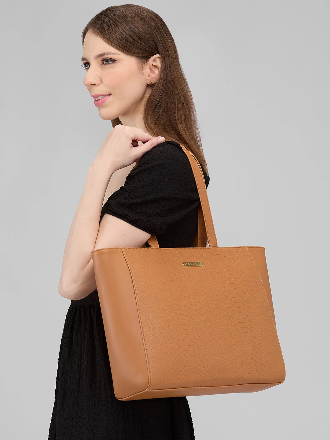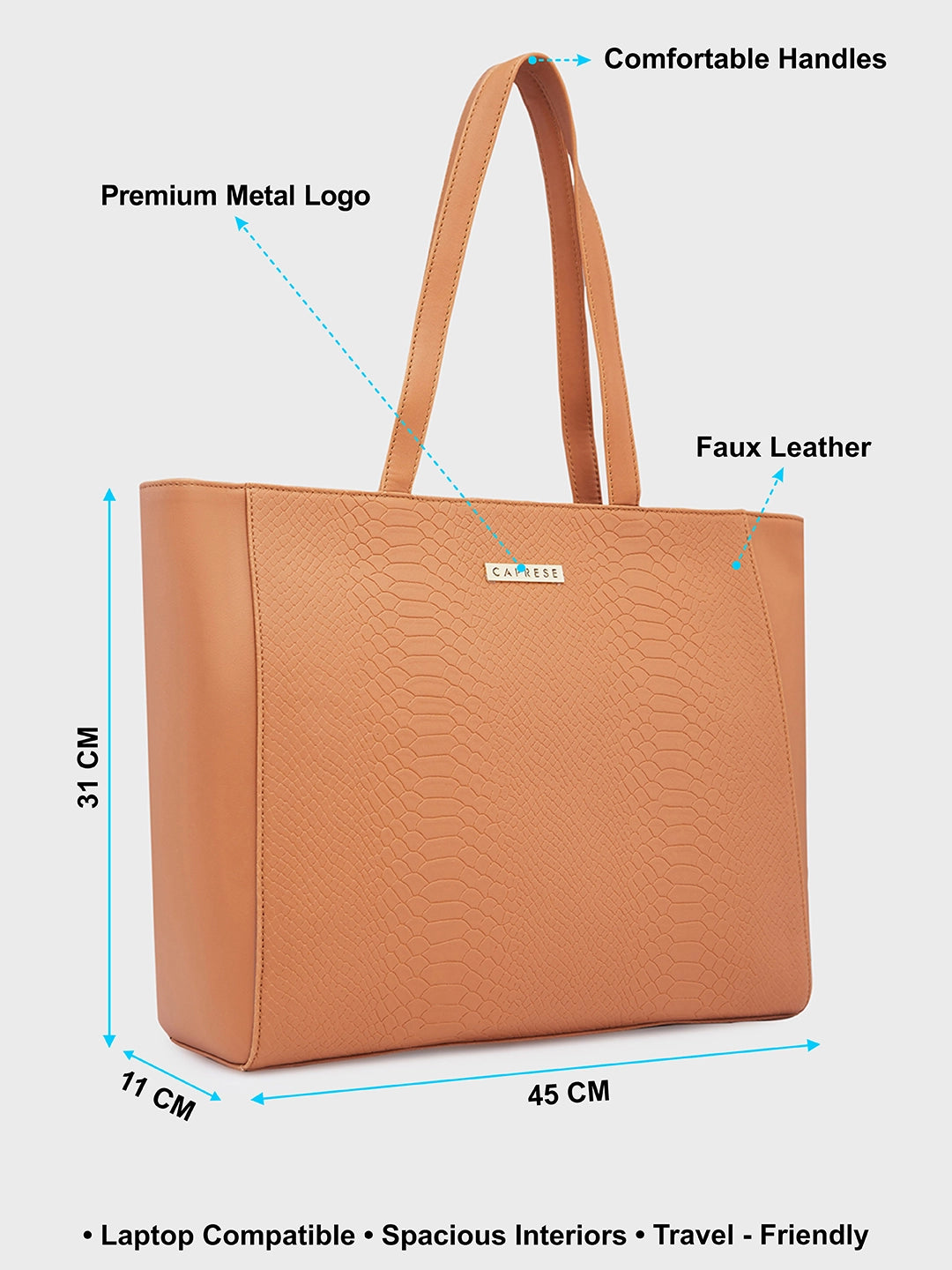 Introducing the Rina Laptop Tote Large Tan, a stylish laptop tote bag with a luxurious croco pattern finish. This spacious handbag features a convenient back zip for quick access to your essentials and comfortable shoulder handles, making it perfect for daily office use and beyond. Available in a bold, fresh color, the Rina Tote elevates your wardrobe while providing functionality. Designed for the modern woman, this tote combines elegance with practicality, making it an ideal choice for those who need a laptop bag for women that also serves as a chic handbag.
