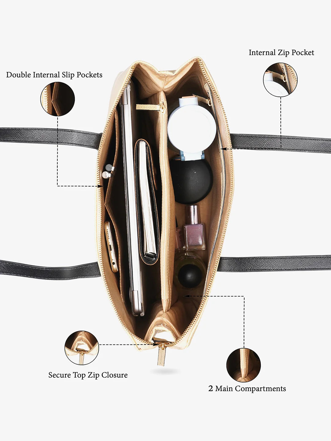 Travel with confidence using the smart sleeve feature of the Caprese Handbag. It securely holds your 15-inch laptop, making it a perfect laptop bag for women handbag. Ideal for travel, this feature enhances its functionality as a travel-friendly office bag or college bag.