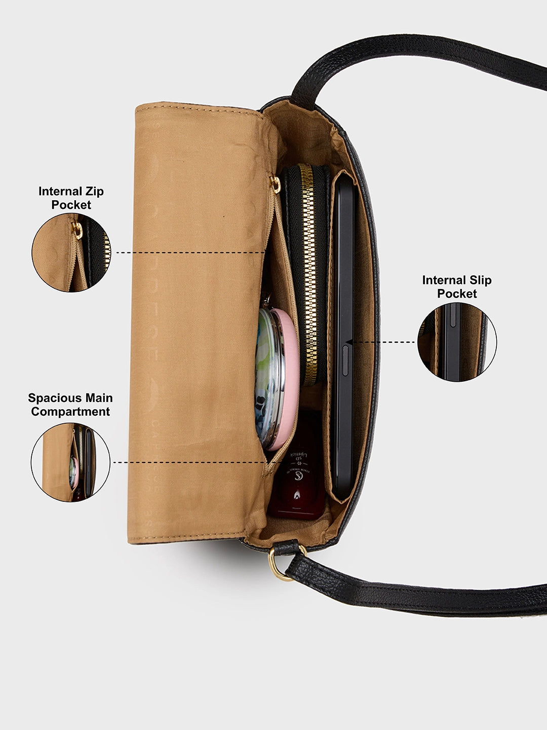 Meet the Romea Sling Small Black, a compact yet stylish sling bag designed for women who value both form and function. This sleek black sling bag features an adjustable strap for a custom fit and multiple compartments to keep your essentials organized. The magnetic flap closure and back zip ensure your belongings stay secure, making it ideal for daily use and travel.