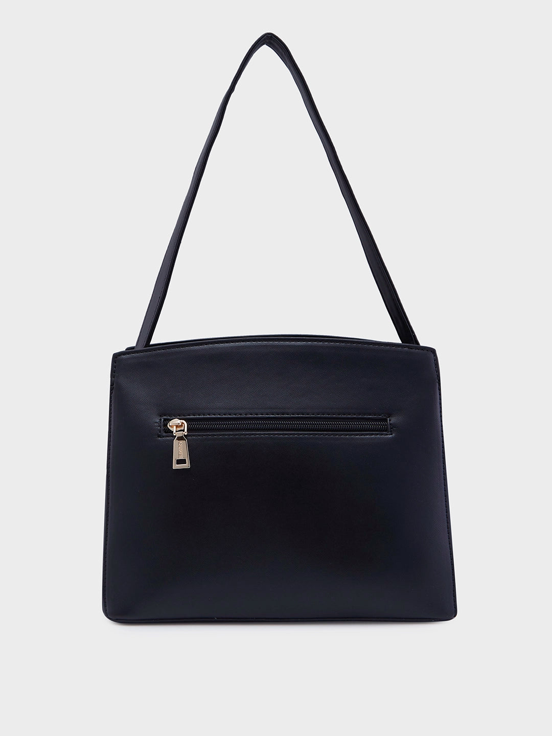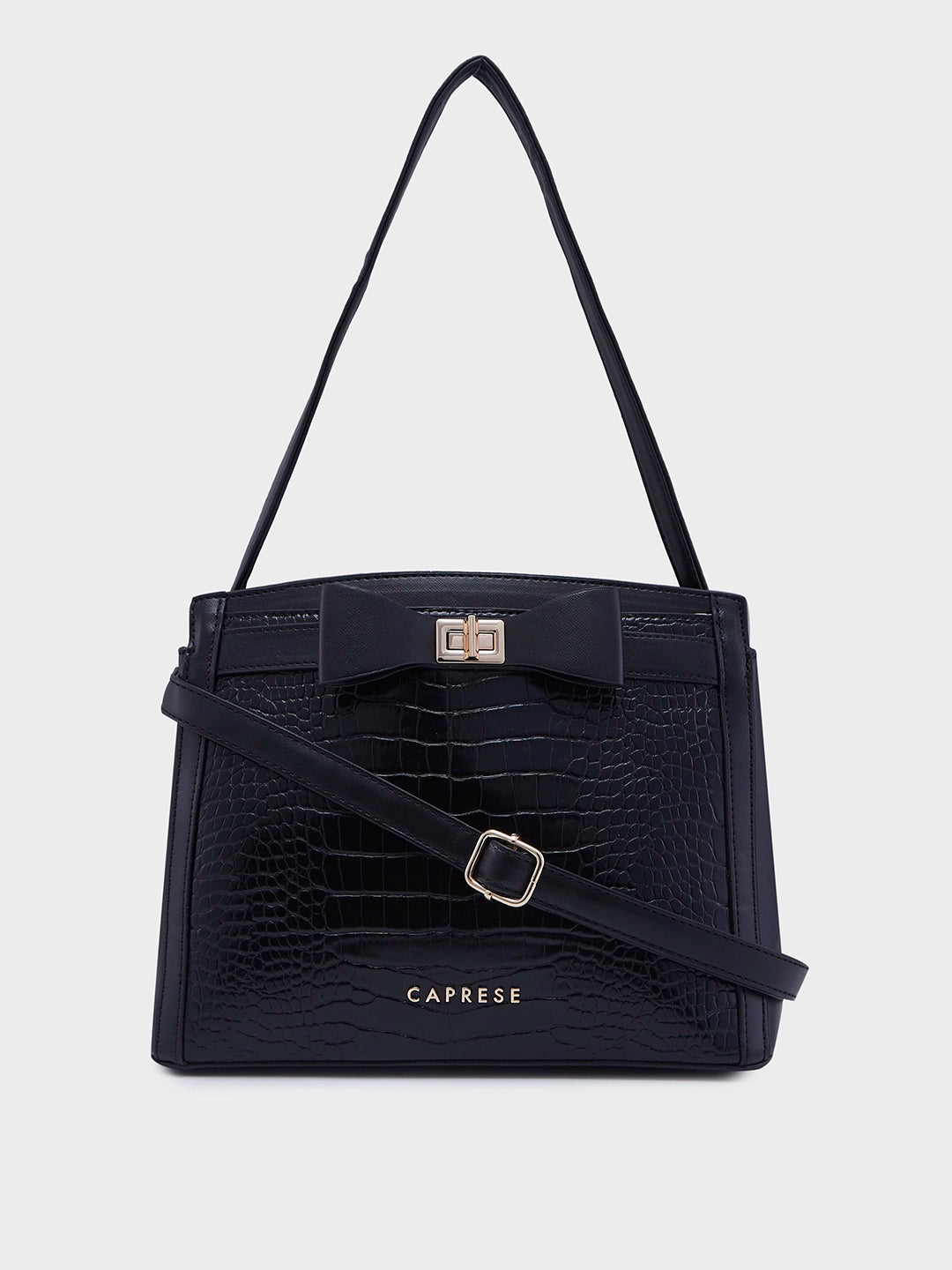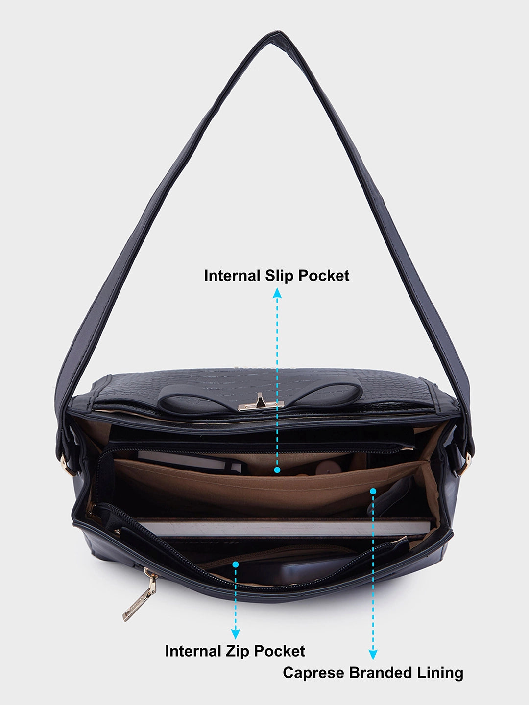 Introducing the Caprese Romita Hobo Handbag in Medium, a chic shoulder bag with a trendy new shape. This stylish hobo handbag features a spacious interior with a convenient back zip, perfect for keeping all your essentials organized. The bold black color adds a touch of sophistication to your outfit, making it ideal for office, daily use, and travel adventures. Combining elegance and functionality, this trendy handbag is designed to meet all your daily needs while ensuring you look chic and organized. Perfect for women seeking both style and practicality.