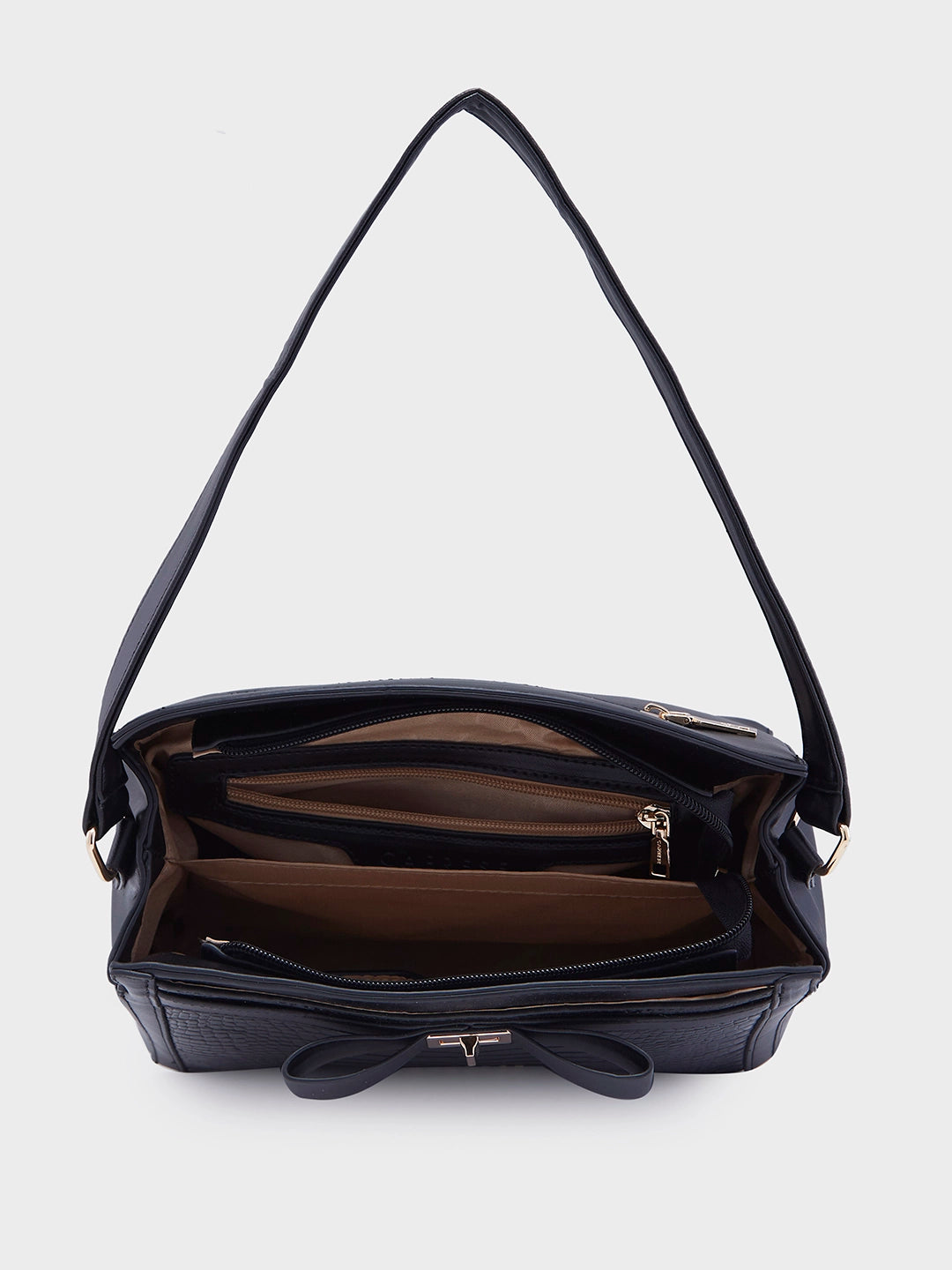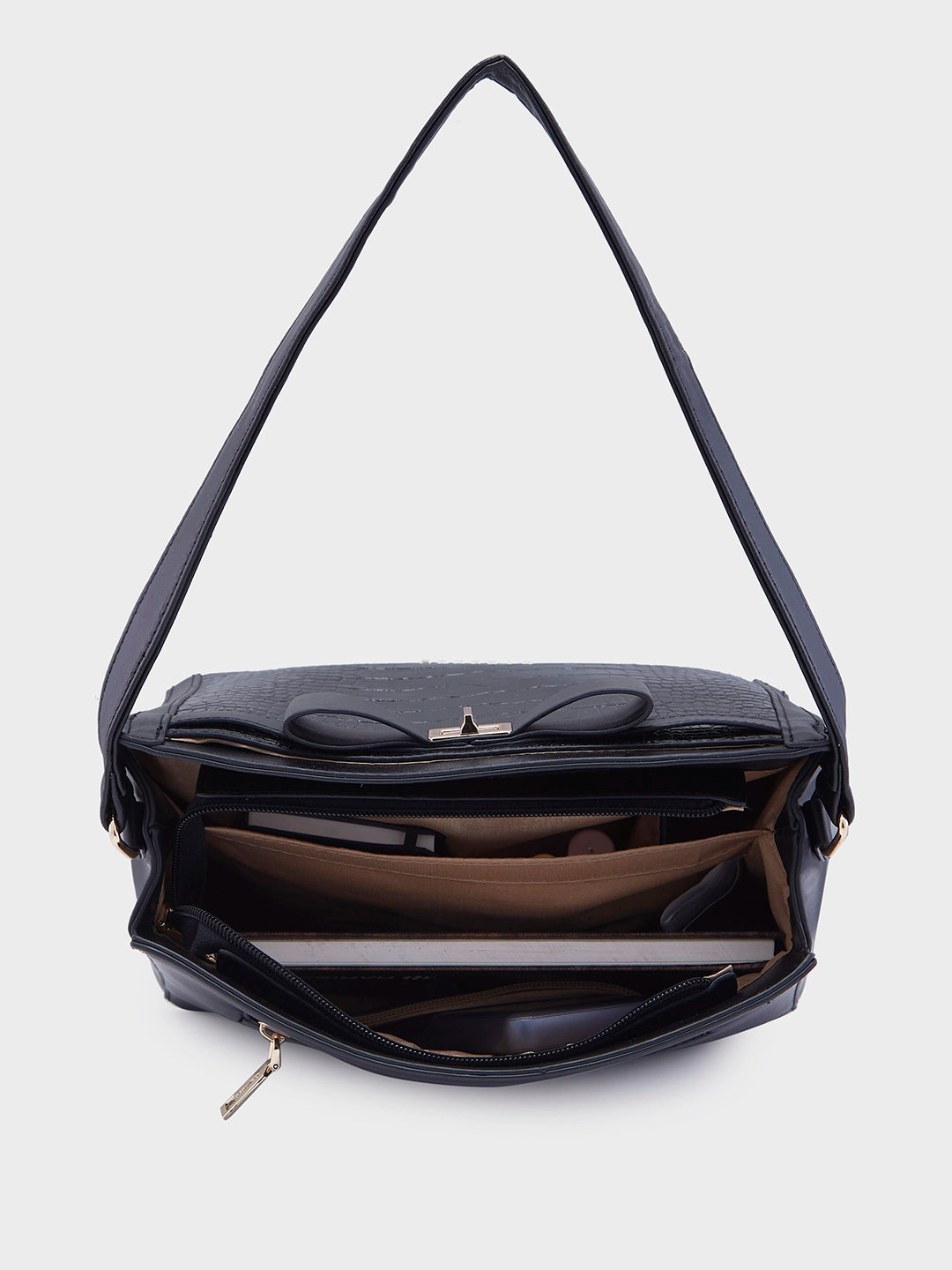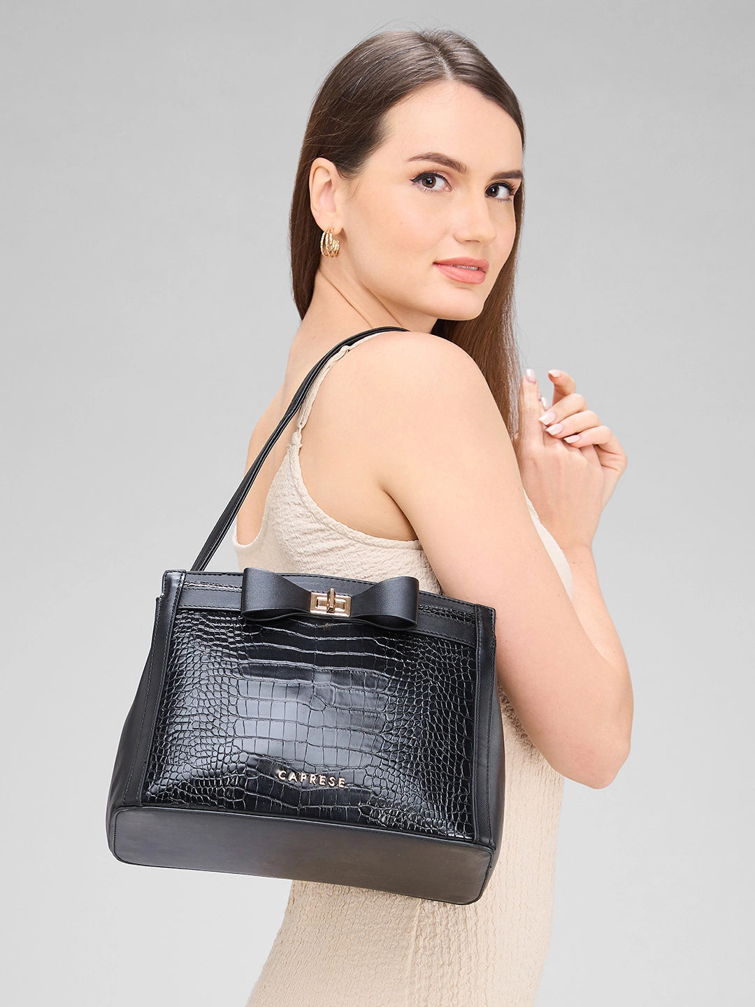 Introducing the Caprese Romita Hobo Handbag in Medium, a chic shoulder bag with a trendy new shape. This stylish hobo handbag features a spacious interior with a convenient back zip, perfect for keeping all your essentials organized. The bold black color adds a touch of sophistication to your outfit, making it ideal for office, daily use, and travel adventures. Combining elegance and functionality, this trendy handbag is designed to meet all your daily needs while ensuring you look chic and organized. Perfect for women seeking both style and practicality.