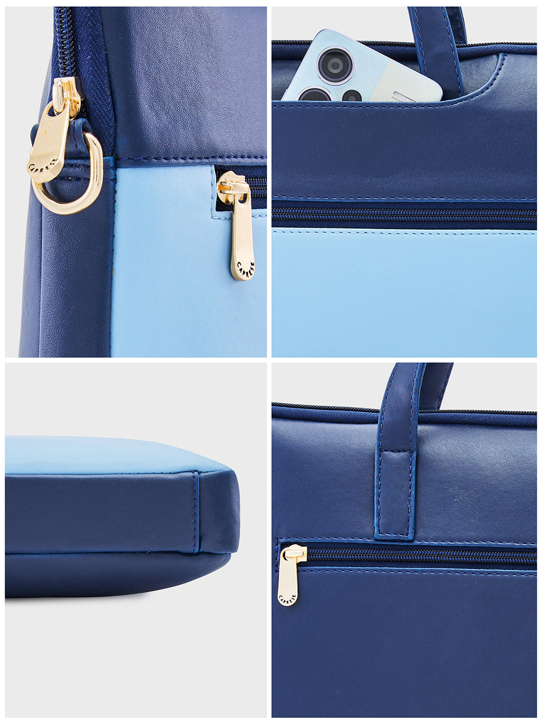 Introducing the Caprese Ryma Laptop Bag Medium Blue & Navy, a stylish and functional laptop handbag designed for women. Featuring a smart sleeve for convenient travel and an easy access back zip, this bag is perfect for work and travel. With multiple pockets and a spacious interior, it easily fits a 16-inch laptop and all your essentials. The detachable adjustable strap and dual color effect add a touch of style to your daily routine, making it an ideal choice for any occasion.