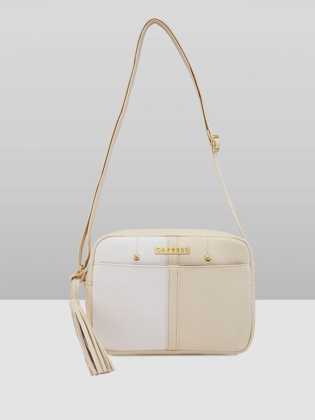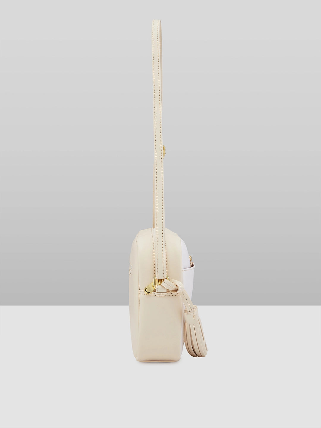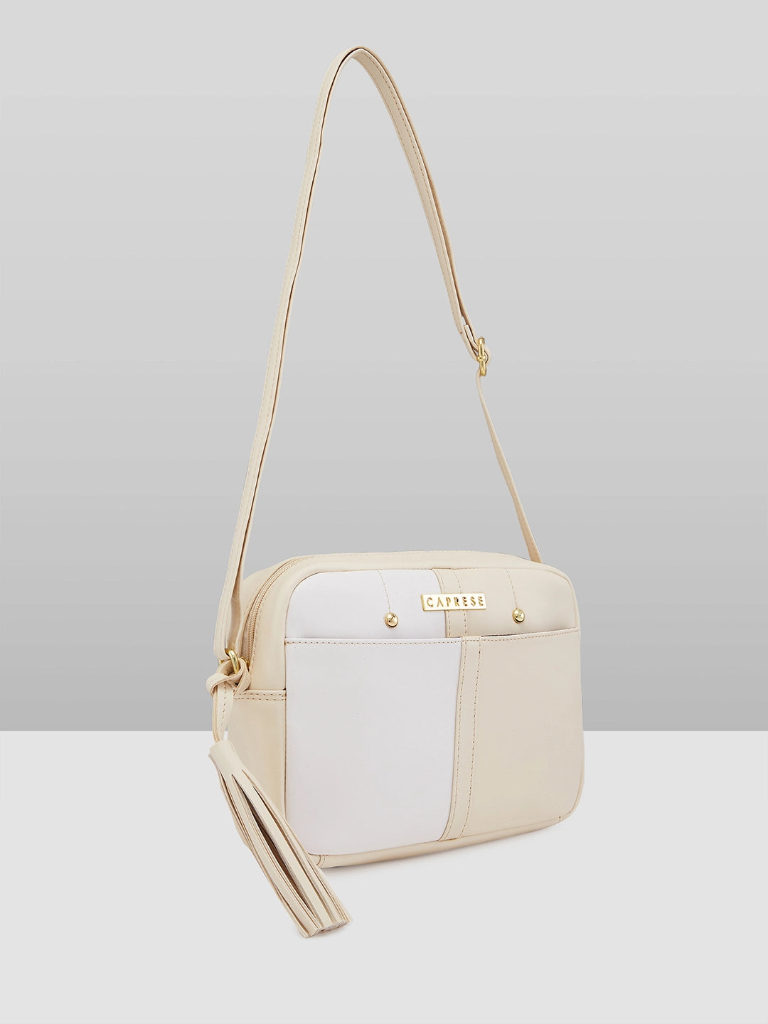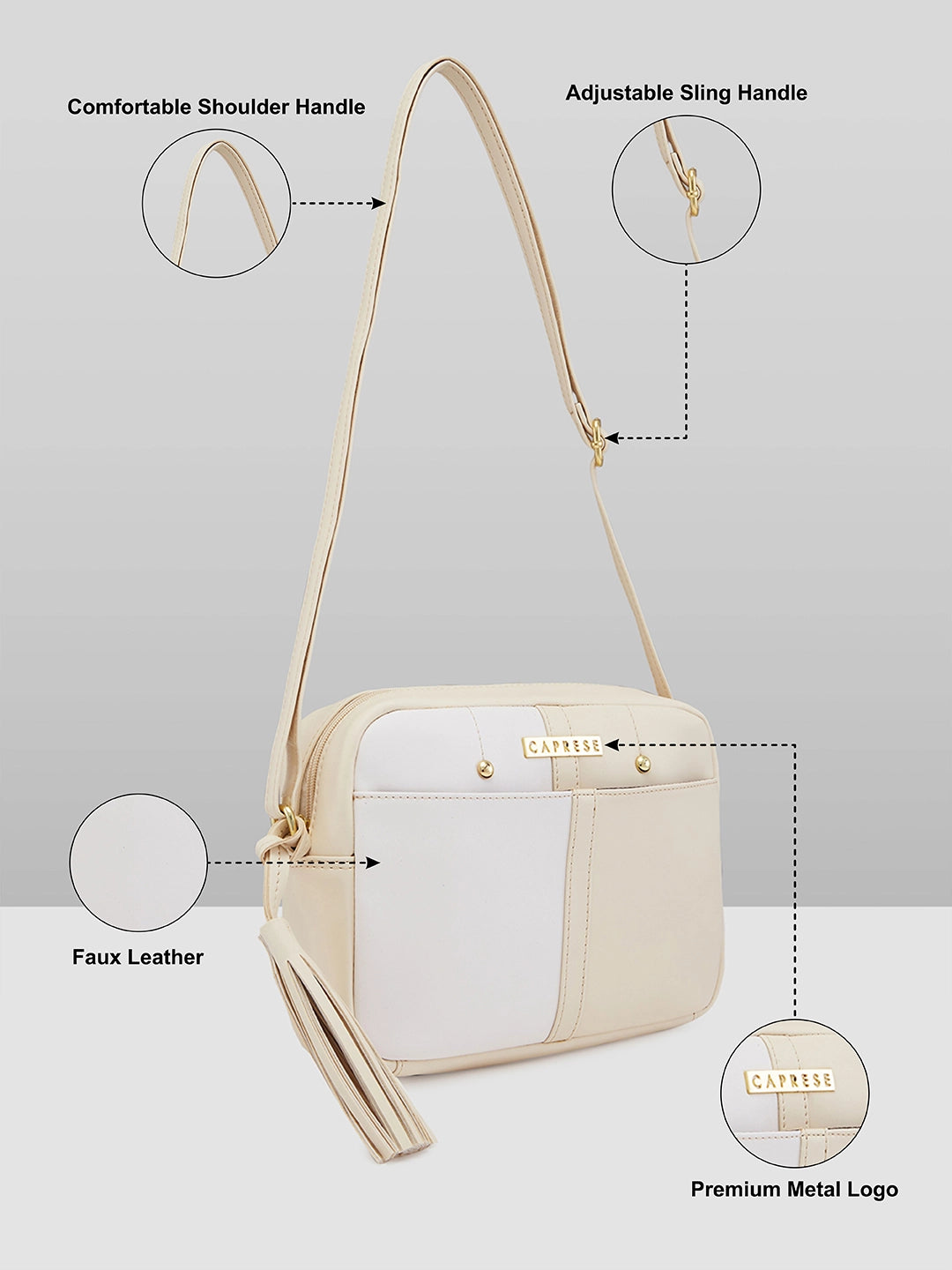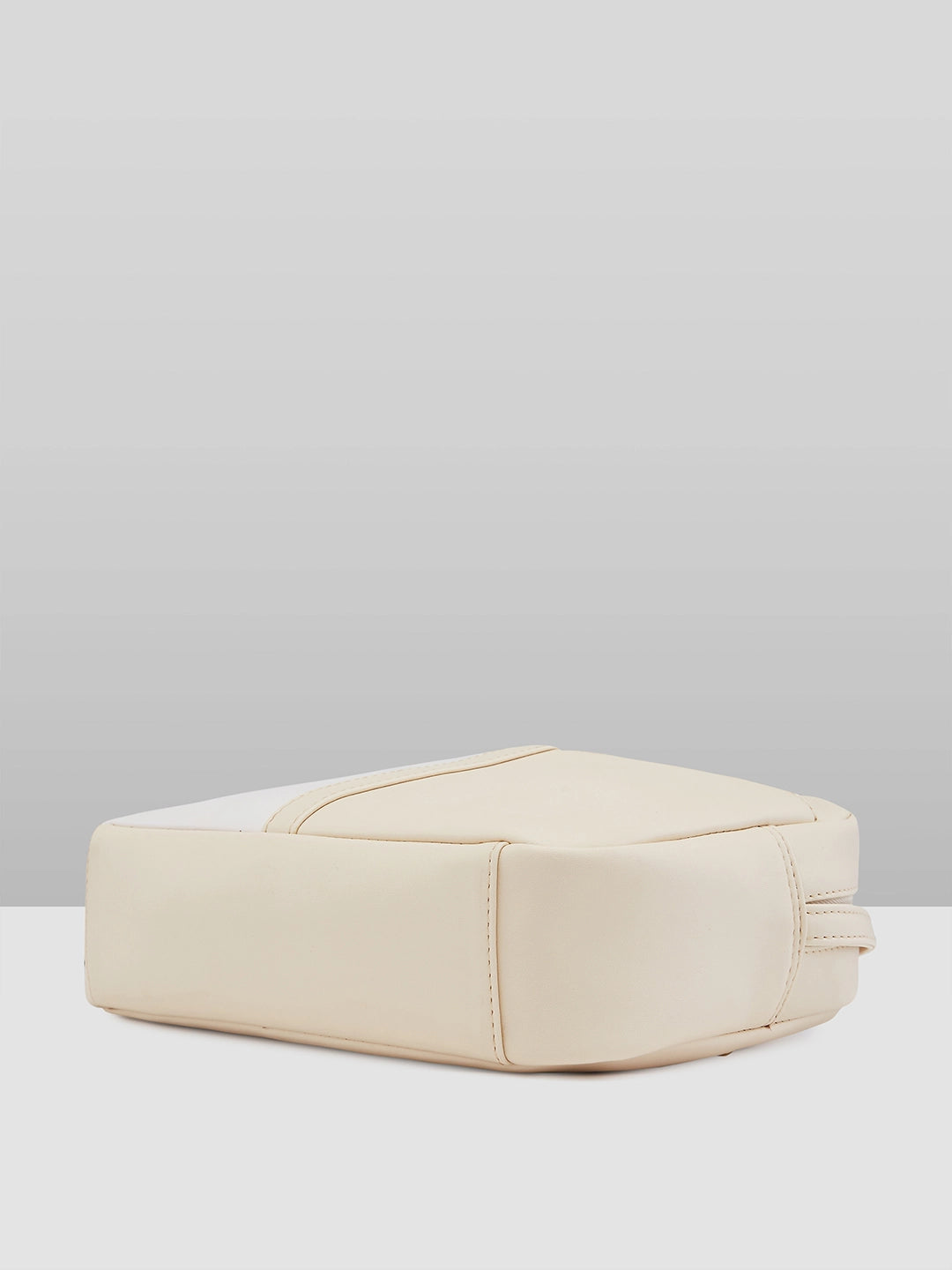 Discover the Sabreen Sling Small White & Beige, a sophisticated dual-color crossbody bag with a trendy front slip pocket. Featuring an adjustable sling strap and back zip, this small bag offers stylish organization for all your essentials. Perfect for women who appreciate a blend of elegance and practicality, this chic sling bag adds a touch of refinement to any outfit.