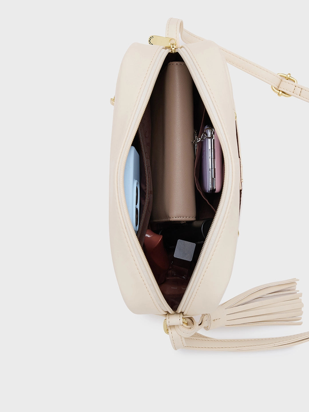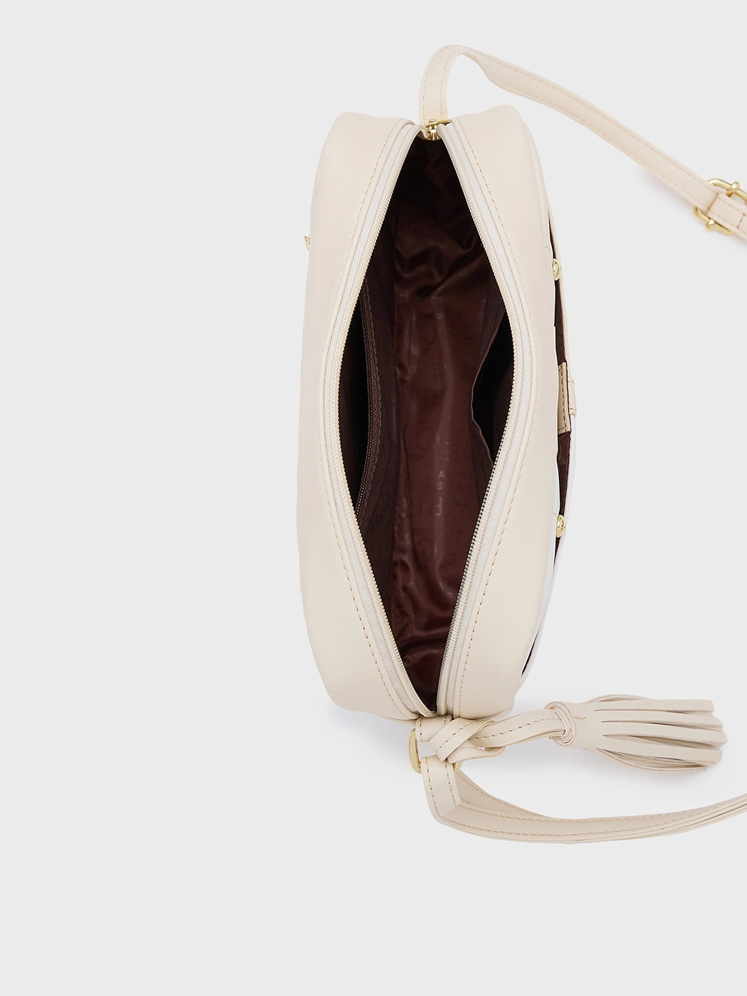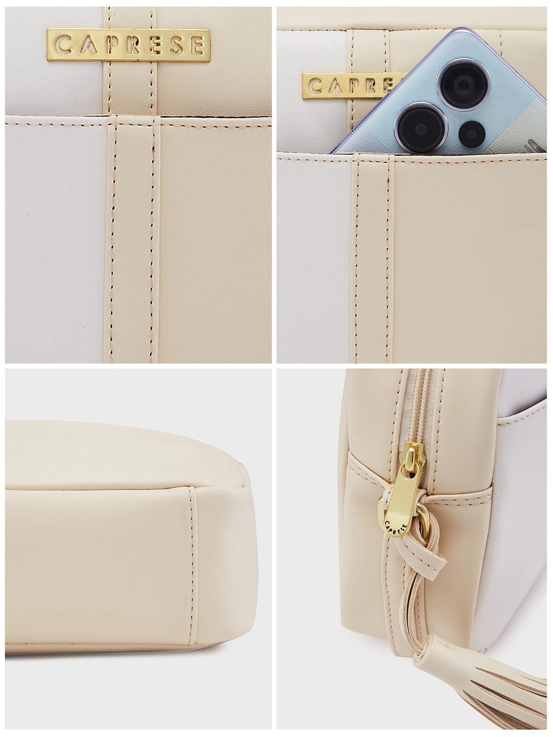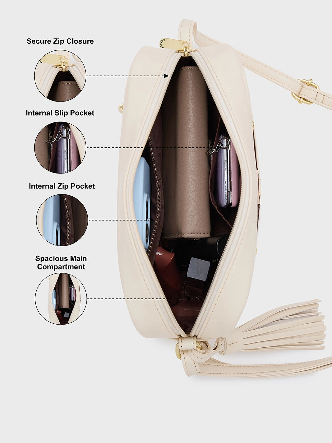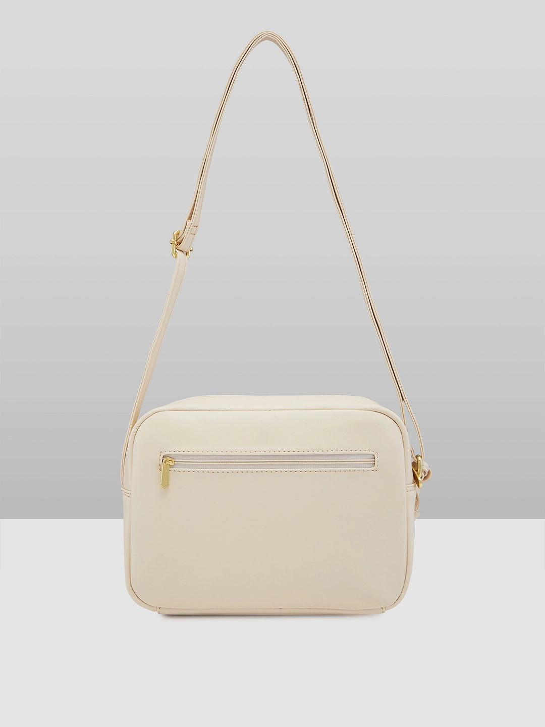Discover the Sabreen Sling Small White & Beige, a sophisticated dual-color crossbody bag with a trendy front slip pocket. Featuring an adjustable sling strap and back zip, this small bag offers stylish organization for all your essentials. Perfect for women who appreciate a blend of elegance and practicality, this chic sling bag adds a touch of refinement to any outfit.