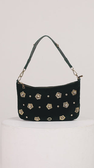 Elevate your style for any celebration with the Caprese Festive Velvet Hobo Bag. Crafted from luxurious velvet, this eye-catching bag is adorned with exquisite decorative metal flowers, adding a touch of glamour to your ensemble.