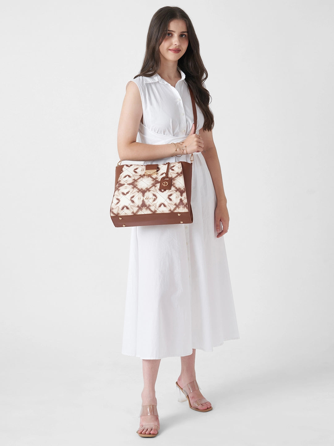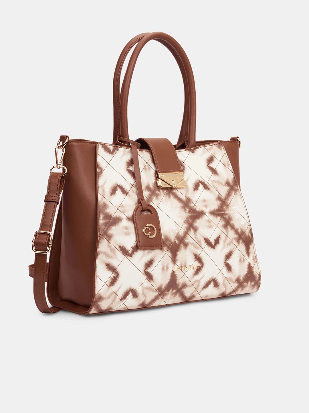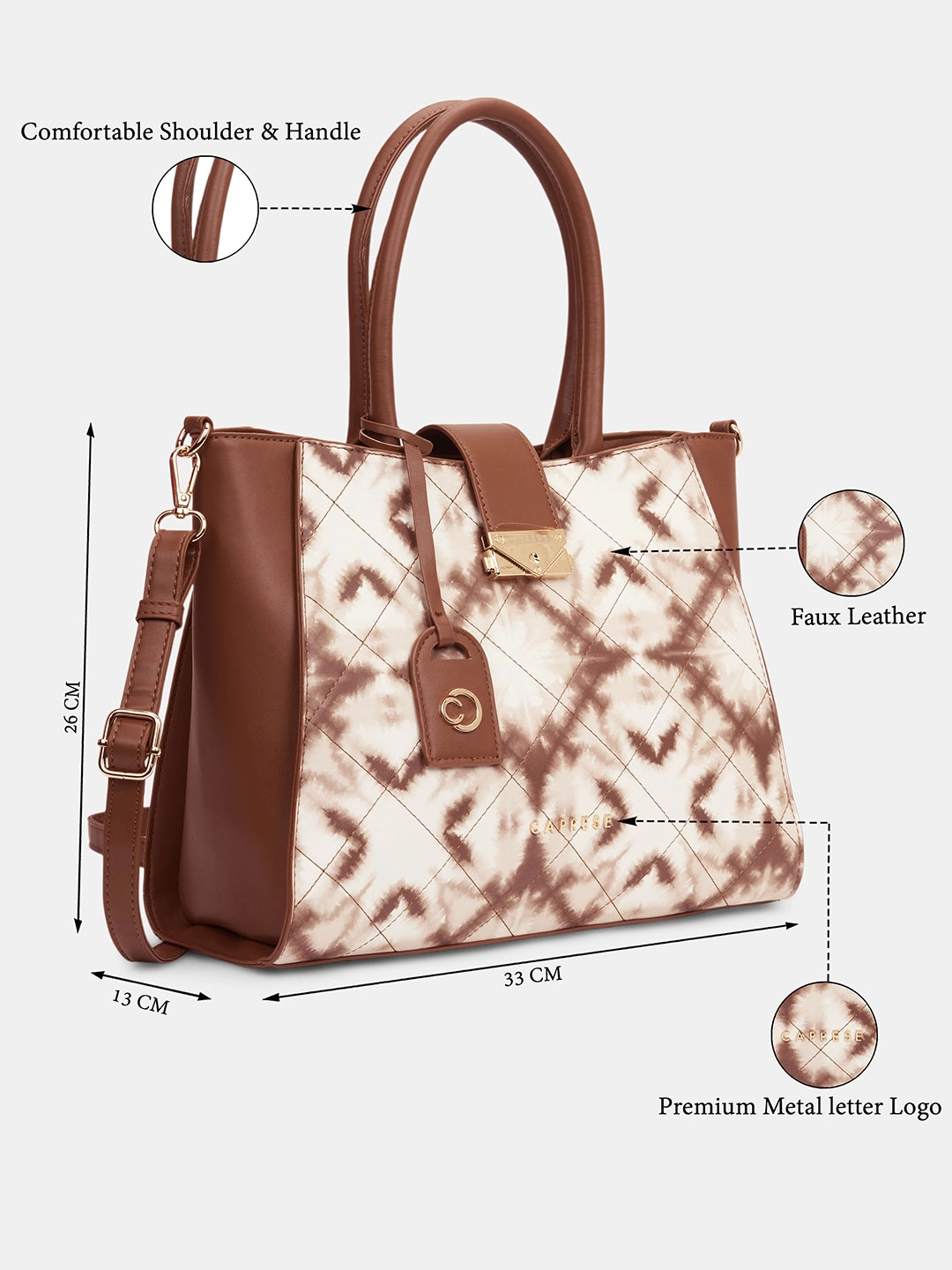 Upgrade your everyday style with the Caprese Shibori Large Satchel, crafted from premium printed faux leather for a chic and durable finish. This spacious satchel features multiple compartments to neatly organize your wallet, phone, keys, makeup, and other essentials. The adjustable and detachable strap allows versatile shoulder or crossbody carrying, while the zipper closure ensures your belongings remain secure. Complete with a detachable Caprese charm, this satchel is perfect for office, shopping, casual outings, and travel, combining fashion, function, and playful elegance.
