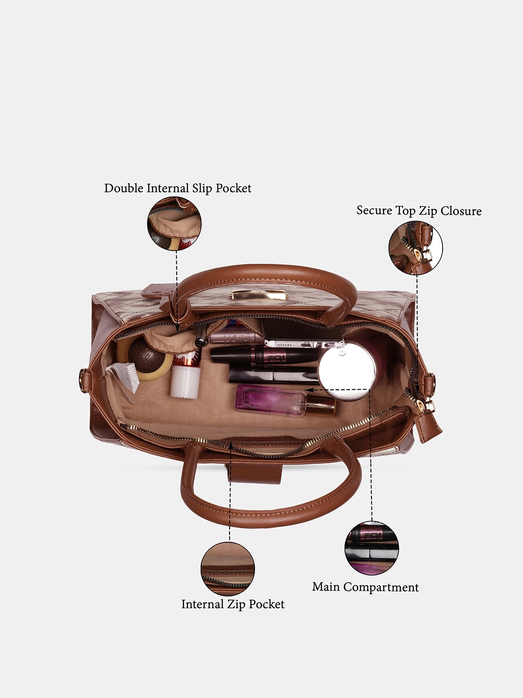 Multi-Compartment Design: Keeps wallet, phone, keys, makeup, and other essentials organized.