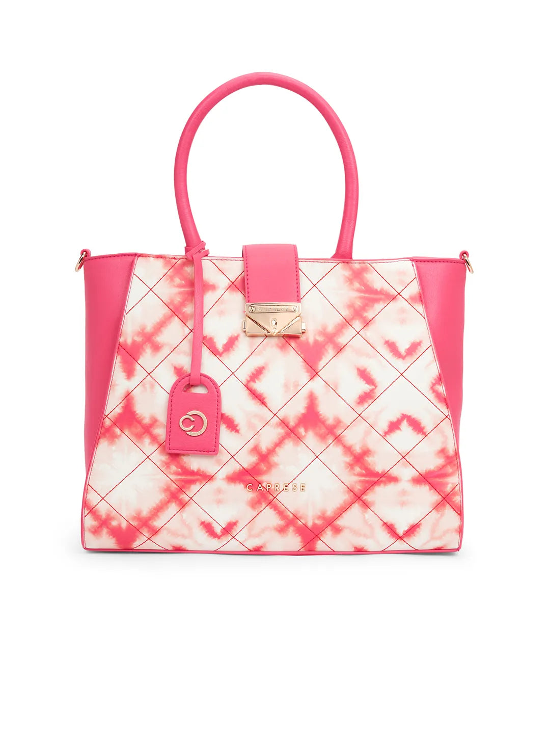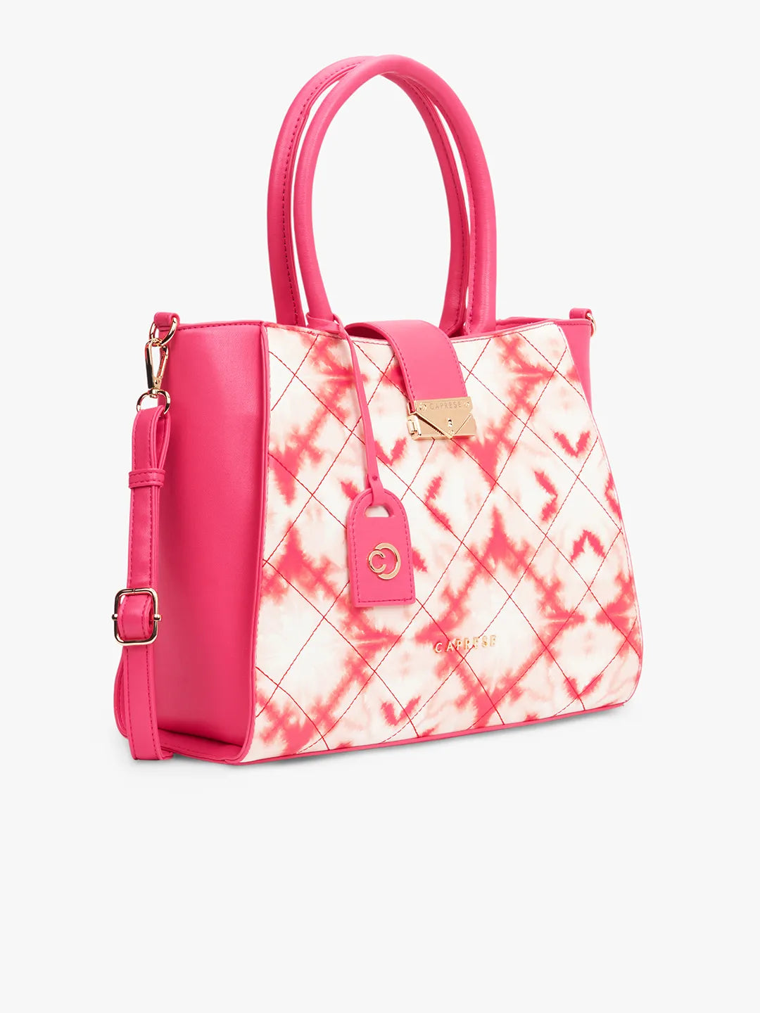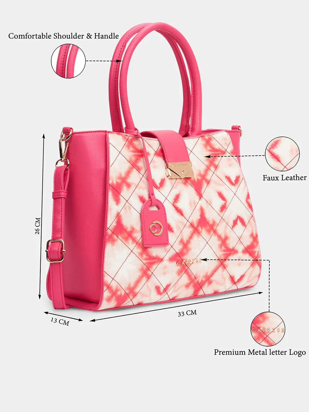 Upgrade your everyday style with the Caprese Shibori Large Satchel, crafted from premium printed faux leather for a chic and durable finish. This spacious satchel features multiple compartments to neatly organize your wallet, phone, keys, makeup, and other essentials. The adjustable and detachable strap allows versatile shoulder or crossbody carrying, while the zipper closure ensures your belongings remain secure. Complete with a detachable Caprese charm, this satchel is perfect for office, shopping, casual outings, and travel, combining fashion, function, and playful elegance.