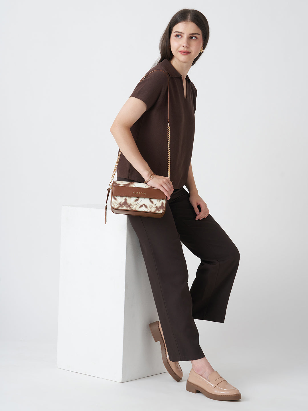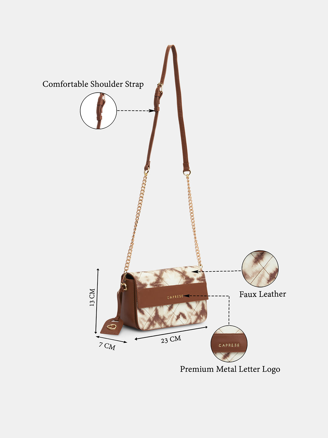 Step out in style with the Caprese Shibori Medium Sling, crafted from premium printed faux leather for a chic and durable finish. Featuring multiple compartments, this sling bag keeps your essentials like wallet, phone, keys, and makeup perfectly organized. The adjustable and detachable strap offers versatile shoulder or crossbody carrying, while the zipper and magnetic button closure ensures your belongings stay secure. Complete with a detachable Caprese charm, this sling bag is ideal for casual outings, shopping, travel, and daily use, combining fashion, convenience, and elegance.