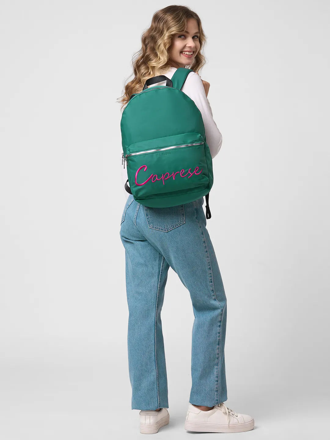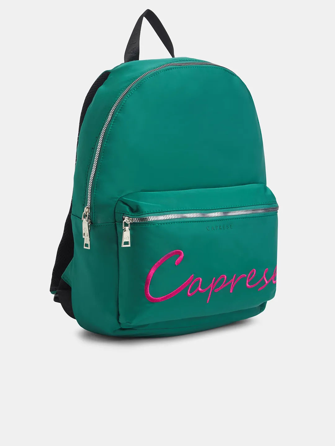Elevate your everyday style with the Caprese Venus Laptop Backpack, a statement piece that blends modern design with smart functionality. This large, dark green backpack features a bold, contrasting color block accent on the front, highlighting the signature Caprese logo and adding a distinct touch of flair. Its spacious design is tailored to accommodate all your daily essentials, including a laptop, making it a versatile accessory for the modern professional or student.